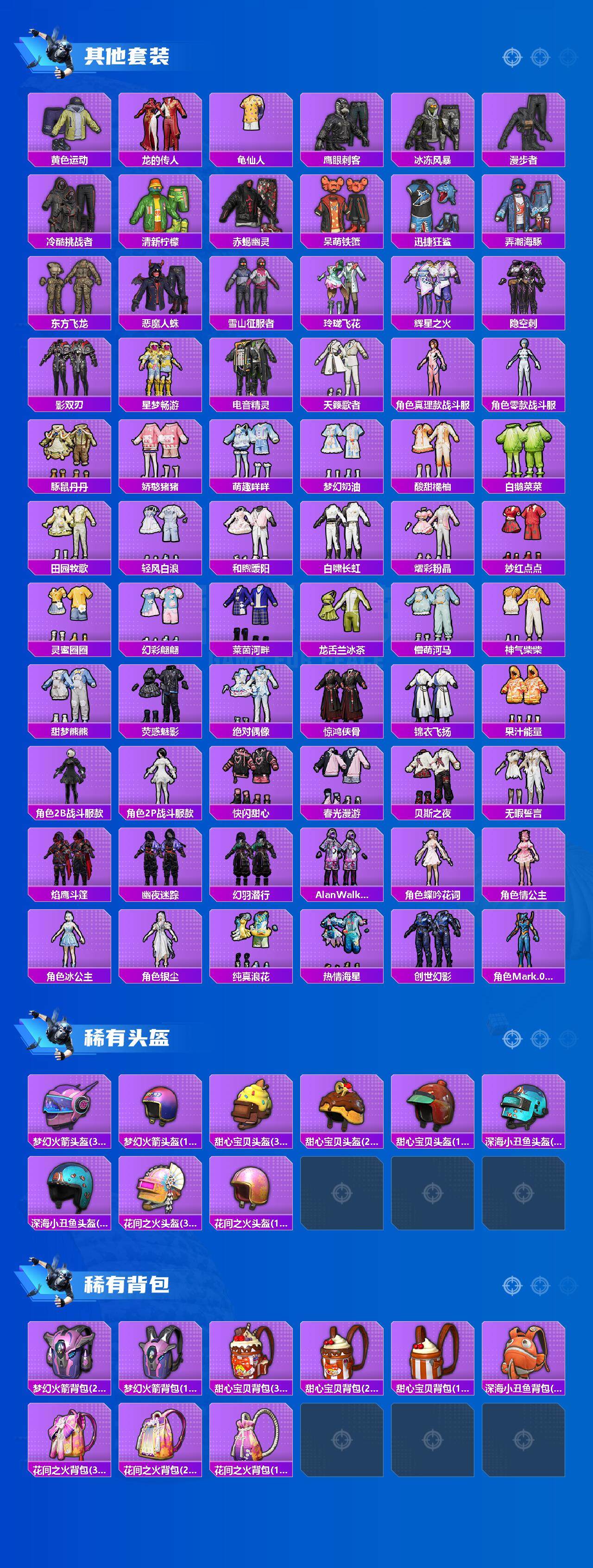 套装-浪漫天命,套装-龟仙人,套装-暗影哥特,角色-Mark.06,套装-极速红龙,套装-狂沙舞者,套装-破蛋小黄鸡,套装-漫步者,套装-弄潮海豚,套装-恶魔人蛛,套装-影双刃,套装-豚鼠丹丹