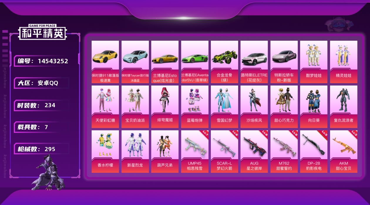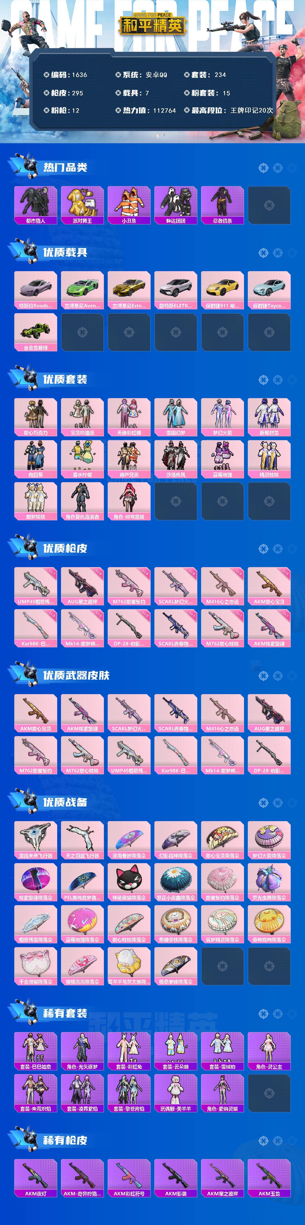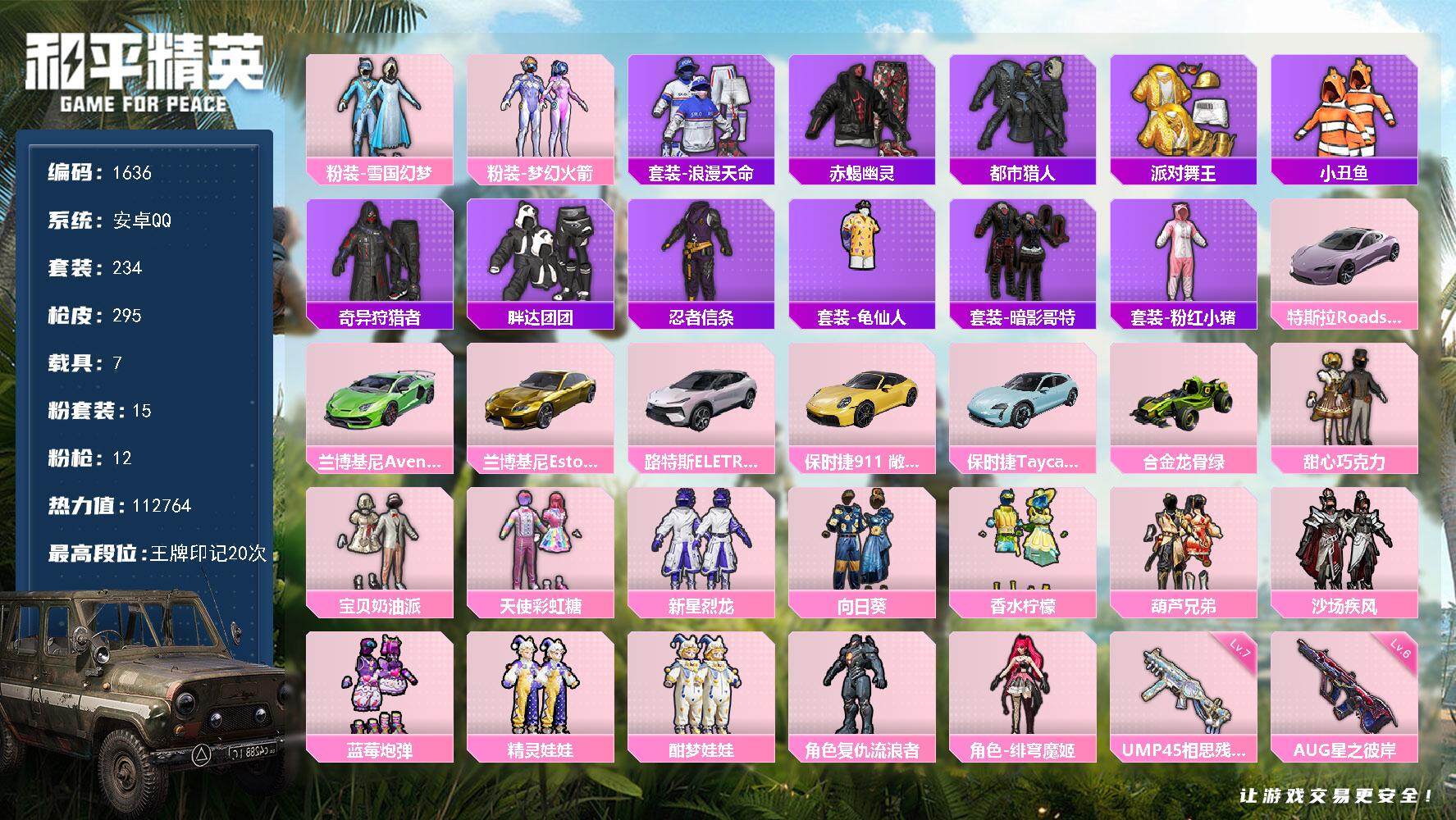 [14543252]安卓 手Q-15粉装-12特效枪-7载具-2粉色飞行器-112764热力值-20王牌印记-234套装-295枪皮 【热门品类】:粉装-雪国幻梦,粉装-梦幻火箭,套装-浪漫天命,套装-赤蝎幽灵,套装-都市猎人,套装-派对舞王,套装-小丑鱼,套装-奇异狩猎者,套装-胖达团团,套装-忍者信条,套装-龟仙人,套装-暗影哥特,套装-粉红小猪 【粉色载具】:特斯拉Roadster(沁心粉),兰博基尼Aventador SVJ(翡翠绿),兰博基尼Estoque(炫光金),路特斯ELETRE(花绽灰),保时捷911 敞篷版(极速黄),保时捷Taycan 旅行版(冰晶蓝),合金龙骨(绿) 【粉色套装】:粉装-甜心巧克力,粉装-宝贝奶油派,粉装-天使彩虹糖,粉装-雪国幻梦,粉装-梦幻火箭,粉装-新星烈龙,粉装-向日葵,粉装-香水柠檬,粉装-葫芦兄弟,粉装-沙场疾风,粉装-蓝莓炮弹,粉装-精灵娃娃,粉装-酣梦娃娃,角色-复仇流浪者,角色-绯穹魔姬 【粉色枪皮等级】:AKM-甜心宝贝(五级),AKM-炫紫旋律(一级),SCAR-L-梦幻火箭(六级),SCAR-L-青春物语(一级),M416-心之恋语(五级),AUG-星之彼岸(六级),M762-甜蜜誓约(六级),M762-甜心娃娃(一级),UMP45-相思残雪(七级),Kar98K-巳巳如意(五级),Mk14-甜梦熊击(五级),DP-28-豹影疾电(五级) 【粉色枪皮】:AKM-甜心宝贝,AKM-炫紫旋律,SCAR-L-梦幻火箭,SCAR-L-青春物语,M416-心之恋语,AUG-星之彼岸,M762-甜蜜誓约,M762-甜心娃娃,UMP45-相思残雪,Kar98K-巳巳如意,Mk14-甜梦熊击,DP-28-豹影疾电 【粉色飞行器】:激战未来飞行器,天之羽翼飞行器 【粉色降落伞】:深海曼妙降落伞,幻影战神降落伞,甜心宝贝降落伞,梦幻火箭降落伞,炫紫旋律降落伞,PEL轰鸣竞梦者降落伞,神秘黑猫降落伞,繁花小夜曲降落伞,甜蜜誓约降落伞,荧光虫舞降落伞,相思残雪降落伞,蓝莓炮弹降落伞,甜心娃娃降落伞,焦糖拿铁降落伞,筑梦精灵降落伞,垂柳戏鸭降落伞,千金淑猫降落伞,樱桃泡泡降落伞,喜羊羊与灰太狼降落伞,极意拳锋降落伞 【稀有套装】:套装-龟仙人,套装-巳巳如意,角色-光矢逐梦,套装-彩虹兔,套装-云朵鹅,套装-雪绒豹,角色-灵公主,套装-朱霞炽焰,