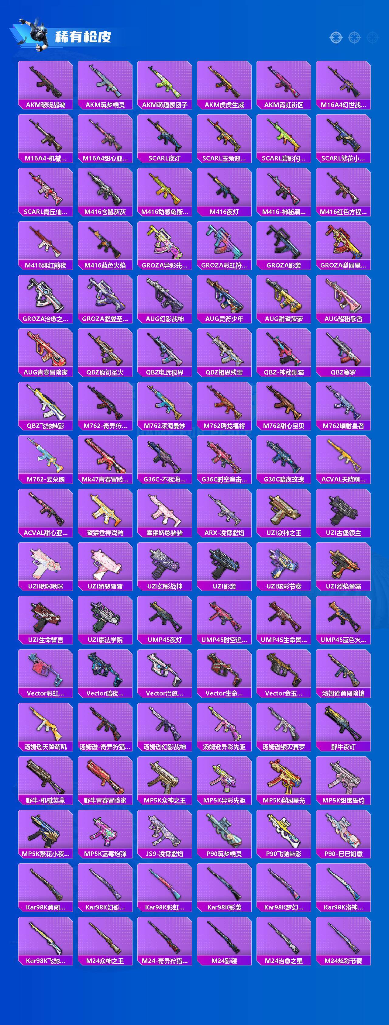 AKM-甜心宝贝,AKM-炫紫旋律,SCAR-L-梦幻火箭,SCAR-L-青春物语,M416-心之恋语,AUG-星之彼岸,M762-甜蜜誓约,M762-甜心娃娃,UMP45-相思残雪,Kar98K-巳巳如意