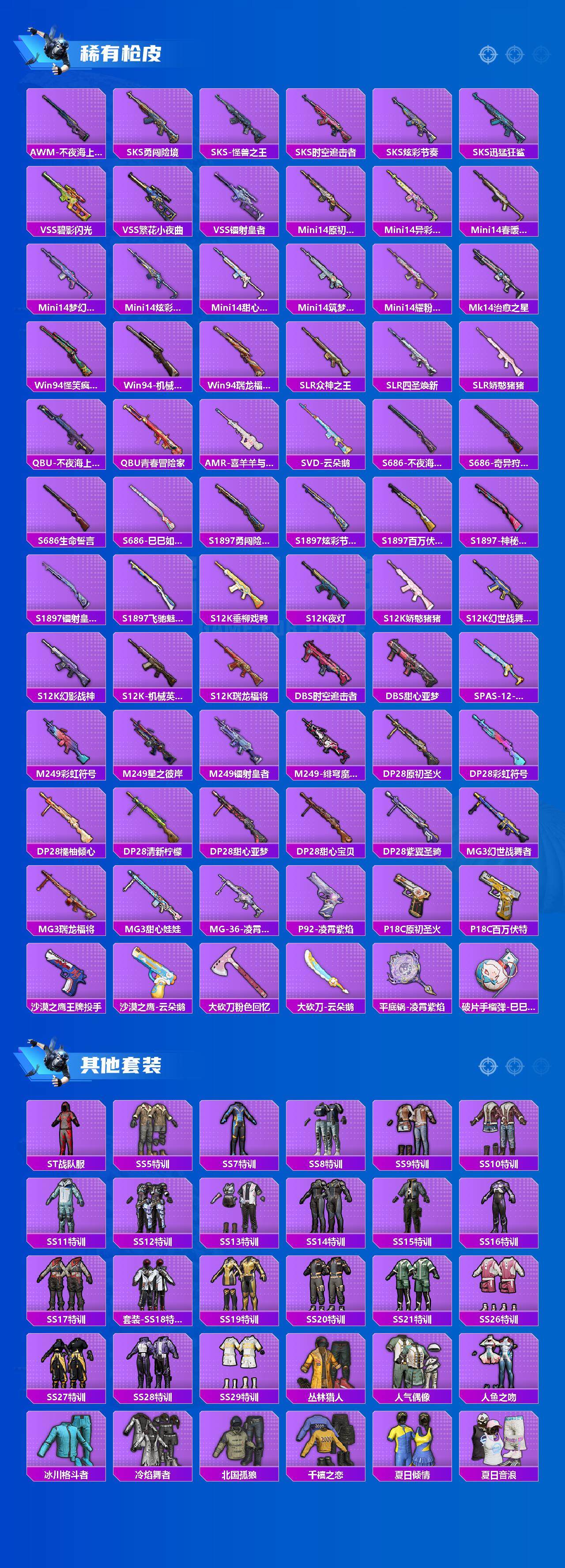 - [11680782]6粉装 2特效枪 2载具 4印记 可二次 可修改实名 优质装备:玛莎拉蒂Ghibli(粉),特斯拉Model X(珍珠白),AKM炫紫旋律,M416五爪金龙,天启纪元,土曜战麒,金曜白虎,智能音符,香水柠檬,天禅智恒,七级M416-五爪金龙 热门装扮:奇迹天团,恒星战甲,狂徒小丑,万圣娃娃,梦魇先生,花面小丑 五级特效枪:五级Kar98K-伏魔团 紫色装扮:SS3特训,SS4特训,SS5特训,冰原使者,,冰川特警,决胜时刻,凛冬战士,刚毅裁决者,北国孤狼,千禧之恋,青涩时光,银白舞王,SS13特训,浪漫樱花,野性战魂,金鼠迎春,雪山征服者,雪山精英,雷霆特警,霓虹街区,风暴特警,耀动青春,跃动心情,风行保卫者,龙腾端午,魅力单车,黄色格斗者,和平特警,朋克治安官,格斗先锋,派对绅士,滨海假日,圣诞大吉,坚韧舞者,夏日音浪,夜莺强袭者,幻世保卫者,怒火燎原,战地菁英,攀登者,滨海厨神,磁暴战甲,甜蜜菠萝,疯狂小兔子,神秘领域,甜蜜告白,游猎者,竞技勇士朋克,灰色格斗者,牛气满满,特战装甲,萌主吾皇,精神漫游,炽焰拳师,格斗专家,SS6特训,银河圣歌,闪耀星光,黑色刀锋,核芯基因,拳皇97八神庵,SS7特训,人鱼之吻,摇滚狂鲨,清香五月粽,深蓝冒险家,迷域探索者,惊声尖笑,恶魔人蛛,黑夜传说,玲珑飞花,SS8特训,幻世猎手,逆风勇士,SS12特训,智慧之神,SS9特训,红酒骑士,暗夜契约,机械哨兵,旷野奇兵,蜘蛛突变者,WiFi精灵,丛林猎人,传奇侦探,特种空勤,半糖蓝莓,奇趣企鹅 优质战备:至尊龙雀飞行服,至尊龙雀降落伞,星之信仰降落伞,深海曼妙降落伞,古堡领主降落伞,飞行器-甜蜜誓约