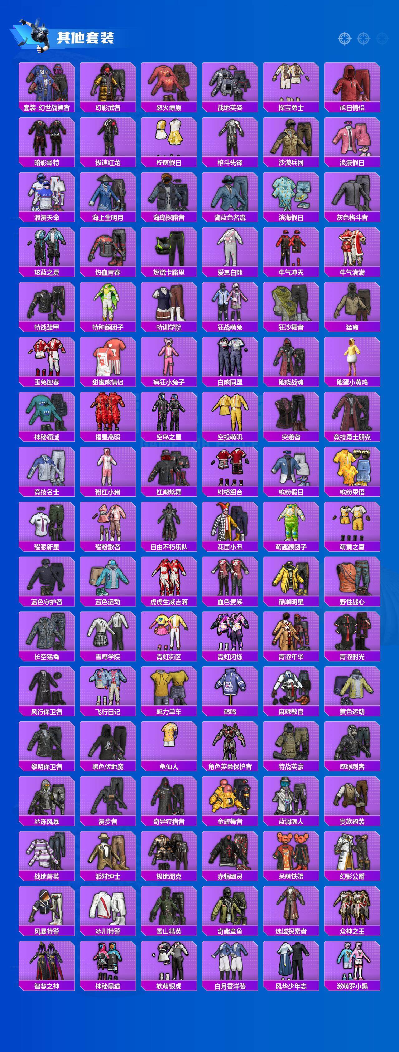 套装-浪漫天命,忍者信条套装,套装-龟仙人,套装-暗影哥特,套装-粉红小猪,套装-极速红龙,套装-狂沙舞者,套装-破蛋小黄鸡,角色-英勇保护者,套装-漫步者,套装-雪山精英,白月香洋装套装,风华少年志套装,套装-机械英豪,套装-暗夜契约,套装-纯白誓言,套装-玄武圣者,套装-灵绣,套装-瑞龙福将,套装-团圆交子