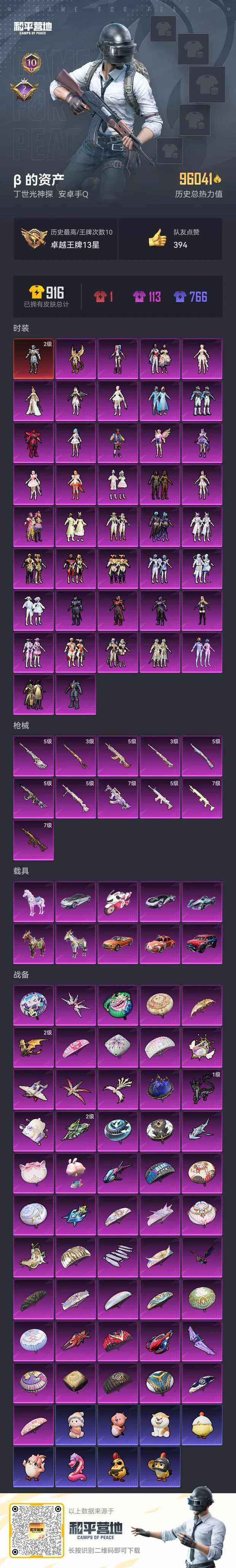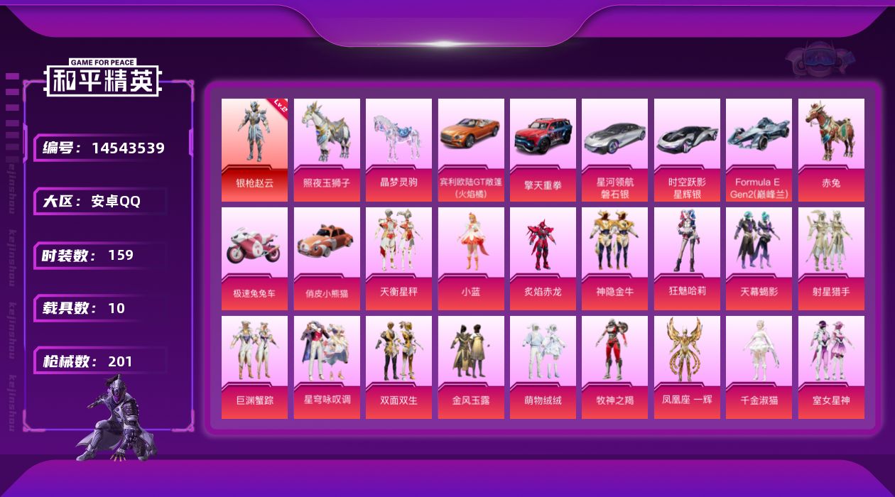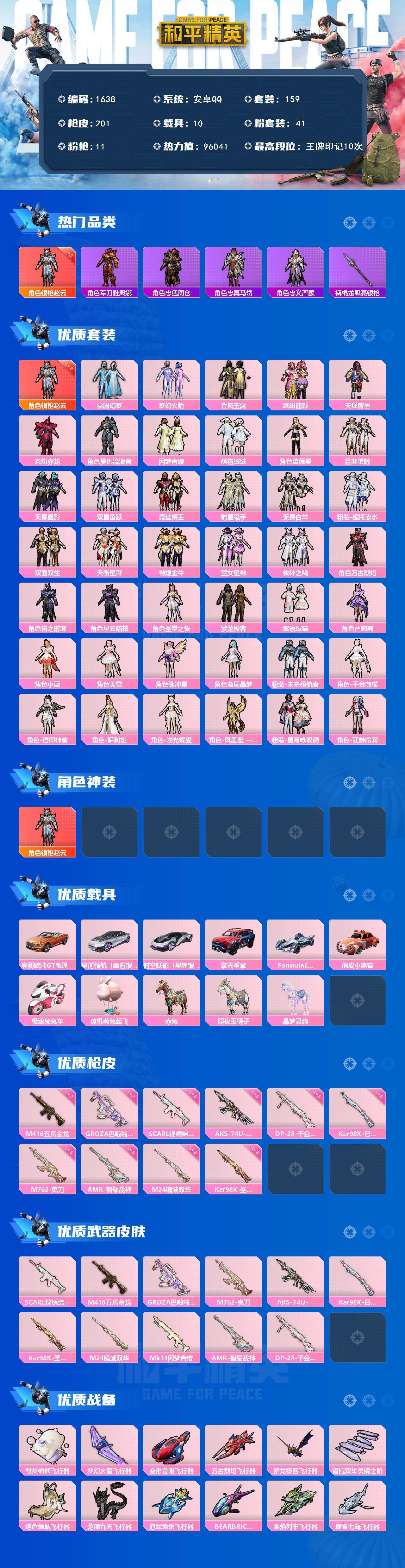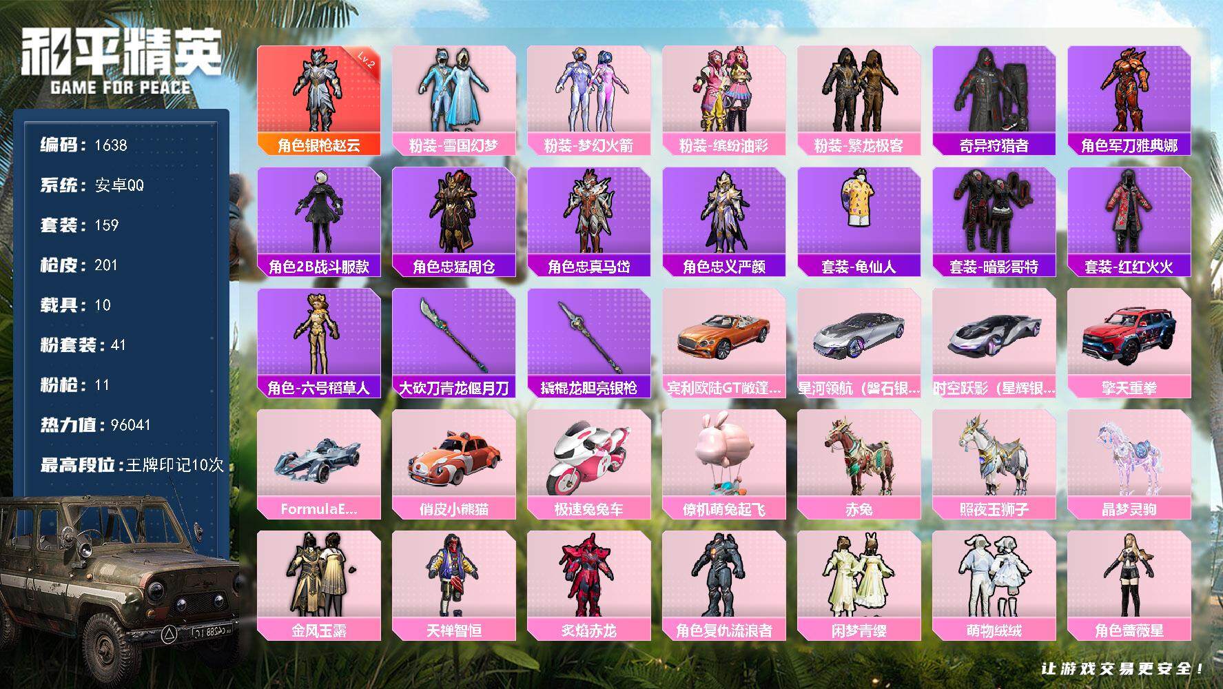 [14543539]安卓 手Q-1神装-41粉装-11特效枪-10载具-18粉色飞行器-96041热力值-10王牌印记-159套装-201枪皮
