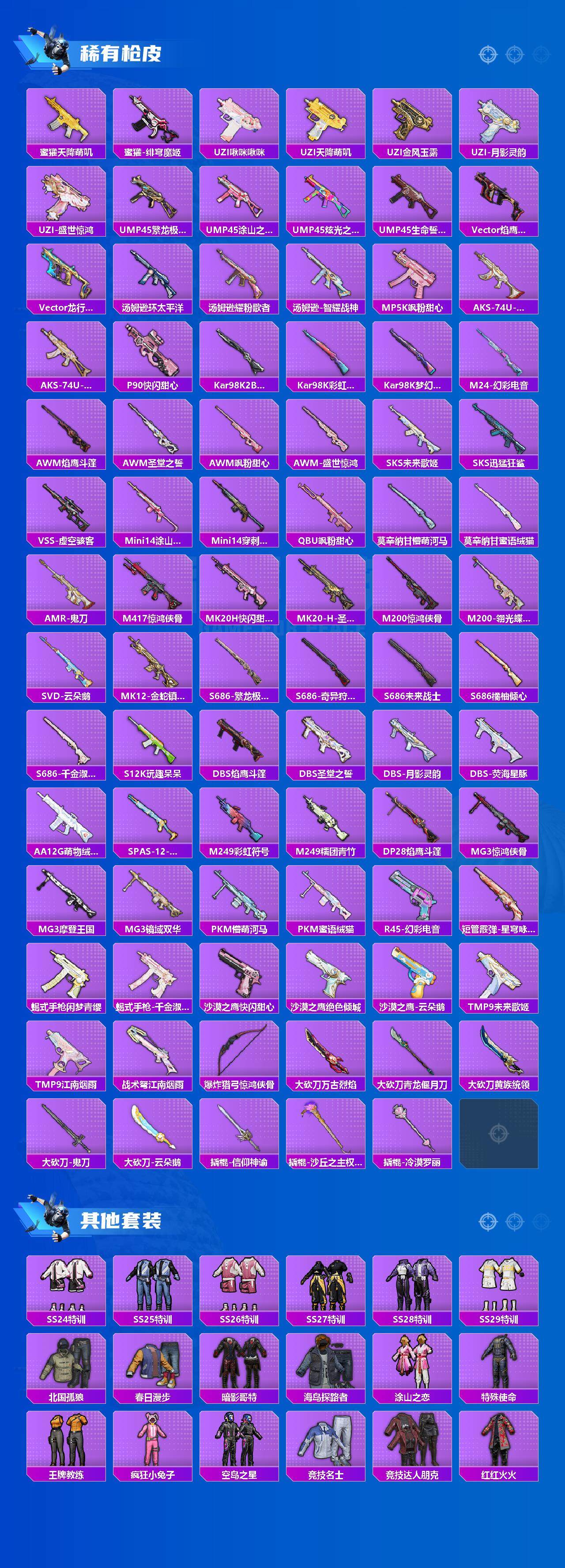 【粉色枪皮】:SCAR-L-锦绣绵绵,M416-五爪金龙,GROZA-巴啦啦小魔仙,M762-鬼刀,AKS-74U-信仰神谕,Kar98K-巳巳如意,Kar98K-圣域龙灵,M24-镜域双华,Mk14-闲梦青缨,AMR-智耀战神,DP-28-千金淑猫