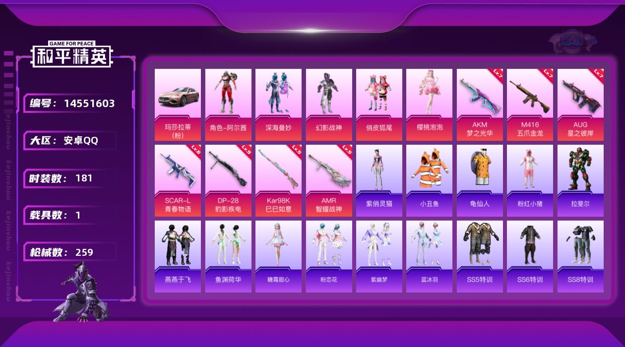 - [12953954]【特价急出/详情看图】:安卓 手Q-2粉装-3特效枪-1粉色飞行器-1.5w热力值-1王牌印记-41套装-49枪皮【热门品类】:套装-龟仙人【粉色套装】:角色-圣堂之誓,角色-异瞳寒姬【粉色枪皮等级】:Kar98K-巳巳如意(三级),AMR-智耀战神(四级),DP-28-豹影疾电(一级)【粉色飞行器】:英伦信使飞行器