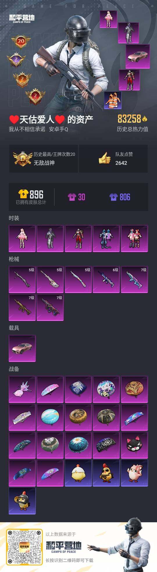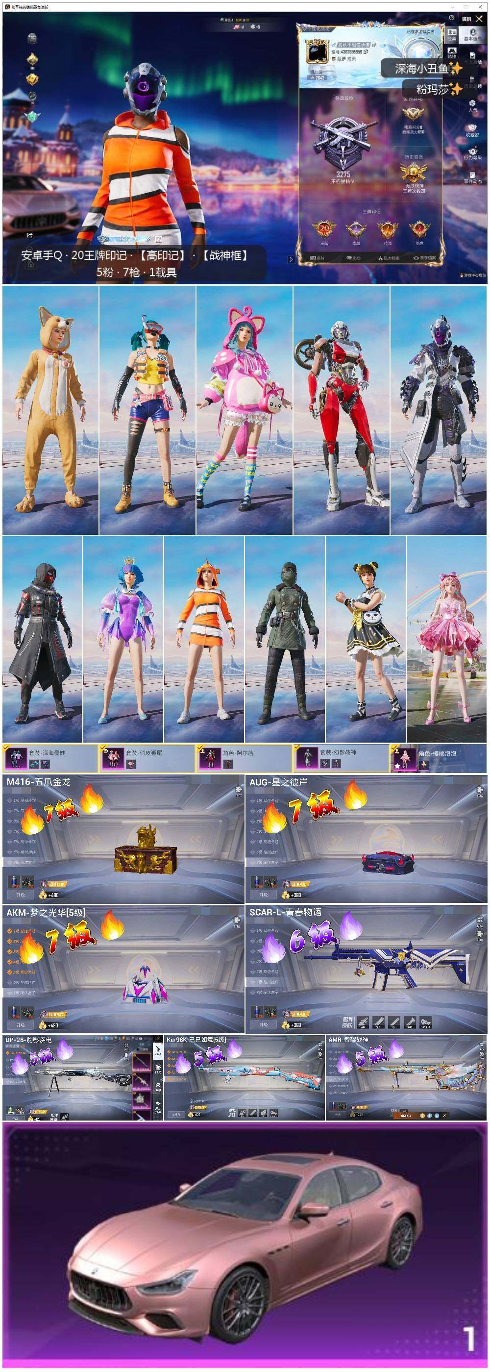 [14551603]可二次【店主推荐捡漏号!可直接换绑】/素材身法号/无敌战神框1/绝世印记2/地铁满天赋 安卓 手Q-无敌战神框-5粉装-7特效枪-1载具-1粉色飞行器-8.3w热力值-20王牌印记-181套装-259枪皮【热门品类】:套装-深海小丑鱼,套装-小丑鱼,套装-奇异狩猎者,套装-龟仙人,套装-浪漫波比,套装-粉红小猪【粉色载具】:玛莎拉蒂Ghibli(粉)【粉色套装】:粉装-深海曼妙,粉装-幻影战神,粉装-俏皮狐尾,角色-阿尔茜,角色-樱桃泡泡【粉色枪皮等级】:AKM-梦之光华(七级),SCAR-L-青春物语(六级),M416-五爪金龙(七级),AUG-星之彼岸(七级),Kar98K-巳巳如意(五级),AMR-智耀战神(五级),DP-28-豹影疾电(五级)
