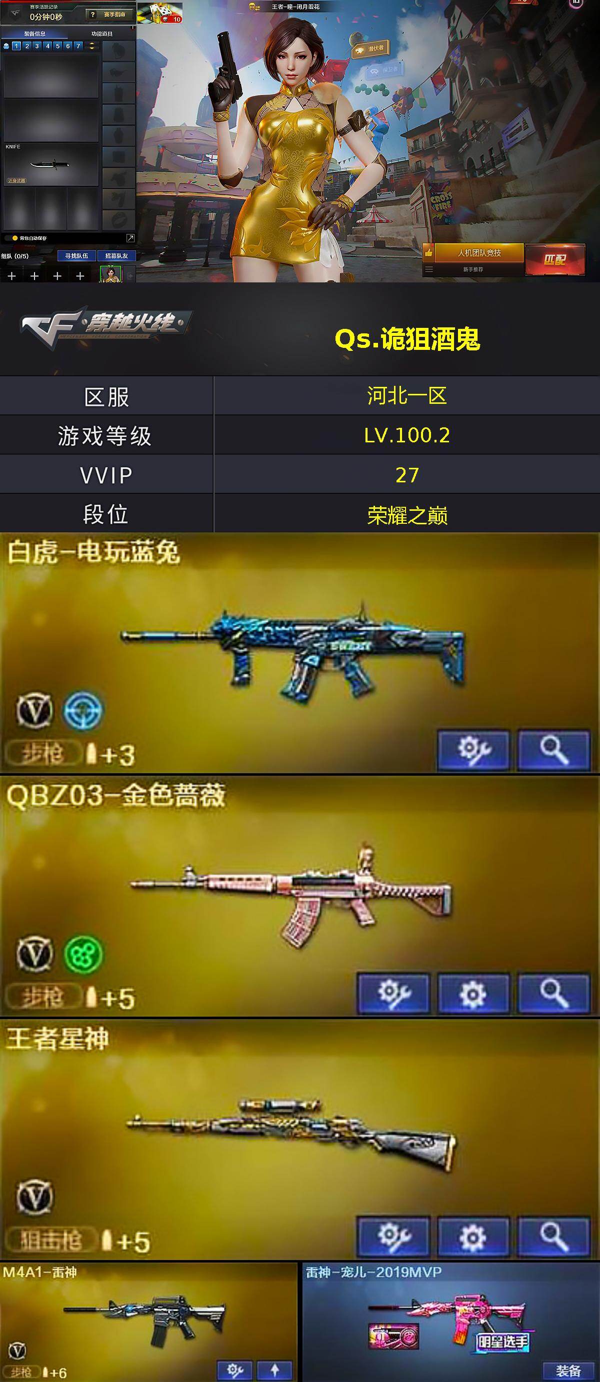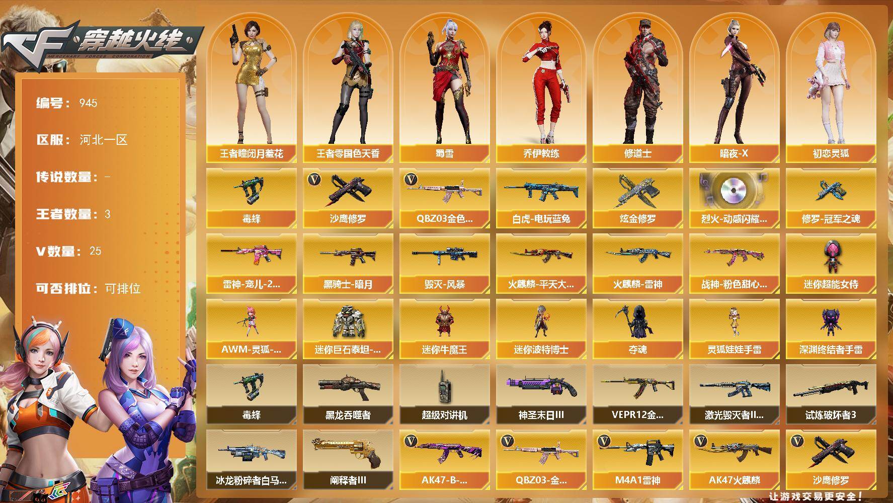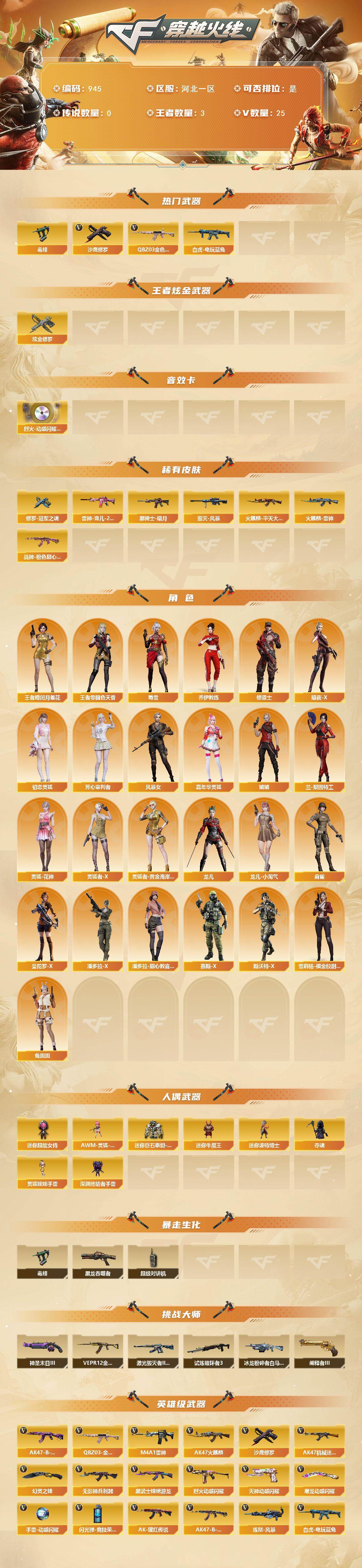 [14564831]河北一区-25V-3王者-1炫金 【热门武器】:QBZ03-金色蔷薇,白虎-电玩蓝兔,毒蜂,沙鹰-修罗 【王者炫金武器】:炫金修罗 【音效卡】:烈火-动感闪耀 音效卡 【皮肤】:雷神-宠儿-2019MVP,火麒麟-雷神,火麒麟-平天大圣,毁灭-风暴,黑骑士-暗月*2,战神-粉色甜心皮肤,修罗-冠军之魂 【角色】:王者-瞳-闭月羞花,王者-零-国色天香,乔伊教练,修道士,暗夜-X,初恋灵狐,芳心审判者,风暴女,嘉年华灵狐,娟娟,兰-梨园特工,灵狐-花神,灵狐者-X,灵狐者-黄金海岸,龙儿,龙儿-小淘气,麻雀,曼陀罗-X,潘多拉-X,潘多拉-甜心教官,赛斯-X,斯沃特-X,蜀雪,兔囡囡,雪莉杨-摸金校尉 【人偶武器】:AWM-灵狐-15周年嘉年华,迷你牛魔王,迷你波特博士*2,夺魂,深渊终结者手雷,迷你超能女侍,迷你巨石泰坦-魔花研究所,灵狐娃娃手雷 【暴走生化】:毒蜂,黑龙吞噬者,超级对讲机 【挑战大师】:冰龙粉碎者-白马银枪*2,激光毁灭者III-白马银枪,VEPR-12-金魔,试炼破坏者III*2,神圣爆裂者-末日III,阐释者III 【英雄级武器】:AK47-火麒麟,M4A1-雷神,AK47-机械迷城,无影-神兵利器,黑武士-锦绣游龙,QBZ03-金色蔷薇,烈火-动感闪耀,AK-47-猩红传说*2,AK47-B-战神,AK47-B-常胜将军,白虎-电玩蓝兔,王者星神-觉醒版,炼狱-风暴,沙鹰-修罗,天神-动感闪耀,幻灵之锋,屠龙-动感闪耀,高爆手雷-幻灵*2,手雷-动感闪耀,闪光弹-幻灵,闪光弹-竞技荣光,烟雾弹-幻灵,烟雾弹-神工天巧 【道具】:CFS限定背包,虎牙炫彩背包,超级背包,哔哩哔哩名片,绿色巨人,灵魂忍者,迷雾幽灵,夺命之镰,防化服*2,金色流光-枪王排位*2,星辰流光-枪王排位,枪王排位28赛季金色流光,枪王排位29赛季金色流光,电玩兔兔表情,动感闪耀表情,EP战队名片,EP战队喷图,EP战队击杀图标,防弹头盔*9,防弹衣*9,C4工具钳*9,手雷包*9 【特殊枪械】: