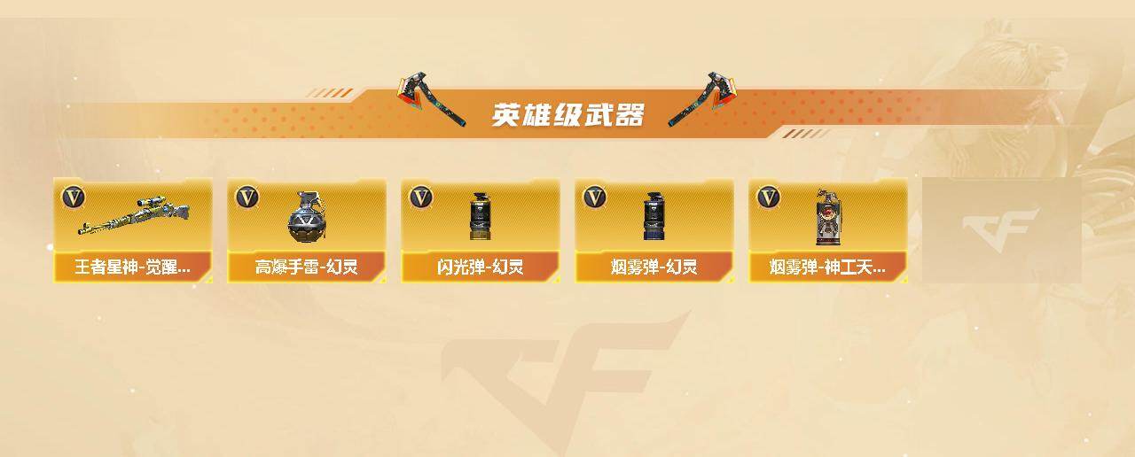【英雄级武器】:AK47-火麒麟,M4A1-雷神,AK47-机械迷城,无影-神兵利器,黑武士-锦绣游龙,QBZ03-金色蔷薇,烈火-动感闪耀,AK-47-猩红传说*2,AK47-B-战神,AK47-B-常胜将军,白虎-电玩蓝兔,王者星神-觉醒版,炼狱-风暴,沙鹰-修罗,天神-动感闪耀,幻灵之锋,屠龙-动感闪耀,高爆手雷-幻灵*2,手雷-动感闪耀,闪光弹-幻灵,闪光弹-竞技荣光,烟雾弹-幻灵,烟雾弹-神工天巧