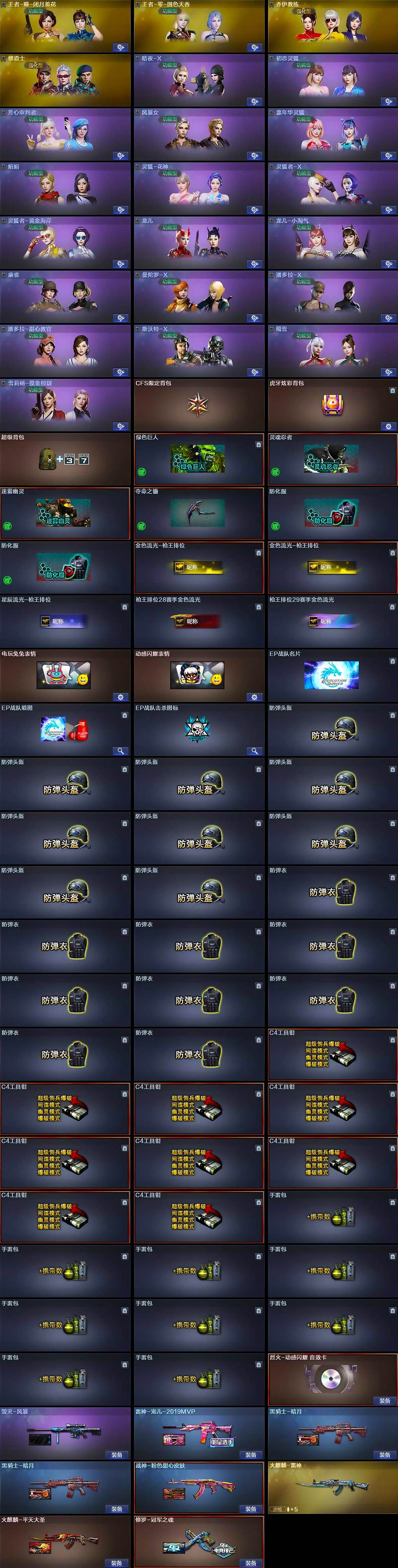 【道具】:CFS限定背包,虎牙炫彩背包,超级背包,哔哩哔哩名片,绿色巨人,灵魂忍者,迷雾幽灵,夺命之镰,防化服*2,金色流光-枪王排位*2,星辰流光-枪王排位,枪王排位28赛季金色流光,枪王排位29赛季金色流光,电玩兔兔表情,动感闪耀表情,EP战队名片,EP战队喷图,EP战队击杀图标,防弹头盔*9,防弹衣*9,C4工具钳*9,手雷包*9