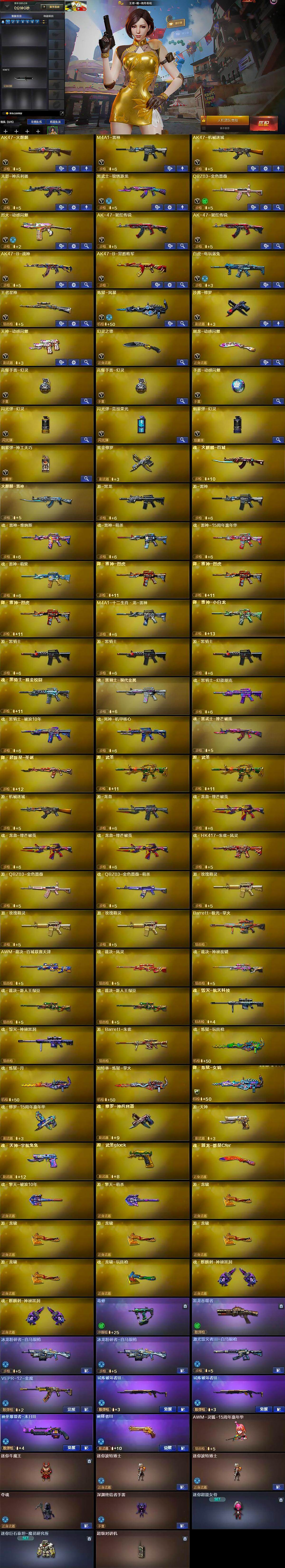 - [13950246]黑龙江区-79V-5王者-3炫金 【热门武器】:死亡之眼,白虎-电玩蓝兔,金色小号,M4A1-黑骑士,汤姆逊-烈龙*6,RPK-盘龙,COP-堕天神,沙鹰-修罗*2 【王者炫金武器】:炫金火麒麟,炫金毁灭,炫金武士,王者之翼,王者之光,王者之怒 【音效卡】:AK47-火麒麟音效卡,M4A1-雷神音效卡,M4A1-黑骑士音效卡,Barrett-毁灭音效卡 【稀有皮肤】:雷神-星空,雷神-虎将,火麒麟-华夏之心,毁灭-荣耀之怒,毁灭-星空,天龙-秘银,天龙-能量核心,AWM-天龙-传奇70KG,AWM-天龙-传奇白鲨 【角色】:葵,樱,炫,迷迭香,战地猎狐 【人偶武器】:AWM-灵狐-15周年嘉年华,夺魂,迷你生化手雷,闪光弹-小乔 【暴走生化】:死亡之眼 【挑战大师】:阐释者III,激光毁灭者III,AK47-冰龙粉碎者 【英雄级武器】:COP-堕天神,麒麟刺-堕天神,M4A1-雷霆,天神-动感闪耀,白虎-电玩蓝兔,M4A1-雷神,M4A1-黑龙*3,M4A1-黑骑士,M4A1-死神,RPK-盘龙,汤姆逊-烈龙*6,AK47-无影,AK47-火麒麟,AK47-黑武士,AK12-天启,AWM-天龙,Barrett-毁灭,Barrett-极光,AA-12-雷霆,AK47-黑鲨,AK-47-猩红传说*7,AK47-B-战神,沙鹰-天神,沙鹰-修罗*2,麒麟刺,擎天,龙啸,屠龙 【特殊枪械】:1黑骑士,6烈龙,1盘龙