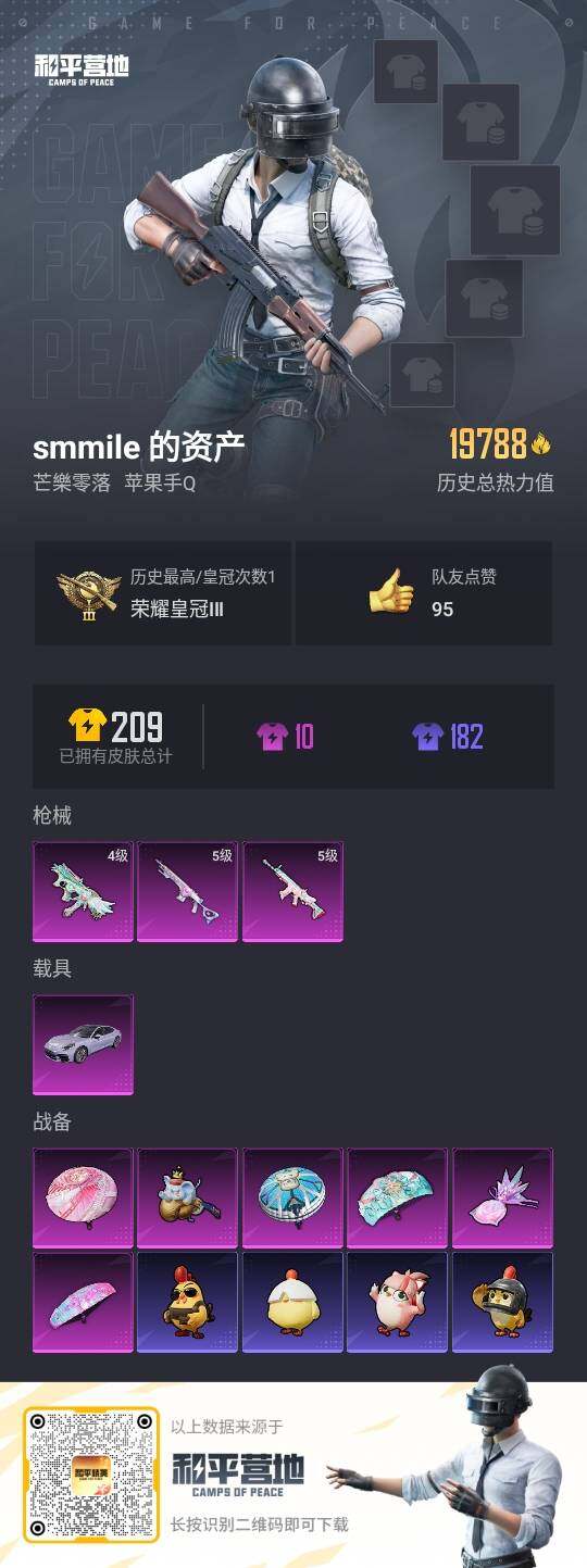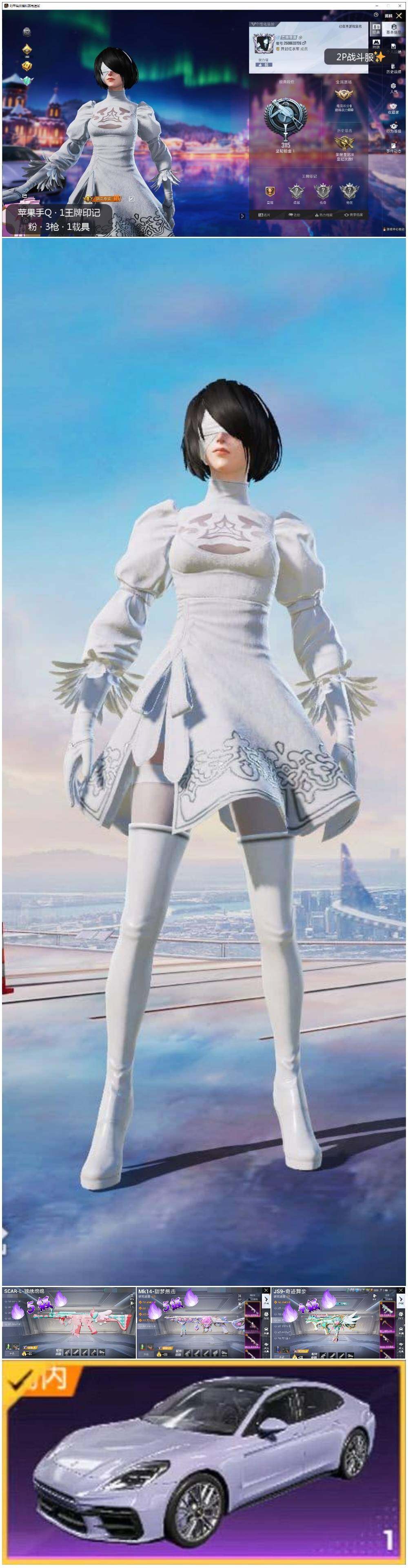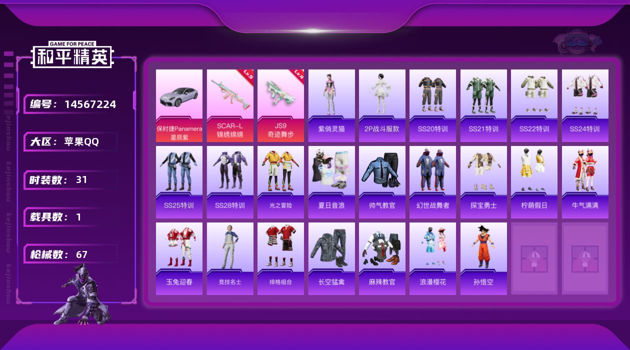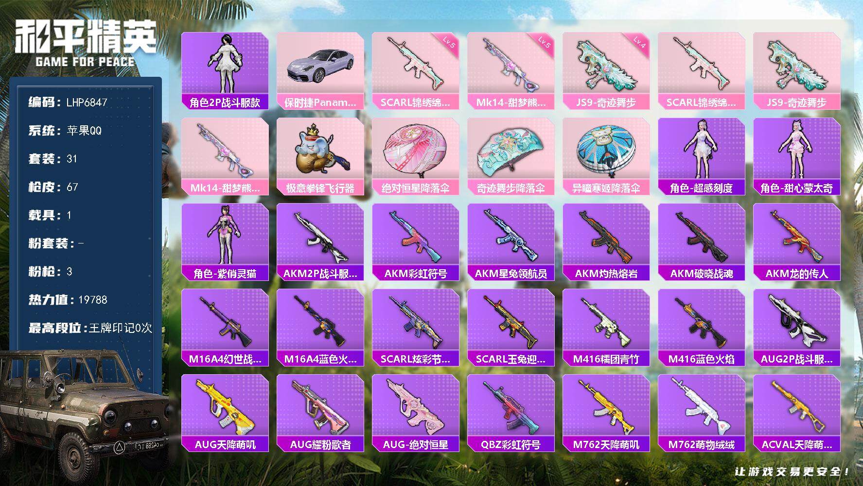 [14567224]可二次【店主推荐捡漏号!可直接换绑】 苹果 手Q-3特效枪-1载具-2粉色飞行器-1.9w热力值-1王牌印记-31套装-67枪皮【热门品类】:角色-2P战斗服款【粉色载具】:保时捷Panamera(星辰紫)【粉色枪皮等级】:SCAR-L-锦绣绵绵(五级),JS9-奇迹舞步(四级),Mk14-甜梦熊击(五级)【粉色飞行器】:极意拳锋飞行器