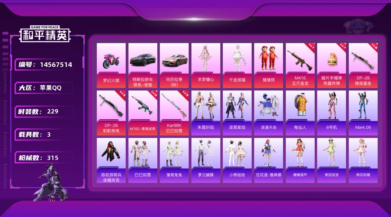 - [13503324]【店主推荐捡漏号!可直接换绑】/素材身法号 苹果 手Q-9粉装-8特效枪-1载具-2粉色飞行器-6.5w热力值-14王牌印记-127套装-203枪皮【热门品类】:粉装-梦幻火箭,角色-军刀雅典娜,套装-龟仙人【粉色载具】:玛莎拉蒂Quattroporte(夜幕蓝)【粉色套装】:粉装-梦幻火箭,粉装-极致幻想,角色-洛天依,粉装-旋转彩虹,粉装-第五大道,角色-烟云彩露,角色-美雪,角色-美琪,角色-千金淑猫【粉色枪皮等级】:SCAR-L-锦绣绵绵(五级),M416-心之恋语(七级),GROZA-镜光银凌(五级),UMP45-量子极限(五级),Kar98K-创世·救赎(七级),Kar98K-巳巳如意(五级),DP-28-豹影疾电(五级),PKM-江南烟雨(七级)【粉色飞行器】:梦幻火箭飞行器,凤舞九天飞行器
