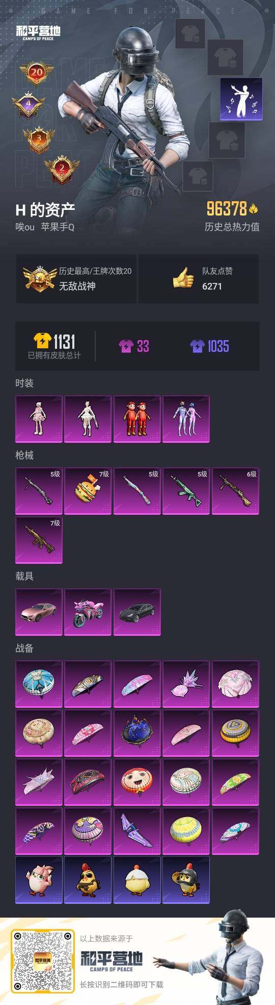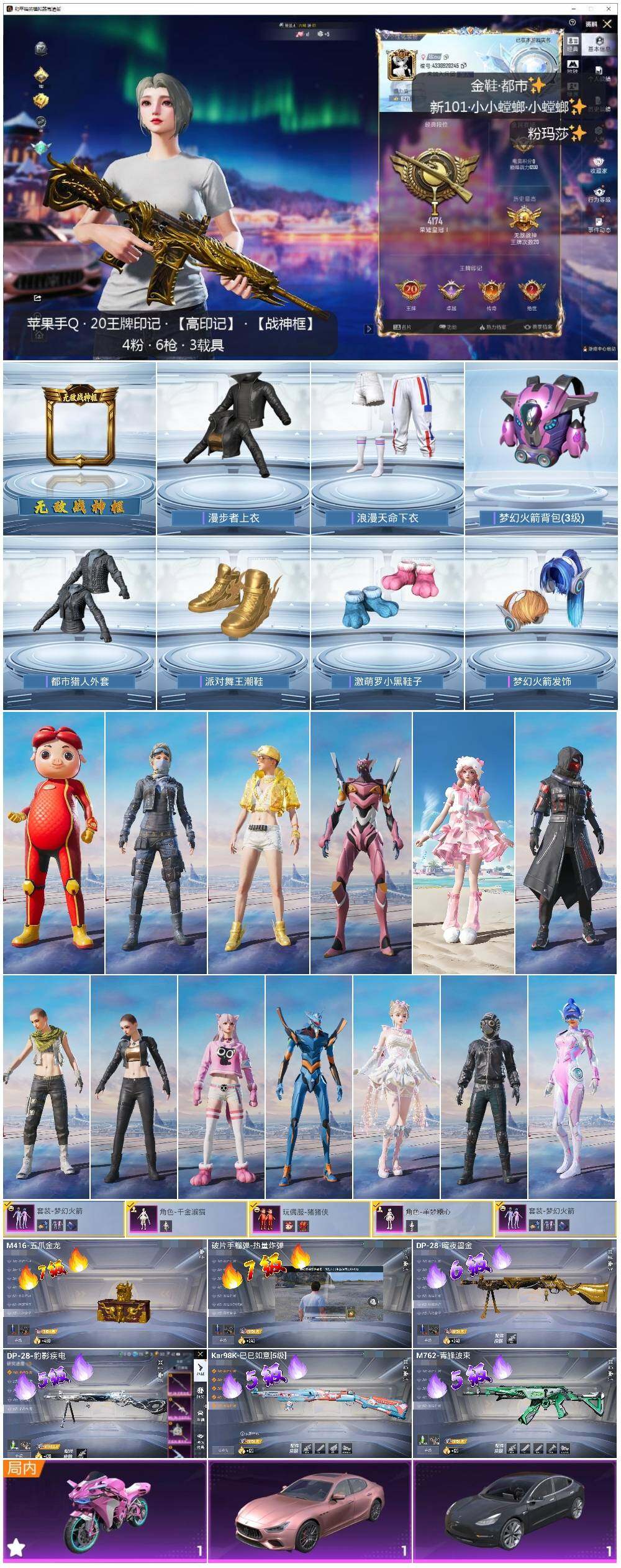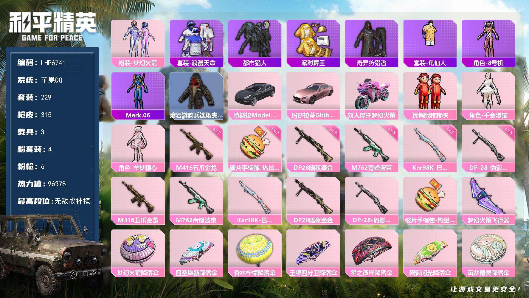 [14567514]可二次【店主推荐捡漏号!可直接换绑】/ 素材身法号/无敌战神框2/绝世印记2/地铁满天赋 苹果 手Q-无敌战神框-4粉装-6特效枪-3载具-2粉色飞行器-9.6w热力值-20王牌印记-229套装-315枪皮【热门品类】:粉装-梦幻火箭,套装-浪漫天命,套装-都市猎人,套装-派对舞王,套装-奇异狩猎者,套装-龟仙人,角色-8号机,角色-Mark.06,熔岩游骑兵连帽夹克【粉色载具】:特斯拉Model 3(冷光银),玛莎拉蒂Ghibli(粉),双人摩托-梦幻火箭【粉色套装】:粉装-梦幻火箭,玩偶服-猪猪侠,角色-千金淑猫,角色-羊梦糖心【粉色枪皮等级】:M416-五爪金龙(七级),M762-青锋波束(五级),Kar98K-巳巳如意(五级),DP-28-暗夜鎏金(六级),DP-28-豹影疾电(五级),破片手榴弹-热量炸弹(七级)【粉色飞行器】:梦幻火箭飞行器