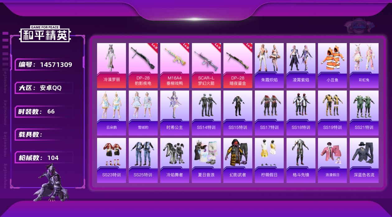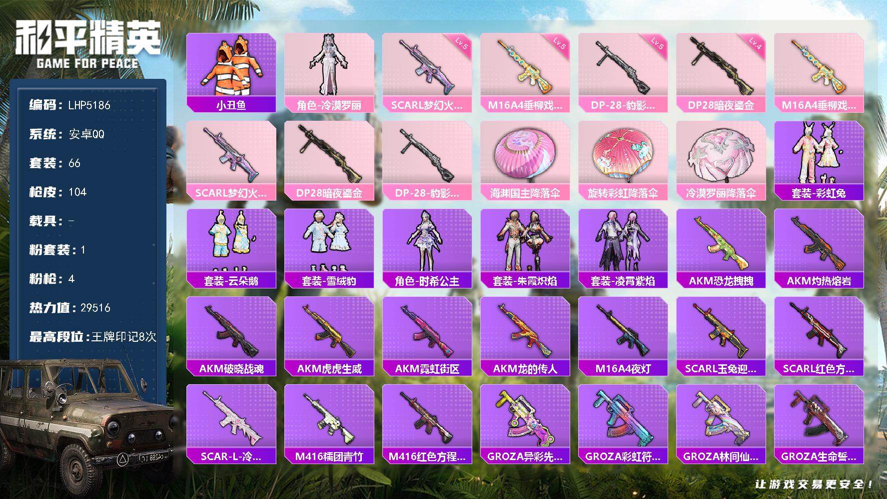 [14571309]绝世印记1【特价急出/详情看图】:安卓 手Q-1粉装-4特效枪-2.9w热力值-8王牌印记-66套装-104枪皮【热门品类】:套装-小丑鱼【粉色套装】:角色-冷漠罗丽【粉色枪皮等级】:M16A4-垂柳戏鸭(五级),SCAR-L-梦幻火箭(五级),DP-28-暗夜鎏金(四级),DP-28-豹影疾电(五级)