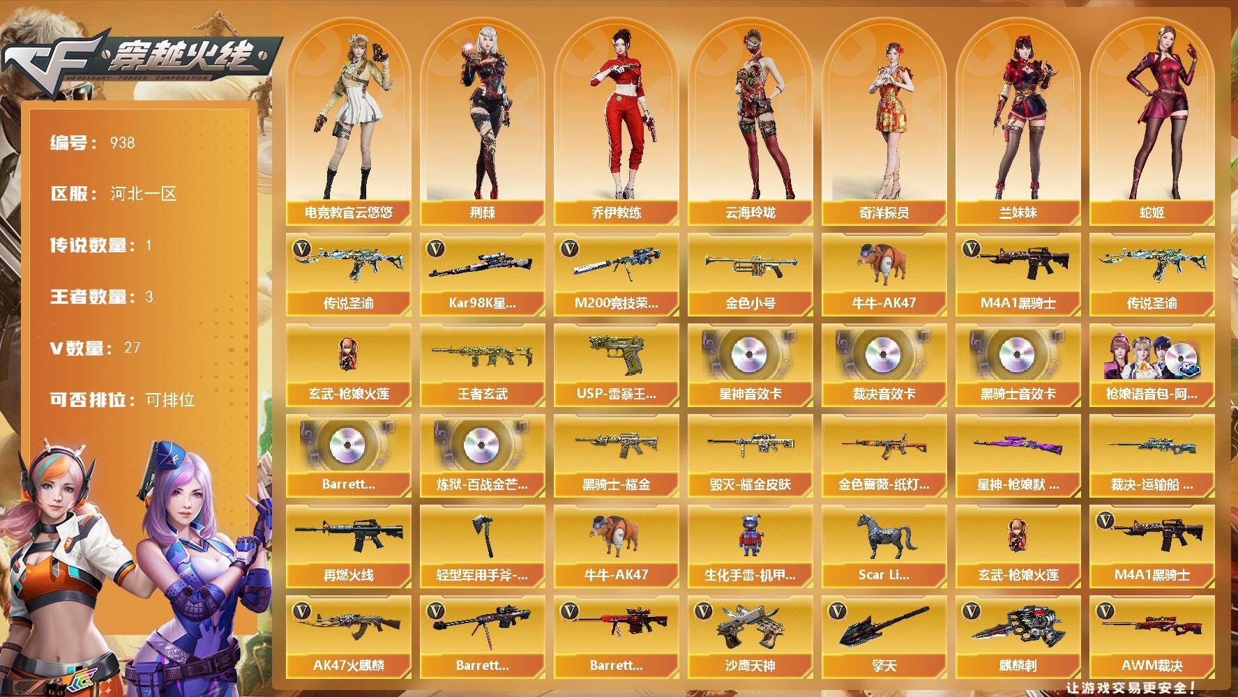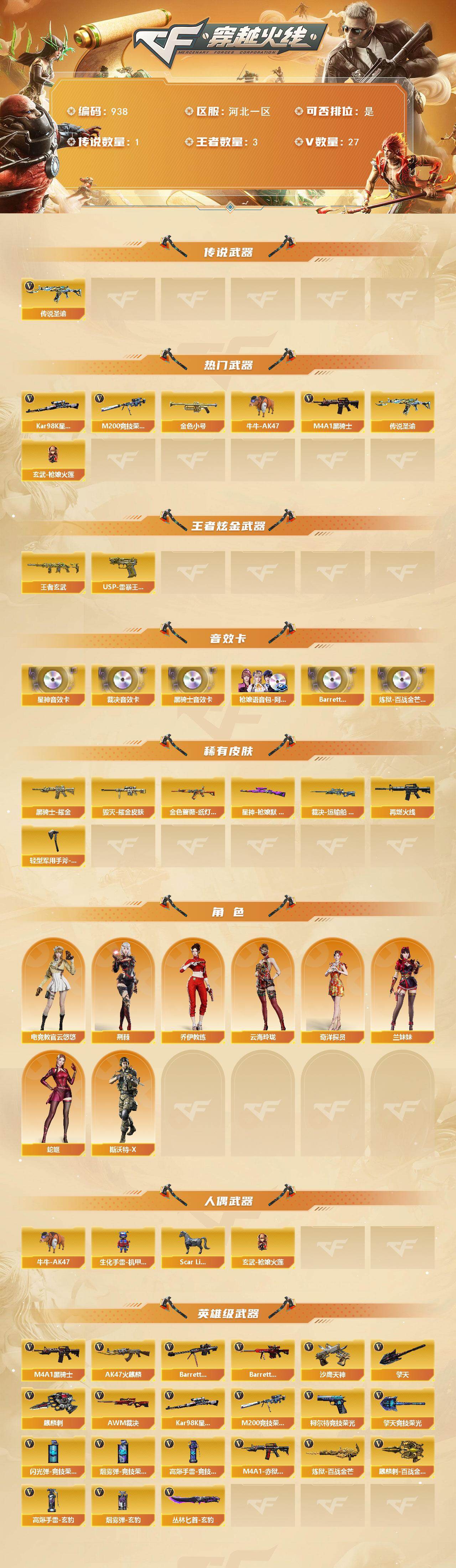[14594024]24V/74级/校官/1传说/3王者/3英雄/传说圣谕/M200-竞技荣光/Kar98k-星神/金色小号/牛牛-AK47/M4A1-黑骑士/玄武-枪娘火莲/王者玄武/USP雷暴王者/M4A1-黑骑士音效卡/AWM-裁决音效卡/枪娘语音包-阿敏/星神音效卡/Barrett-碧霄极光音效卡/炼狱-百战金芒-庆典舞曲音效卡/金色蔷薇-纸灯龙皮肤/裁决-运输船 皮肤/星神-枪娘默/M4A1-再燃火线/毁灭耀金皮肤/黑骑士-耀金皮肤/轻型军用手斧-再燃火线/电竞教官-云悠悠/荆棘/奇洋探员/乔伊教练/云海玲珑/兰妹妹/蛇姬/斯沃特-X/Scar Light-马枪/生化手雷-机甲核心/AK47-火麒麟/Barrett-毁灭/Barrett-极光/AWM-裁决/炼狱-百战金芒/沙鹰-天神/柯尔特-竞技荣光/Anaconda-玄豹/擎天/麒麟刺/擎天-竞技荣光/麒麟刺-百战金芒/丛林匕首-玄豹/高爆手雷-竞技荣光/高爆手雷-玄豹/闪光弹-竞技荣光/烟雾弹-竞技荣光/烟雾弹-玄豹/M4A1-赤狱骑士/百战金芒炫彩背包/女皇终结者-魔龙之吻/救世主-黑桃战神/绿色巨人/灵魂忍者/迷雾幽灵/夺命之镰/防化服/枪王排位29赛季金色流光/语音特效-盛典烟火/萌萌小葵表情/C4-再燃火线/防弹头盔/防弹衣/C4工具钳/手雷包