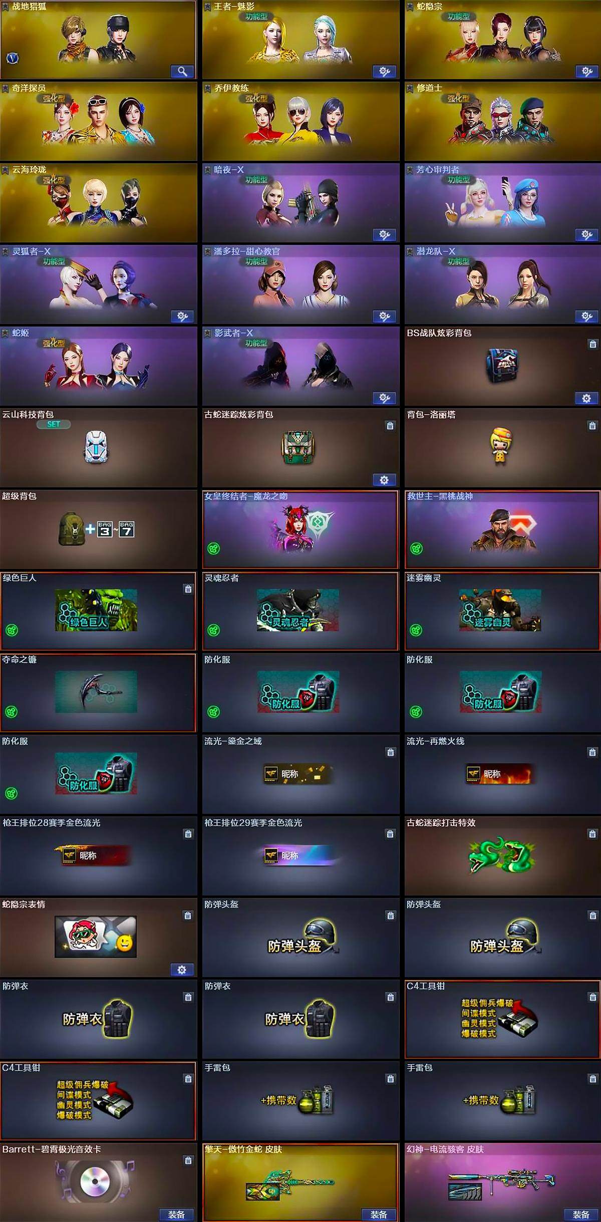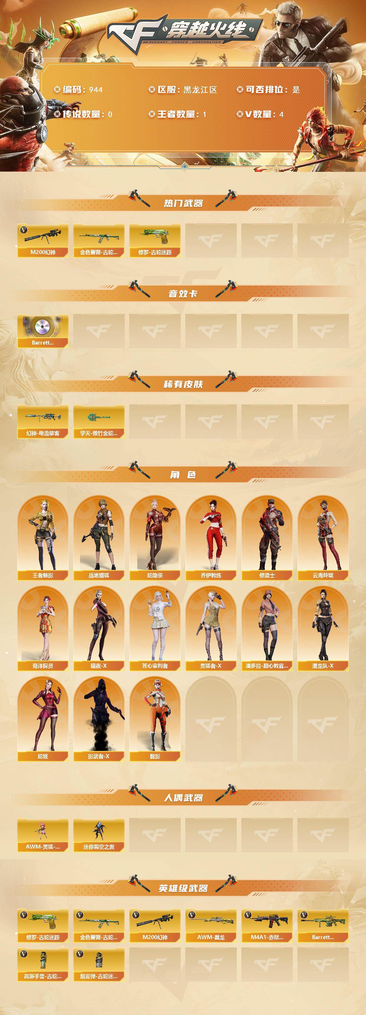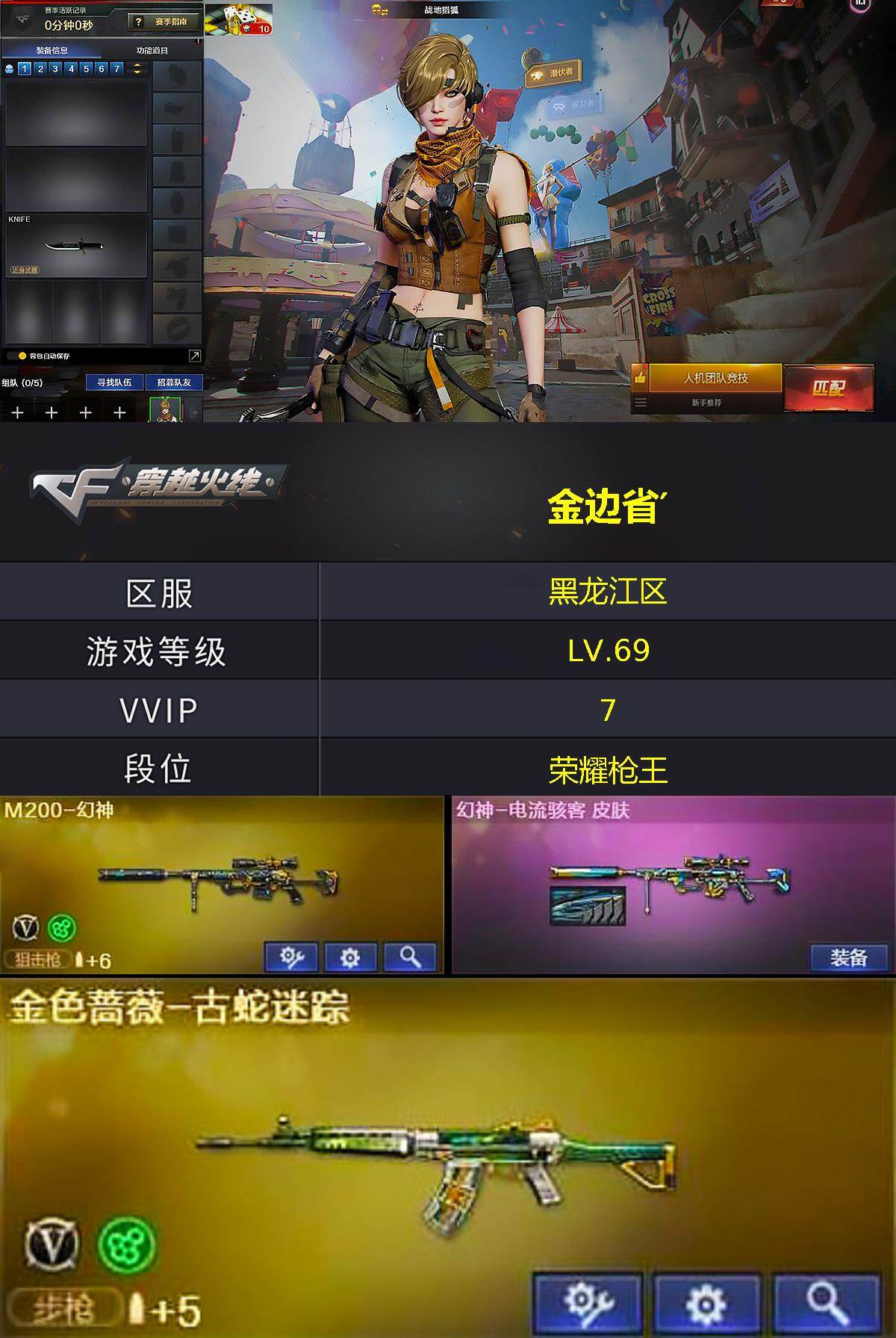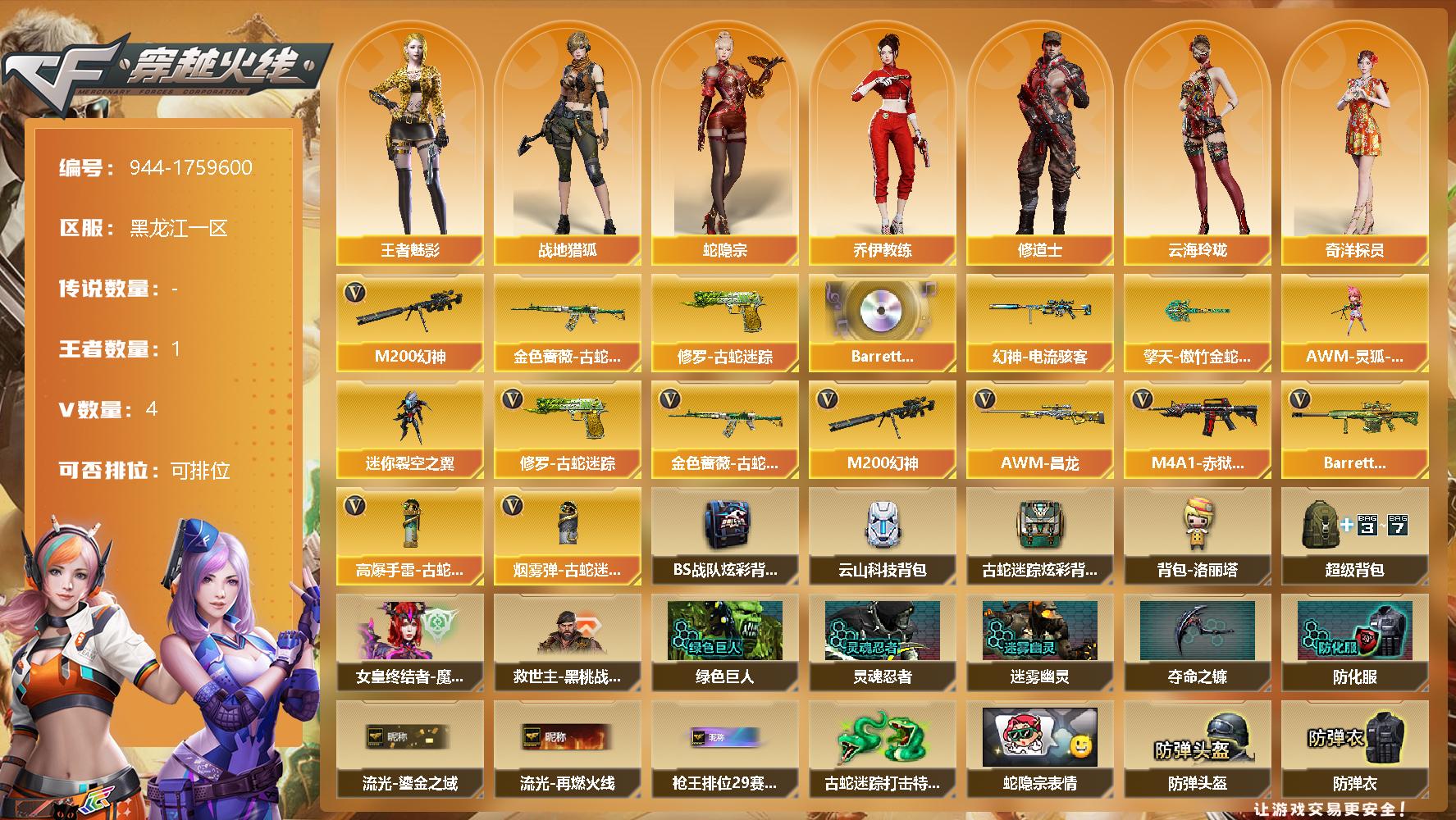 [14594910]3V/69级/校官/1王者/1英雄/M200-幻神/金色蔷薇-古蛇迷踪/修罗-古蛇迷踪/Barrett-碧霄极光音效卡/幻神-电流骇客/擎天-傲竹金蛇 皮肤/战地猎狐/王者-魅影/蛇隐宗/奇洋探员/乔伊教练/修道士/云海玲珑/暗夜-X/芳心审判者/灵狐者-X/潘多拉-甜心教官/潜龙队-X/蛇姬/影武者-X/智影/AWM-灵狐-15周年嘉年华/迷你裂空之翼/高爆手雷-古蛇迷踪/烟雾弹-古蛇迷踪/M4A1-赤狱骑士/AWM-昌龙/Barrett-碧霄极光/BS战队炫彩背包/云山科技背包/古蛇迷踪炫彩背包/背包-洛丽塔/超级背包/女皇终结者-魔龙之吻/救世主-黑桃战神/绿色巨人/灵魂忍者/迷雾幽灵/夺命之镰/防化服/流光-鎏金之域/流光-再燃火线/枪王排位28赛季金色流光/枪王排位29赛季金色流光/古蛇迷踪打击特效/蛇隐宗表情/防弹头盔/防弹衣/C4工具钳/手雷包