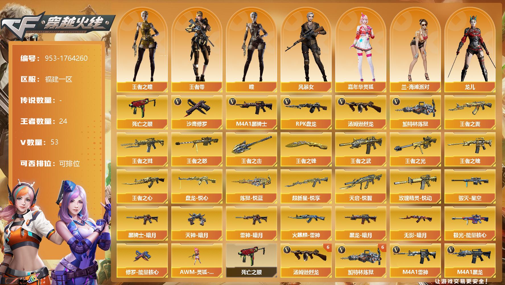 [14596301]52V/100级/元帅/24王者/1英雄/死亡之眼/M4A1-黑骑士/汤姆逊-烈龙/RPK-盘龙/加特林-炼狱/沙鹰-修罗/王者之戮/超新星-悦享/天启-悦智/王者之翼/王者之武/玫瑰精灵-悦动/王者之魄/王者之心/王者之光/王者之怒/盘龙-悦心/炼狱-悦蓝/王者之击/王者之锋/雷神-暗月/火麒麟-雷神/毁灭-星空/黑龙-暗月/黑骑士-暗月/无影-暗月/极光-能量核心/修罗-能量核心/天神-暗月/瞳/王者-零/王者之瞳/风暴女/嘉年华灵狐/兰-海滩派对/龙儿/麻雀/新娜塔莎/影武者-X/AWM-灵狐-15周年嘉年华/6炼狱/6烈龙/AK47-火麒麟/AK47-麒麟/M4A1-黑龙/M4A1-雷神/AK47-无影/M4A1-死神/AK47-黑武士/AK12-天启/M4A1-武圣/AK47-机械迷城/M4A1-玫瑰精灵/AWM-天龙/Barrett-毁灭/Barrett-极光/沙鹰-天神/Glock18-武圣/屠龙/龙啸/擎天/麒麟刺/云山科技背包/战舰背包/炫彩背包/超级背包/绿色巨人/变异宝贝/生化弹匣/夺命之镰/防化服/金色流光-枪王排位/C4-红龙/防弹头盔/防弹衣/C4工具钳/手雷包