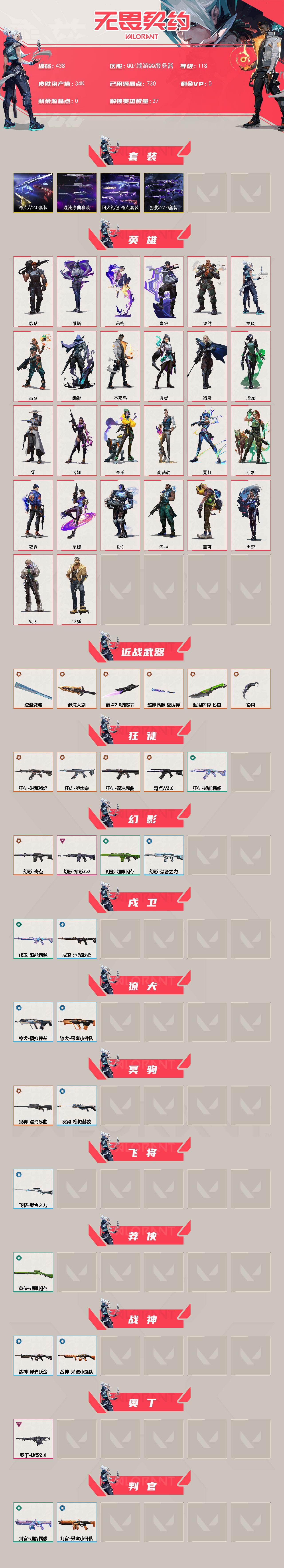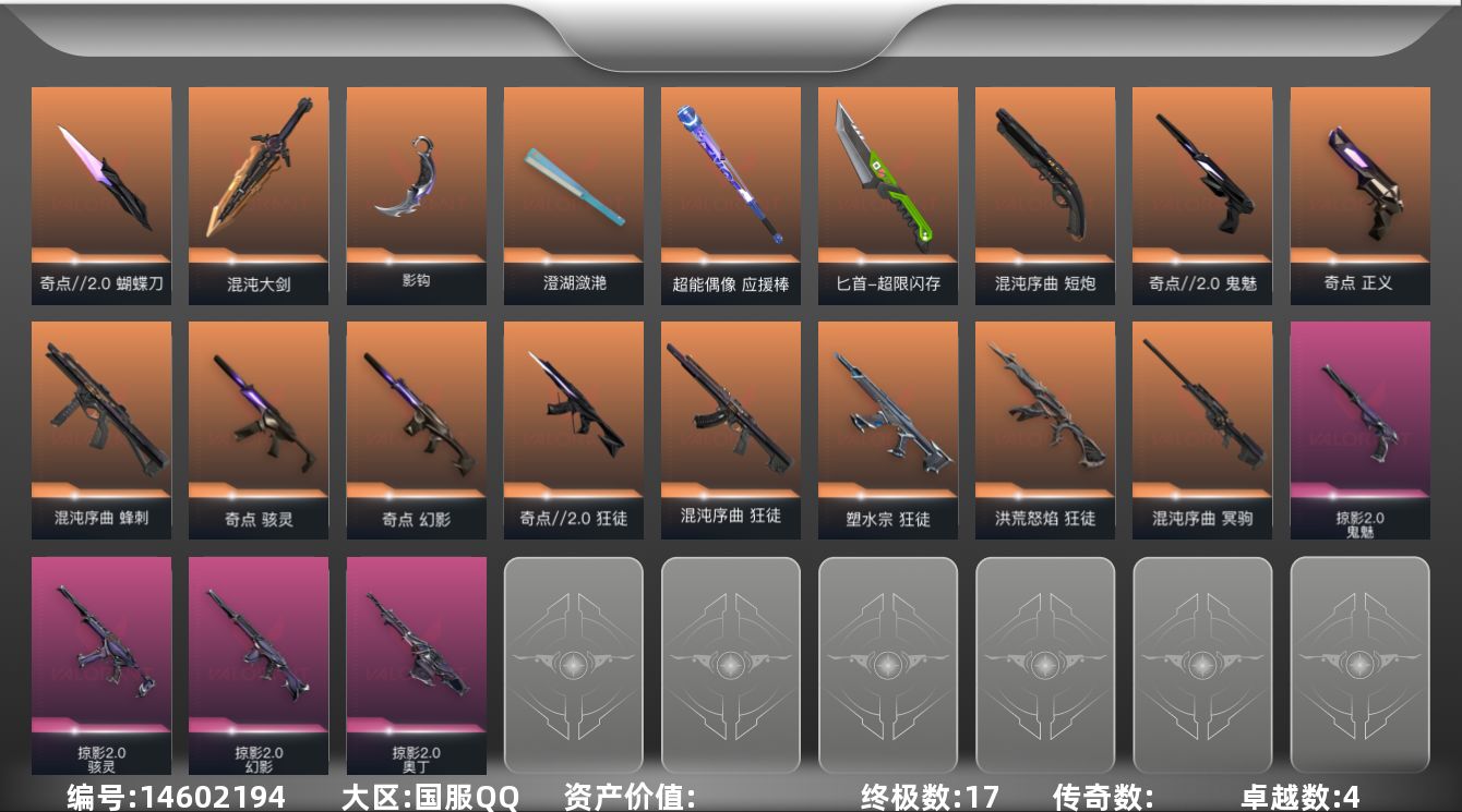[14602194]【套装】:混沌序曲套装,奇点//2.0套装,回火礼包:奇点套装,掠影//2.0套装 【英雄】:炼狱,维斯,暮蝶,钛狐,壹决,铁臂,捷风,雷兹,幽影,不死鸟,贤者,猎枭,蝰蛇,零,芮娜,奇乐,尚勃勒,霓虹,斯凯,夜露,星礈,K/O,海神,盖可,黑梦,钢锁 【近战 武器】:近战武器-影钩,近战武器-奇点//2.0 蝴蝶刀,近战武器-澄湖潋滟,近战武器-混沌大剑,近战武器-超能偶像 应援棒,近战武器-超限闪存 匕首 【狂徒】:狂徒-洪荒怒焰,狂徒-混沌序曲,狂徒-奇点//2.0,狂徒-塑水宗,狂徒-超能偶像 【幻影】:幻影-奇点,幻影-掠影//2.0,幻影-超限闪存,幻影-聚合之力 【戍卫】:戍卫-超能偶像,戍卫-浮光跃金 【獠犬】:獠犬-采蜜小蜂队,獠犬-模拟赫兹 【冥驹】:冥驹-混沌序曲,冥驹-模拟赫兹 【飞将】:飞将-聚合之力 【莽侠】:莽侠-超限闪存 【战神】:战神-采蜜小蜂队,战神-浮光跃金 【奥丁】:奥丁-掠影//2.0 【判官】:判官-超能偶像,判官-采蜜小蜂队 【雄鹿】:雄鹿-模拟赫兹 【骇灵】:骇灵-奇点,骇灵-掠影//2.0,骇灵-浮光跃金 【蜂刺】:蜂刺-混沌序曲,蜂刺-超限闪存,蜂刺-聚合之力 【标配】:标配-超能偶像,标配-浮光跃金 【正义】:正义-奇点,正义-超限闪存,正义-纳米打击 【鬼魅】:鬼魅-奇点//2.0,鬼魅-掠影//2.0,鬼魅-采蜜小蜂队,鬼魅-模拟赫兹 【狂怒】:狂怒-聚合之力 【短炮】:短炮-混沌序曲 【卡面】:终章:激斗汉堡 卡面,进入射程 卡面,《双城之战》拥抱 卡面,精灵大战 卡面,欢迎来到底城 卡面,南瓜盛典 卡面,唱片的故事 卡面,钢弓与箭弦 卡面,排除故障 卡面,奇点//2.0 卡面,战术桌游 卡面,悠享食光 卡面,修车达人 卡面,模拟赫兹 卡面,浮光跃金 卡面,超限闪存 卡面,维斯工牌 卡面,正义的化身 卡面,终章:生意人麦宝 卡面,铁之华 卡面,失而复得 卡面,时间到 卡面,最高舞台 卡面,复活专家 卡面,归乡 // 蝰蛇 卡面,超能偶像 卡面,生意人麦宝 卡面,声感陷阱设计图 卡面,钢锁工牌 卡面,战术小伙伴的夏日 卡面,采蜜小蜂队 卡面,聚合之力 卡面,梦幻奶茶 卡面,哨卫者之领域 卡面,零点嗅探设计图 卡面,无畏契约GO!第一卷:芮娜 卡面,清除名单 卡面,无畏契约GO!第一卷:零 卡面,《双城之战》