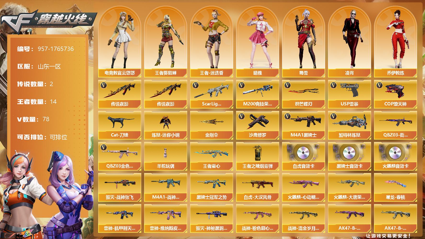 - [14971553]山西一区-67V-6王者-1炫金 【热门武器】:M200-竞技荣光,M4A1-黑骑士,汤姆逊-烈龙*5,RPK-盘龙*4,加特林-炼狱,斯泰尔-蝴蝶,裁决-雪莉杨,沙鹰-修罗 【王者炫金武器】:王者之城,炫金天龙 【音效卡】:AK47-火麒麟音效卡,M4A1-雷神音效卡,M4A1-黑龙音效卡,M4A1-黑骑士音效卡*2,Barrett-毁灭音效卡 【皮肤】:幻神-电竞之星 皮肤,雷神-机甲刑天皮肤,雷神-宇航兔皮肤,雷神-源计划2.0专属 皮肤,火麒麟-AG战队皮肤,火麒麟-雷神,火麒麟-百城,毁灭-冠军之怒,毁灭-黑大圣皮肤,毁灭-神秘黑洞皮肤,黑龙-暗月,黑骑士-暗月,黑骑士-伏羲,战神-粉色甜心皮肤,战神-紫绶金章皮肤,战神-流金岁月皮肤,AK47-B-常胜将军-曹操,炼狱-玩具枪皮肤 【角色】:电竞教官-云悠悠,修道士,空,暗夜-X,初恋灵狐,芳心审判者,风暴女*2,虎妞,嘉年华灵狐,灵狐者-七夕宝贝,龙儿,龙儿-小淘气,曼陀罗-礼服,潘多拉-X,潘多拉-甜心教官,潜龙队-X,邱刚敖,蜀雪,新娜塔莎,雪莉杨,夜玫瑰-幻能朋克,樱-战斗天使,影武者-X 【人偶武器】:裁决-雪莉杨,天龙-曼陀罗,斯泰尔-蝴蝶,巴雷特-零-水下丽影,AWM-灵狐-15周年嘉年华,M37-葵,迷你牛魔王,夺魂,迷你生化手雷,闪光弹-小乔*2,迷你艾比,灵狐娃娃手雷 【挑战大师】:神圣爆裂者III,冰龙粉碎者-白马银枪,激光毁灭者III-白马银枪,激光毁灭者III,试炼破坏者III,KAC-圣炎切割者III,神圣爆裂者-末日III*2,阐释者III 【英雄级武器】:AK47-火麒麟,M4A1-黑龙,M4A1-雷神,M4A1-黑骑士,AK47-无影,AK12-天启,M4A1-龙血,王者之魄-觉醒版,王者之幻-觉醒版,AK-47-猩红传说*2,AK47-B-战神,黑骑士-海王*2,AK47-B-常胜将军,AWM-天龙*2,Barrett-毁灭,AWM-裁决*2,M200-竞技荣光,王者之怒-觉醒版,RPK-盘龙*4,加特林-炼狱,汤姆逊-烈龙*5,沙鹰-修罗,COP 357-雷霆王者-觉醒版,柯尔特-竞技荣光,王者之灵-觉醒版,屠龙,龙啸,擎天,麒麟刺,擎天-竞技荣光*2,斩神刀-雷暴,高爆手雷-雷暴*2,高爆手雷-幻灵,高爆手雷-竞技荣光*4,闪光弹-雷暴*2,闪光弹-幻灵,闪光弹-