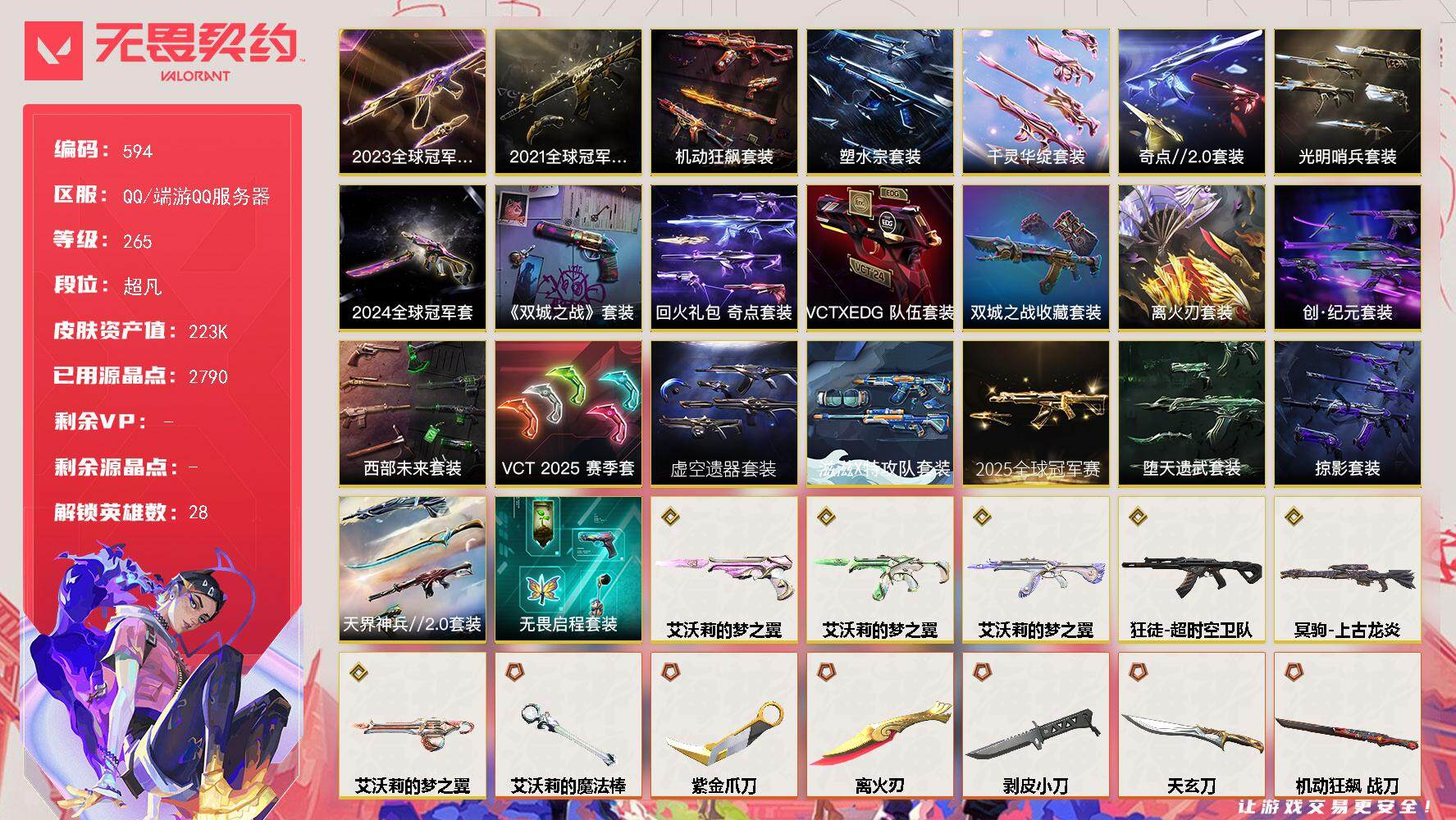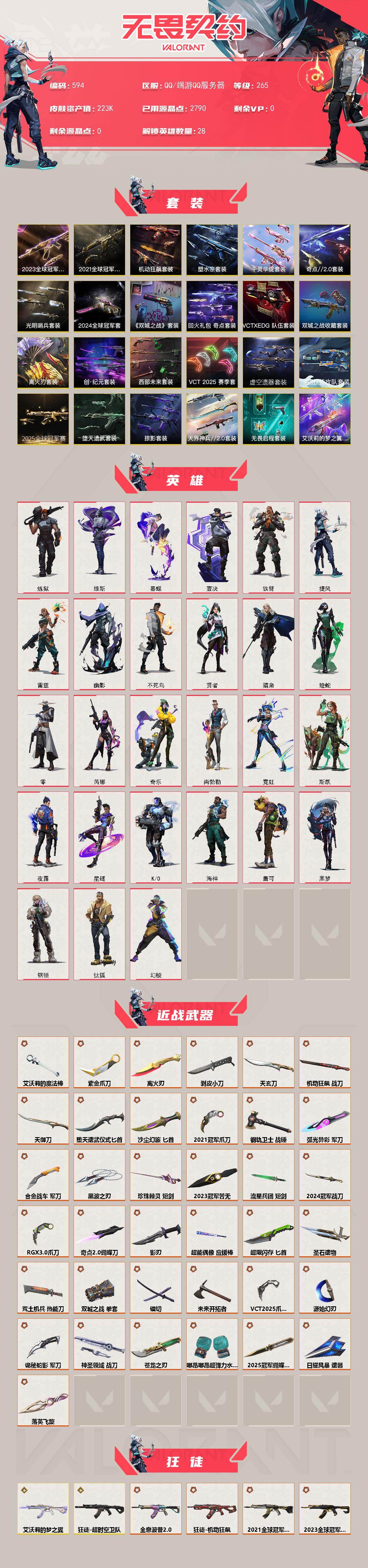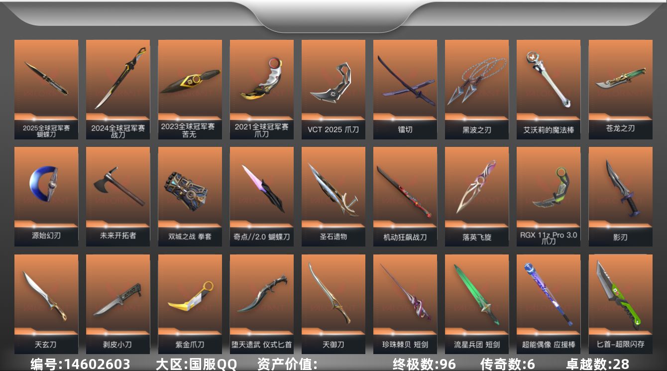 [14602603]【套装】:离火刃套装,2025全球冠军赛套装,2024全球冠军赛套装,2023全球冠军赛套装,2021全球冠军赛套装,艾沃莉的梦之翼套装,滋滋X特攻队套装,虚空遗器套装,VCT 2025 赛季套装,西部未来套装,创·纪元套装,塑水宗套装,离火刃套装,《英雄联盟:双城之战》套装,《双城之战》收藏套装,千灵华绽套装,光明哨兵套装,奇点//2.0套装,机动狂飙套装,VCTxEDG 队伍套装,回火礼包:奇点套装,掠影套装,天界神兵//2.0套装,堕天遗武套装,无畏启程套装 【英雄】:幻棱,炼狱,维斯,暮蝶,钛狐,壹决,铁臂,捷风,雷兹,幽影,不死鸟,贤者,猎枭,蝰蛇,零,芮娜,奇乐,尚勃勒,霓虹,斯凯,夜露,星礈,K/O,海神,盖可,黑梦,钢锁 【近战 武器】:近战武器-2025全球冠军赛 蝴蝶刀,近战武器-2024全球冠军赛 战刀,近战武器-2023全球冠军赛 苦无,近战武器-2021全球冠军赛 爪刀,近战武器-嘟昂嘟昂超弹力水球拳套,近战武器-5周年//公测重制版 苍龙之刃,近战武器-剥皮小刀,近战武器-奇点//2.0 蝴蝶刀,近战武器-VCT 2025 爪刀,近战武器-紫金爪刀,近战武器-RGX 11z Pro//3.0 爪刀,近战武器-离火刃,近战武器-黑波之刃,近战武器-落英飞旋,近战武器-镭切,近战武器-艾沃莉的魔法棒,近战武器-双城之战 拳套,近战武器-源始幻刃,近战武器-未来开拓者,近战武器-珍珠棘贝 短剑,近战武器-流星兵团 短剑,近战武器-超能偶像 应援棒,近战武器-超限闪存 匕首,近战武器-堕天遗武 仪式匕首,近战武器-钢轨卫士 战锤,近战武器-合金战车 军刀,近战武器-弧光异彩 军刀,近战武器-荒土机兵 热能刀,近战武器-机动狂飙 战刀,近战武器-沙尘幻旅 匕首,近战武器-圣石遗物,近战武器-天玄刀,近战武器-天御刀,近战武器-影刃,近战武器-诡秘蛇影 军刀,近战武器-神圣领域 战刀,近战武器-日耀风暴 遗器 【狂徒】:狂徒-艾沃莉的梦之翼,狂徒-超时空卫队,狂徒-2025全球冠军赛,狂徒-2023全球冠军赛,狂徒-2021全球冠军赛,狂徒-光明哨兵,狂徒-洪荒怒焰,狂徒-混沌序曲,狂徒-机动狂飙,狂徒-奇点//2.0,狂徒-全息波普//2.0,狂徒-双城之战,狂徒-塑水宗,狂徒-偃月苍龙,狂徒-创·纪元,狂徒-虚空遗器,狂徒-噬影者,狂徒-RGX