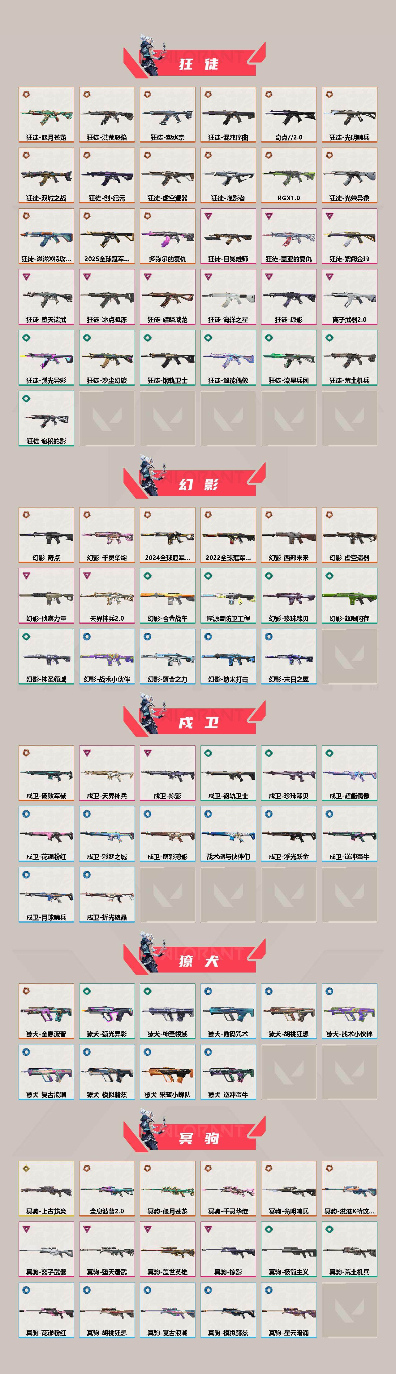 艾沃莉的梦之翼_狂徒,光明哨兵_狂徒,洪荒怒焰_幻影,混沌序曲_狂徒,机动狂飙_狂徒,奇点//2.0_狂徒,全息波普//2.0_幻影,双城之战_狂徒,塑水宗_狂徒,偃月苍龙_狂徒,创·纪元_狂徒,虚空遗器_幻影,噬影者_狂徒,冰点凝冻_狂徒,堕天遗武_狂徒,掠影_戍卫,盖亚的复仇_狂徒,海洋之星_戍卫,日冕雄师_獠犬,耀鳞威龙_狂徒,紫阙金琅_狂徒,奇点_幻影,千灵华绽_幻影,西部未来_幻影,虚空遗器_幻影,侦察力量_幻影,破败军械_戍卫,掠影_戍卫,天界神兵_戍卫,全息波普_獠犬