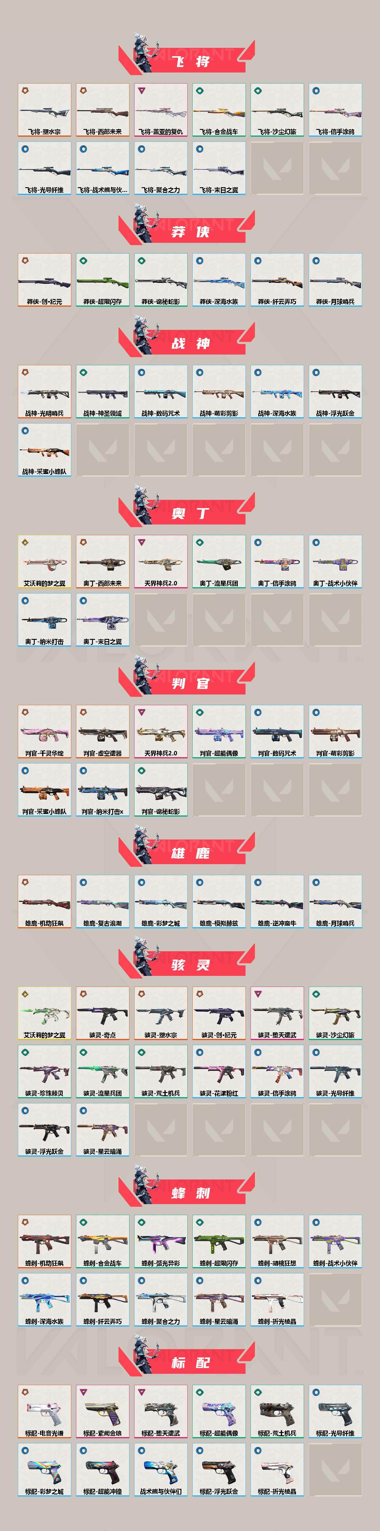 - [12713648]【套装】:《双城之战》收藏套装,黯夜怪谈套装,般若假面//2.0套装,掠影套装 【英雄】:幻棱,炼狱,维斯,暮蝶,钛狐,壹决,铁臂,捷风,雷兹,幽影,不死鸟,贤者,猎枭,蝰蛇,零,芮娜,奇乐,尚勃勒,霓虹,斯凯,夜露,星礈,K/O,海神,盖可,黑梦,钢锁 【近战 武器】:近战武器-RGX 11z Pro//3.0 爪刀,近战武器-落英飞旋,近战武器-鬼丸国纲,近战武器-双城之战 拳套,近战武器-流星兵团 短剑,近战武器-超能偶像 应援棒,近战武器-超限闪存 匕首,近战武器-荒土机兵 热能刀,近战武器-天玄刀,近战武器-夜刃诡镰,近战武器-影刃 【狂徒】:狂徒-双城之战,狂徒-塑水宗,狂徒-般若假面//2.0,狂徒-堕天遗武,狂徒-掠影,狂徒-紫阙金琅,狂徒-超能偶像,狂徒-荒土机兵,狂徒-流星兵团 【幻影】:幻影-黯夜怪谈,幻影-般若假面,幻影-紫阙金琅//2.0,幻影-超限闪存,幻影-聚合之力,幻影-纳米打击 【戍卫】:戍卫-掠影,戍卫-超能偶像,戍卫-浮光跃金,戍卫-逆冲蛮牛,戍卫-战术熊与伙伴们 【獠犬】:獠犬-黯夜怪谈,獠犬-般若假面//2.0,獠犬-采蜜小蜂队,獠犬-模拟赫兹,獠犬-逆冲蛮牛 【冥驹】:冥驹-堕天遗武,冥驹-掠影,冥驹-盖世英雄,冥驹-离子武器,冥驹-荒土机兵,冥驹-模拟赫兹 【飞将】:飞将-黯夜怪谈,飞将-聚合之力,飞将-战术熊与伙伴们 【莽侠】:莽侠-超限闪存,莽侠-纤云弄巧 【战神】:战神-般若假面//2.0,战神-采蜜小蜂队,战神-浮光跃金 【奥丁】:奥丁-流星兵团,奥丁-纳米打击 【判官】:判官-超能偶像,判官-采蜜小蜂队,判官-纳米打击x 【雄鹿】:雄鹿-模拟赫兹,雄鹿-逆冲蛮牛 【骇灵】:骇灵-荒土机兵,骇灵-流星兵团,骇灵-浮光跃金 【蜂刺】:蜂刺-超限闪存,蜂刺-聚合之力,蜂刺-纤云弄巧 【标配】:标配-黯夜怪谈,标配-超能偶像,标配-荒土机兵,标配-浮光跃金,标配-战术熊与伙伴们 【正义】:正义-掠影,正义-离子武器,正义-超限闪存,正义-复古浪潮,正义-纳米打击,正义-纤云弄巧 【鬼魅】:鬼魅-破败军械,鬼魅-流星兵团,鬼魅-采蜜小蜂队,鬼魅-光导纤维,鬼魅-模拟赫兹,鬼魅-星云暗涌 【狂怒】:狂怒-般若假面//2.0,狂怒-聚合之力,狂怒-逆冲蛮牛,狂怒-战术熊与伙伴们 【短炮】:短炮-梦魇恶魔,短炮-纤云弄巧 【