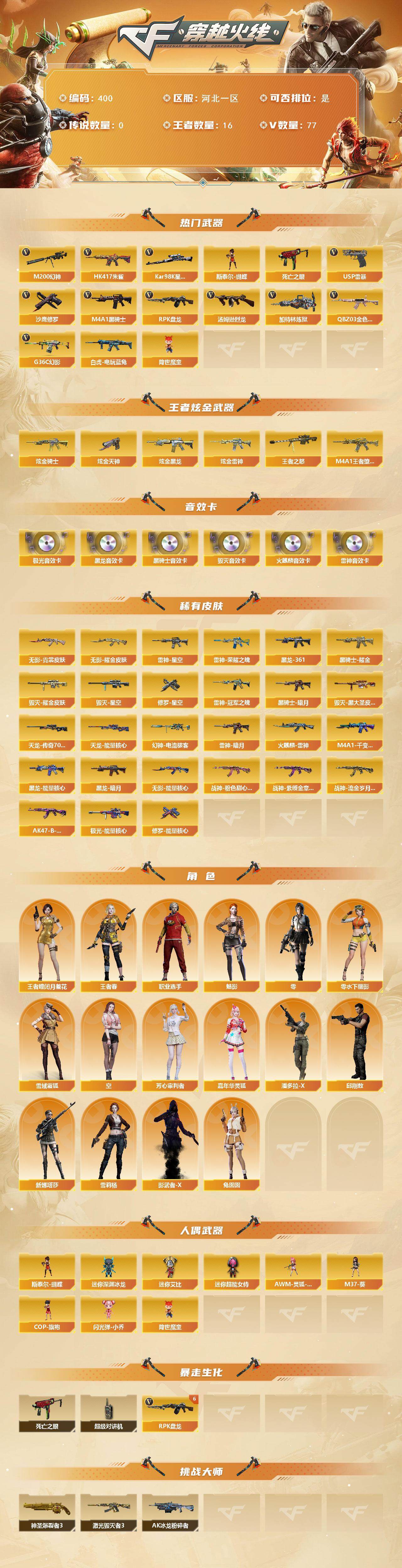 [14603578]河北一区-77V-16王者-4炫金 【热门武器】:G36C-幻影,QBZ03-金色蔷薇,HK417-朱雀,M200-幻神,死亡之眼,白虎-电玩蓝兔,Kar98K-星神,M4A1-黑骑士,汤姆逊-烈龙*2,RPK-盘龙*6,加特林-炼狱*3,斯泰尔-蝴蝶,降世魔童,USP-雷暴,沙鹰-修罗*3 【王者炫金武器】:M4A1-王者堕天神,王者之怒*2,炫金骑士,炫金黑龙,炫金雷神,炫金天神 【音效卡】:AK47-火麒麟音效卡,M4A1-雷神音效卡,M4A1-黑龙音效卡,M4A1-黑骑士音效卡,Barrett-毁灭音效卡,Barrett-极光音效卡 【皮肤】:幻神-电流骇客 皮肤,雷神-暗月,雷神-荣耀之魄,雷神-星空,雷神-冠军之魄,火麒麟-雷神,毁灭耀金皮肤,毁灭-星空,毁灭-黑大圣皮肤,M4A1-千变-孔明皮肤,黑龙-能量核心,黑龙-暗月,M4A1-黑龙-361,黑骑士-暗月,黑骑士耀金皮肤,无影-能量核心,无影耀金皮肤,无影-霓裳皮肤,战神-粉色甜心皮肤*2,战神-紫绶金章皮肤,战神-流金岁月皮肤*2,AK47-B-常胜将军-曹操*2,天龙-能量核心,AWM-天龙-传奇70KG,极光-能量核心,修罗-能量核心,修罗-星空 【角色】:零,魅影,王者-瞳-闭月羞花,王者春,雪域霜狐,空,芳心审判者,嘉年华灵狐,零-水下丽影,潘多拉-X,邱刚敖,兔囡囡,新娜塔莎,雪莉杨,影武者-X,职业选手 【人偶武器】:斯泰尔-蝴蝶,AWM-灵狐-15周年嘉年华*2,M37-葵,COP-旗袍,迷你深渊冰龙,闪光弹-小乔,迷你艾比,迷你超能女侍,降世魔童 【暴走生化】:死亡之眼,超级对讲机 【挑战大师】:神圣爆裂者III,AK47-冰龙粉碎者,激光毁灭者III 【英雄级武器】:M4A1-千变,AK47-火麒麟*3,M4A1-黑龙,M4A1-雷神,M4A1-黑骑士,AK47-无影*2,AK12-天启,AK47-雷暴,HK417-朱雀,G36C-幻影,黑武士-锦绣游龙,M4A1-玫瑰精灵,QBZ03-金色蔷薇,王者之心-觉醒版,王者之翼-觉醒版,王者之魄-觉醒版,王者之势-觉醒版,AK-47-猩红传说*2,AK47-B-战神*2,黑骑士-海王,白虎-电玩蓝兔,AWM-天龙*2,Barrett-毁灭,Barrett-极光,M200-幻神,Kar98K-星神,RPK-盘龙*6,加特林-炼狱*3