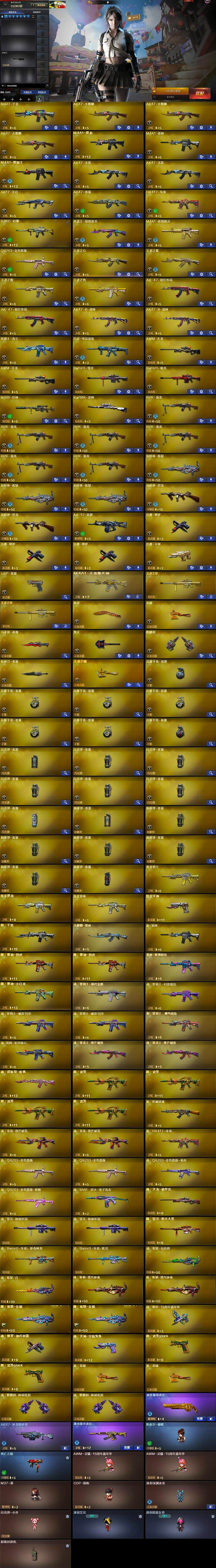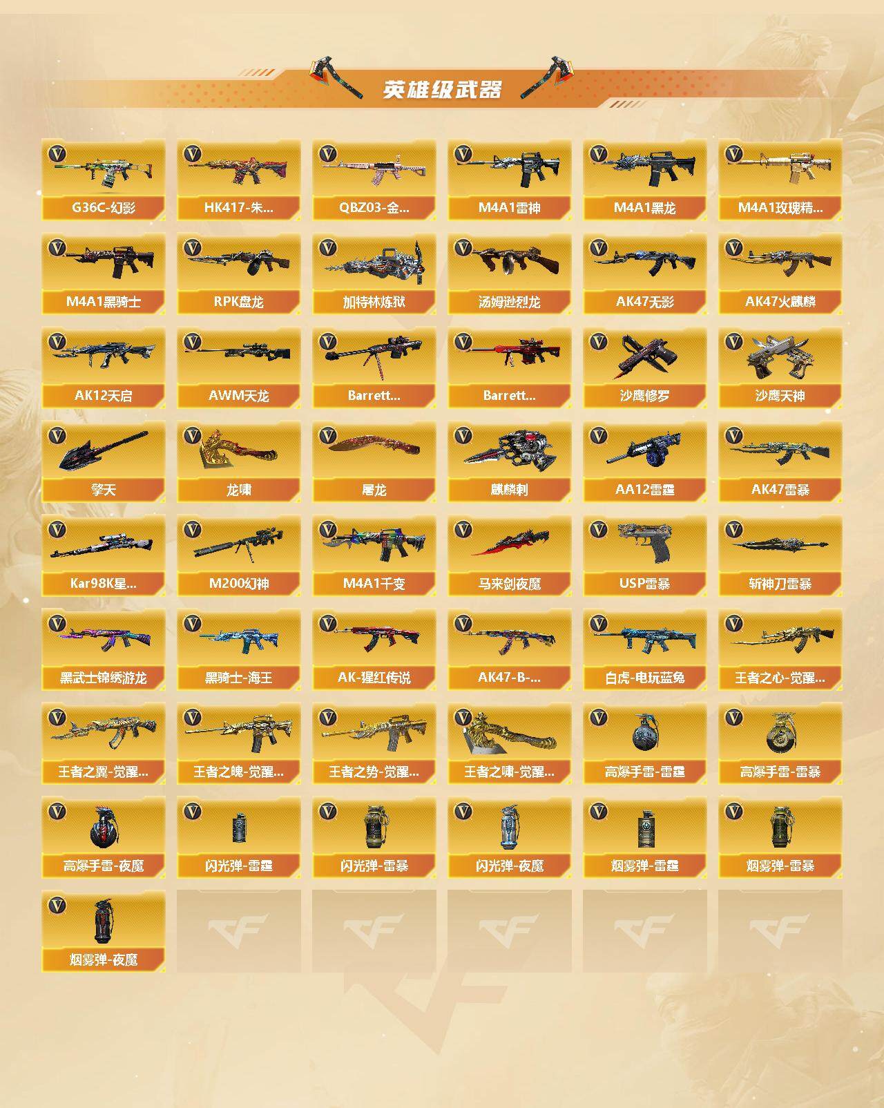 【英雄级武器】:M4A1-千变,AK47-火麒麟*3,M4A1-黑龙,M4A1-雷神,M4A1-黑骑士,AK47-无影*2,AK12-天启,AK47-雷暴,HK417-朱雀,G36C-幻影,黑武士-锦绣游龙,M4A1-玫瑰精灵,QBZ03-金色蔷薇,王者之心-觉醒版,王者之翼-觉醒版,王者之魄-觉醒版,王者之势-觉醒版,AK-47-猩红传说*2,AK47-B-战神*2,黑骑士-海王,白虎-电玩蓝兔,AWM-天龙*2,Barrett-毁灭,Barrett-极光,M200-幻神,Kar98K-星神,RPK-盘龙*6,加特林-炼狱*3