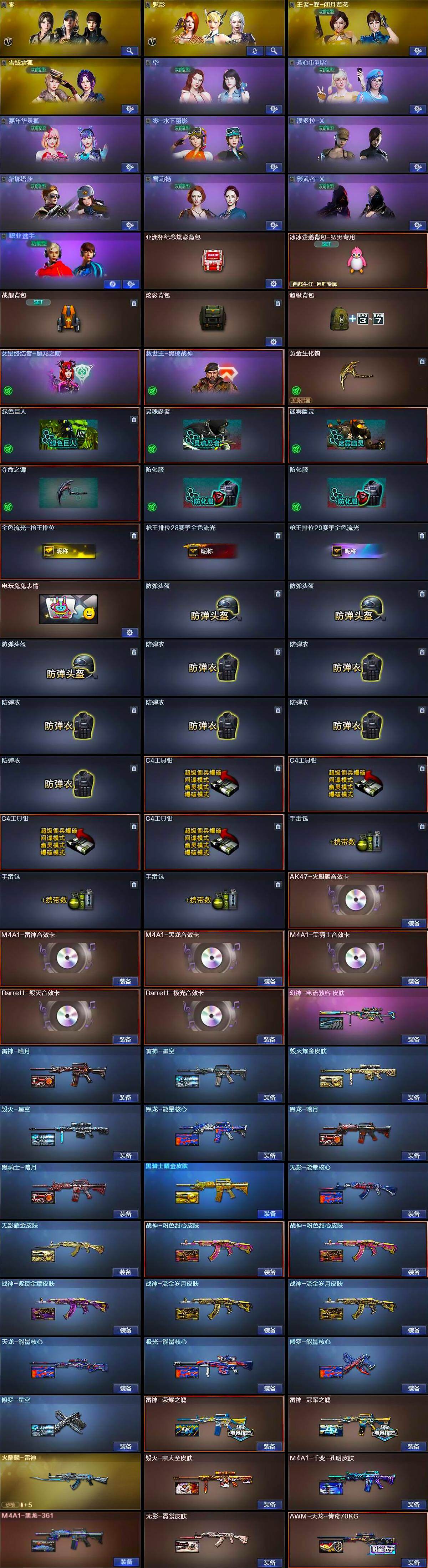 【皮肤】:幻神-电流骇客 皮肤,雷神-暗月,雷神-荣耀之魄,雷神-星空,雷神-冠军之魄,火麒麟-雷神,毁灭耀金皮肤,毁灭-星空,毁灭-黑大圣皮肤,M4A1-千变-孔明皮肤,黑龙-能量核心,黑龙-暗月,M4A1-黑龙-361,黑骑士-暗月,黑骑士耀金皮肤,无影-能量核心,无影耀金皮肤,无影-霓裳皮肤,战神-粉色甜心皮肤*2,战神-紫绶金章皮肤,战神-流金岁月皮肤*2,AK47-B-常胜将军-曹操*2,天龙-能量核心,AWM-天龙-传奇70KG,极光-能量核心,修罗-能量核心,修罗-星空