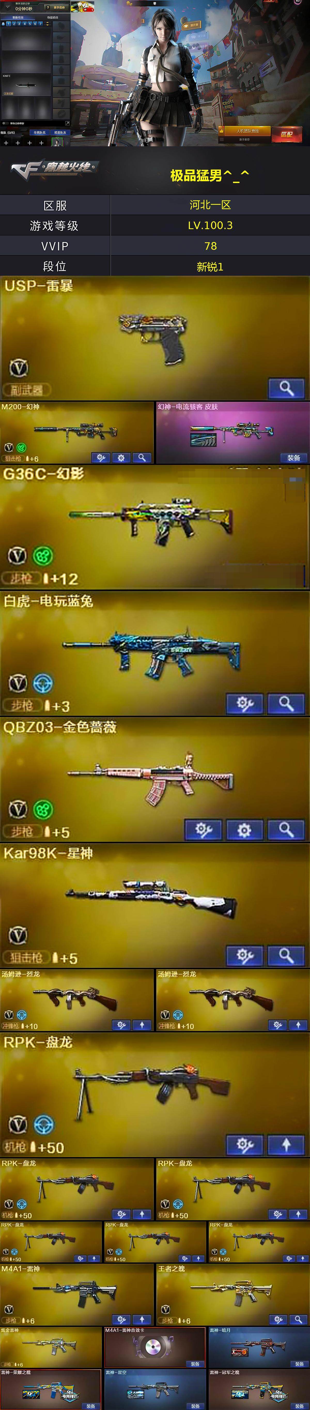 【热门武器】:G36C-幻影,QBZ03-金色蔷薇,HK417-朱雀,M200-幻神,死亡之眼,白虎-电玩蓝兔,Kar98K-星神,M4A1-黑骑士,汤姆逊-烈龙*2,RPK-盘龙*6,加特林-炼狱*3,斯泰尔-蝴蝶,降世魔童,USP-雷暴,沙鹰-修罗*3