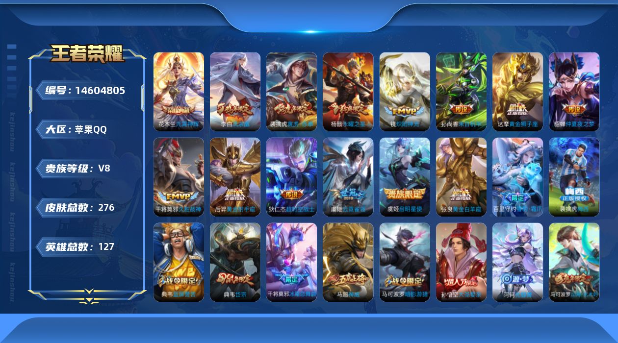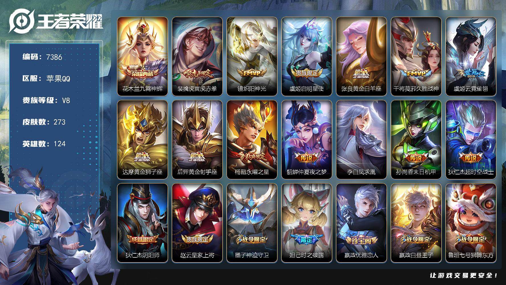 [14604805]苹果Q-V3-尊贵铂金II段位-124英雄-273皮肤-1典藏-0珍品无双-0无双-0珍品传说-13传说-82史诗