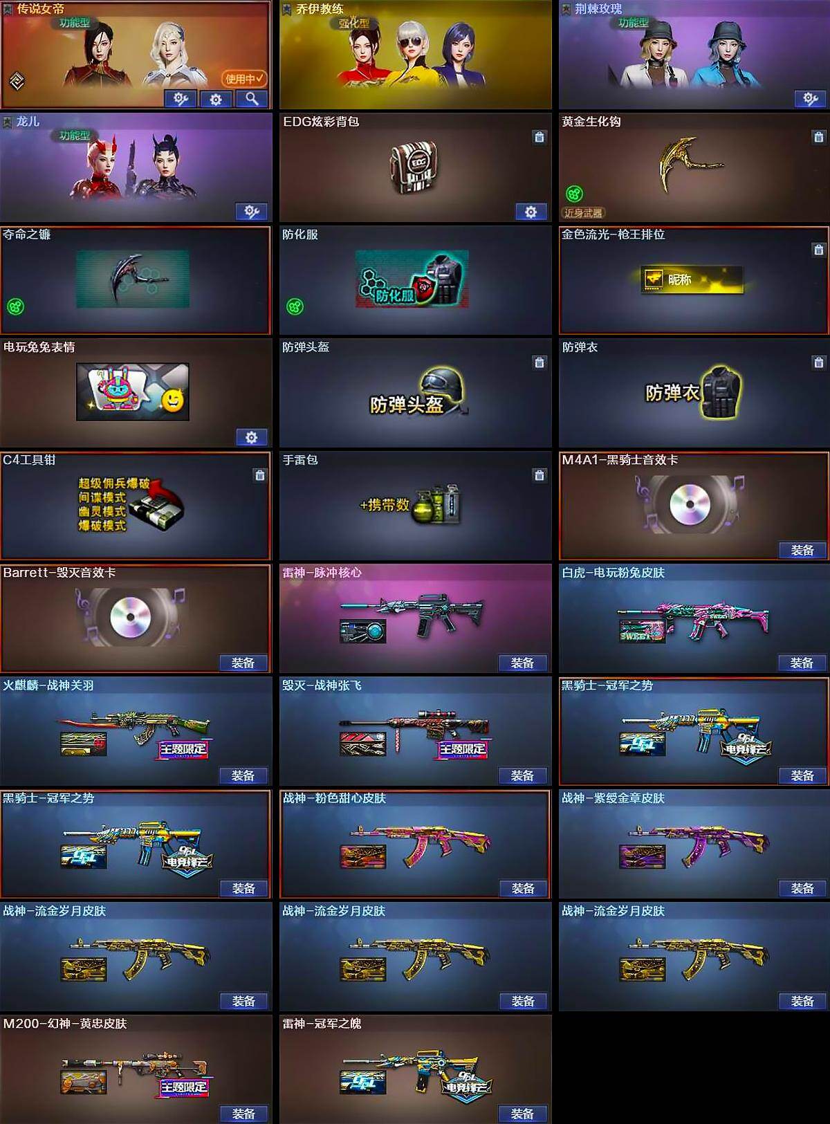 【道具】:EDG炫彩背包,黄金生化钩,夺命之镰,防化服,金色流光-枪王排位,电玩兔兔表情,防弹头盔,防弹衣,C4工具钳,手雷包