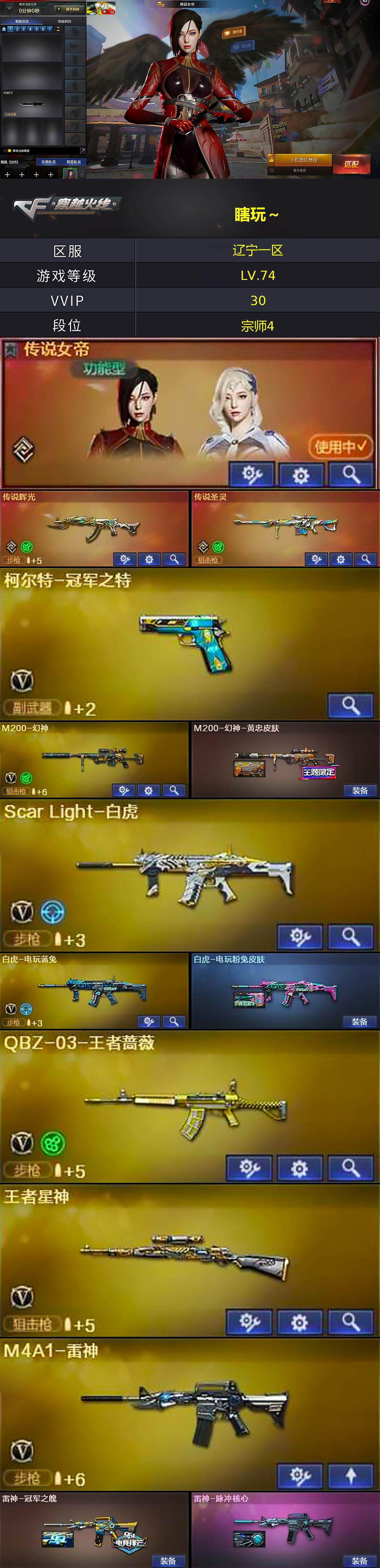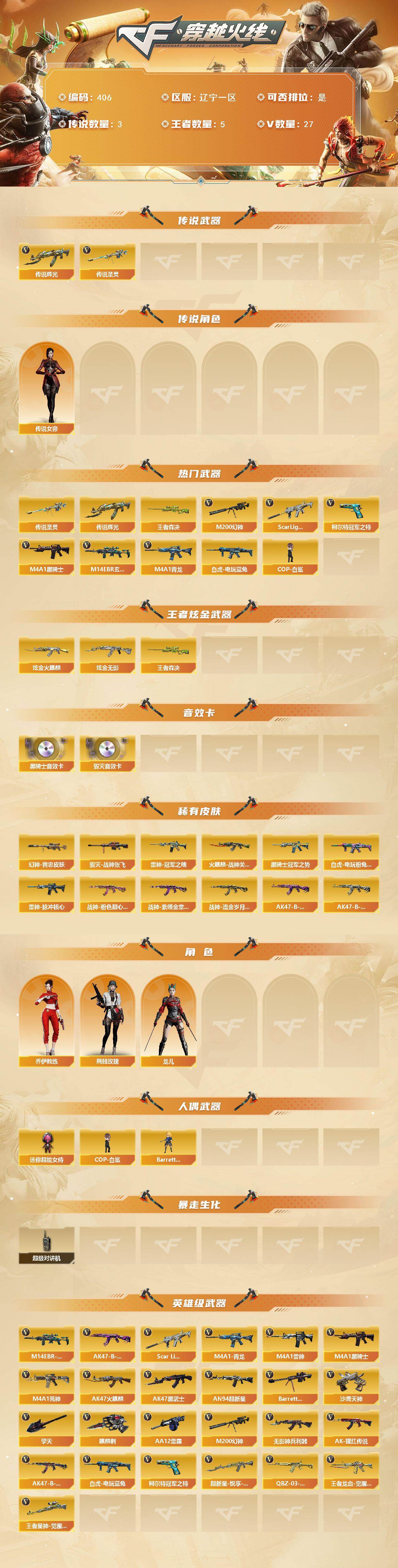 [14605452]辽宁一区-27V-5王者-2炫金 【传说武器】:传说辉光,传说圣灵 【传说角色】:传说女帝 【热门武器】:传说圣灵,传说辉光,王者森决,M14EBR-玄武,Scar Light-白虎,M4A1-青龙,M200-幻神,白虎-电玩蓝兔,柯尔特-冠军之特,M4A1-黑骑士,COP-白鲨 【王者炫金武器】:王者森决,炫金火麒麟,炫金无影 【音效卡】:M4A1-黑骑士音效卡,Barrett-毁灭音效卡 【皮肤】:M200-幻神-黄忠皮肤,白虎-电玩粉兔皮肤,雷神-冠军之魄,雷神-脉冲核心,火麒麟-战神关羽,毁灭-战神张飞,黑骑士-冠军之势*2,战神-粉色甜心皮肤,战神-紫绶金章皮肤,战神-流金岁月皮肤*3,AK47-B-常胜将军-曹操*3,AK47-B-常胜将军-刘备*2 【角色】:乔伊教练,荆棘玫瑰,龙儿 【人偶武器】:COP-白鲨,Barrett-曼陀罗,迷你超能女侍 【暴走生化】:超级对讲机 【英雄级武器】:AK47-火麒麟,M4A1-雷神,M4A1-黑骑士,M4A1-死神,AK47-黑武士,AN94-超新星,M4A1-青龙,Scar Light-白虎,M14EBR-玄武,无影-神兵利器,超新星-悦享-觉醒版,AK-47-猩红传说,AK47-B-战神,AK47-B-常胜将军,QBZ-03-王者蔷薇-觉醒版,王者龙血-觉醒版,白虎-电玩蓝兔,Barrett-毁灭,M200-幻神,王者星神-觉醒版,AA-12-雷霆,沙鹰-天神,柯尔特-冠军之特,擎天,麒麟刺*2 【道具】:EDG炫彩背包,黄金生化钩,夺命之镰,防化服,金色流光-枪王排位,电玩兔兔表情,防弹头盔,防弹衣,C4工具钳,手雷包 【特殊枪械】:1白虎,1黑骑士