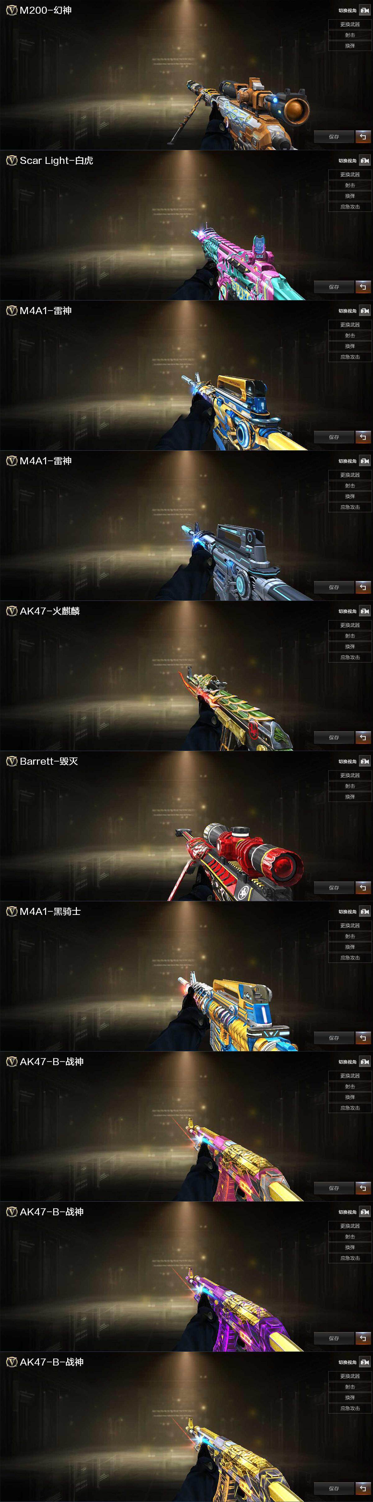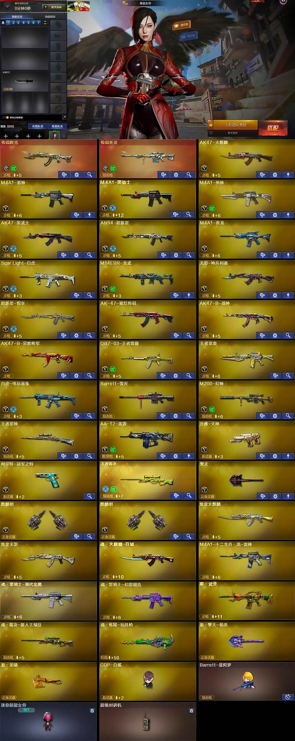 【英雄级武器】:AK47-火麒麟,M4A1-雷神,M4A1-黑骑士,M4A1-死神,AK47-黑武士,AN94-超新星,M4A1-青龙,Scar Light-白虎,M14EBR-玄武,无影-神兵利器,超新星-悦享-觉醒版,AK-47-猩红传说,AK47-B-战神,AK47-B-常胜将军,QBZ-03-王者蔷薇-觉醒版,王者龙血-觉醒版,白虎-电玩蓝兔,Barrett-毁灭,M200-幻神,王者星神-觉醒版,AA-12-雷霆,沙鹰-天神,柯尔特-冠军之特,擎天,麒麟刺*2