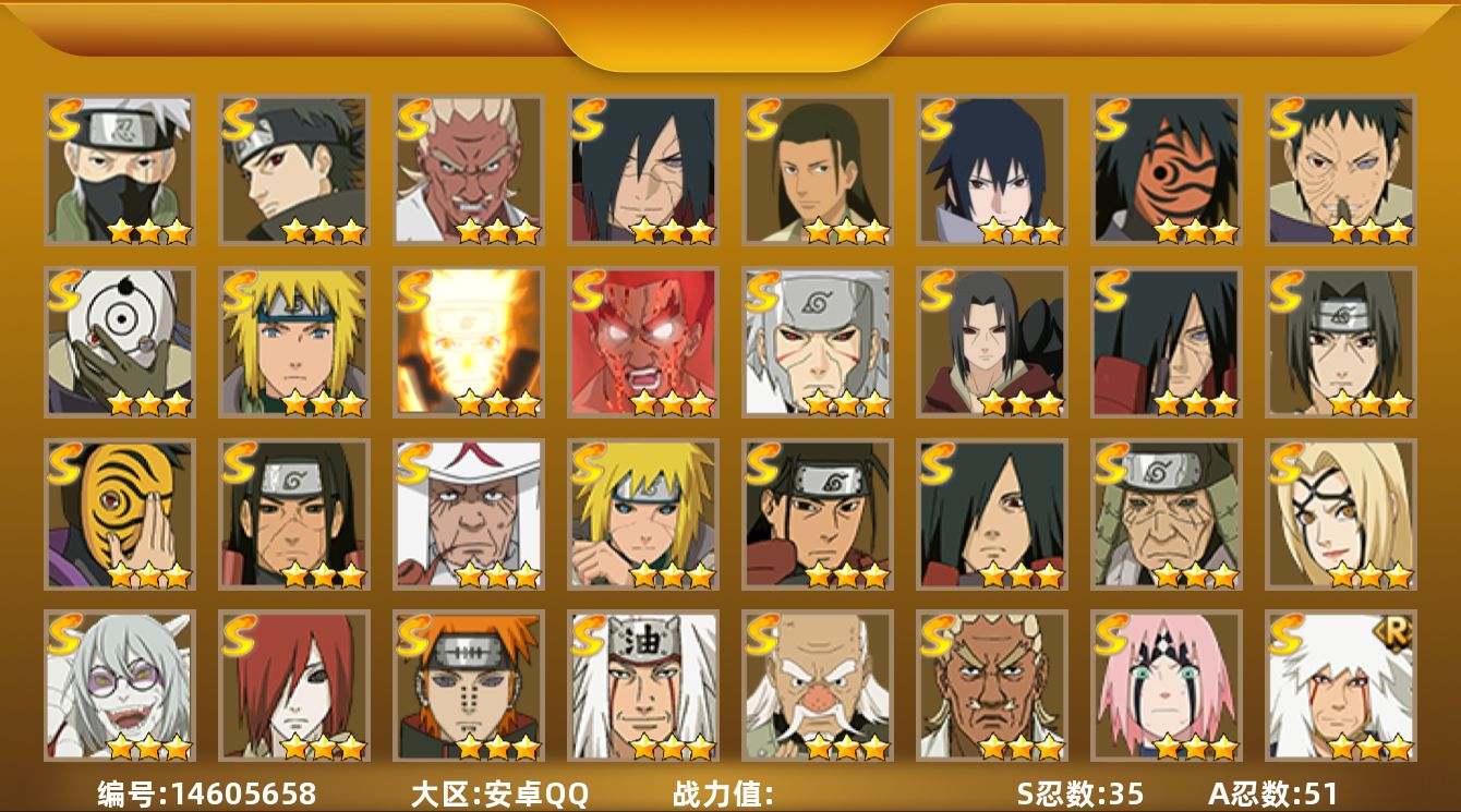 【S级忍者】:长门「秽土转生」(3星),猿飞日斩「秽土转生」(3星),波风水门「秽土转生」(3星),千手扉间「秽土转生」(3星),千手柱间「秽土转生」(3星),宇智波鼬「秽土转生」(3星),宇智波斑「秽土转生」(3星),宇智波斑「秽土转生·解」(3星),大野木「忍界大战」(3星),春野樱「忍界大战」(3星),宇智波带土「忍界大战」(3星),艾「忍界大战」(3星),宇智波鼬「须佐能乎」(3星),宇智波止水「须佐能乎」(3星),旗木卡卡西「须佐能乎」(3星),千手柱间「木叶创立」(3星),艾「四代目雷影」(3星),自来也(3星),自来也「舞之豪杰」(3星),大蛇丸(3星),自来也「传说中的三忍」(3星),纲手「百豪」(3星),千手柱间(3星),猿飞日斩(3星),宇智波斑(3星),波风水门(3星),药师兜「仙人模式」(3星),神秘面具男(3星),神秘面具男「红夜之刃」(3星),漩涡鸣人「九喇嘛连结」(3星),迈特凯「死门」(3星),佩恩「天道」(3星),宇智波佐助「永恒万花筒」(3星),宇智波斑 「白面具」(3星宇智波斑「白面具」),波风水门「九喇嘛连结」(3星)