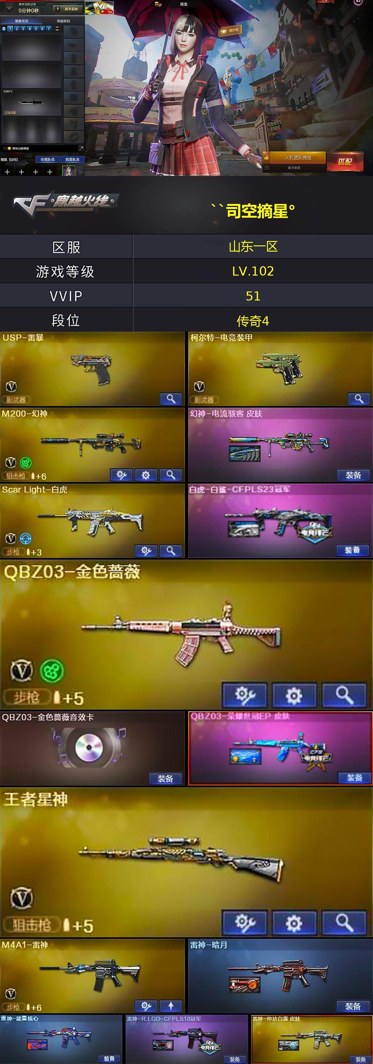 - [11522102]1传说角色 20V武器 可二次 可修改实名 优质装备:M200-幻神,M200-竞技荣光,柯尔特-竞技荣光,USP-雷暴,擎天-竞技荣光,幻灵之锋,龙啸-烈火龙威,擎天-云海游龙,烈龙-云海游龙,无影-神兵利器 排位资格:有 王者武器:王者之魄-觉醒版 热门武器:裁决-雪莉杨