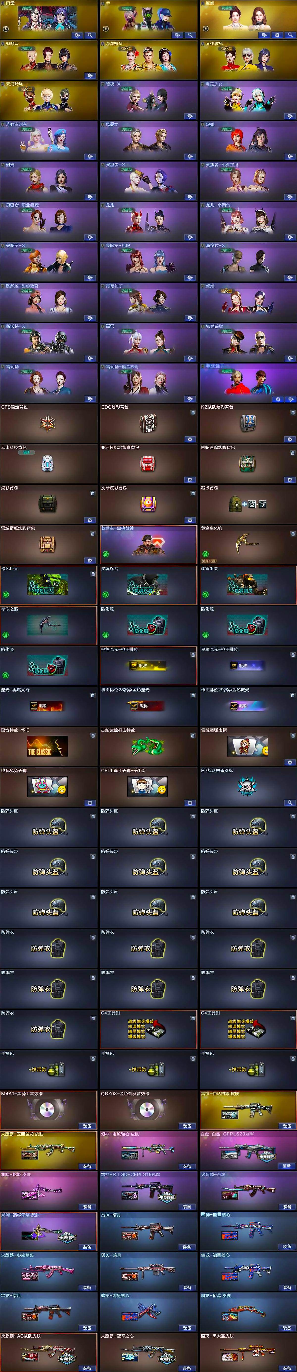 【皮肤】:幻神-电流骇客 皮肤,白虎-白鲨-CFPLS23冠军,QBZ03-荣耀世冠EP 皮肤,雷神-暗月,雷神-能量核心,雷神-R.LGD-CFPLS18冠军,雷神-仲达白露 皮肤,火麒麟-AG战队皮肤,火麒麟-冠军之心,火麒麟-百城,火麒麟-心动糖果,火麒麟-玉面羞花 皮肤,毁灭-暗月,毁灭-黑大圣皮肤,毁灭-英雄计划 皮肤,黑龙-能量核心,黑龙-暗月,修罗-能量核心,屠龙-惊鸿 皮肤,龙啸-蛇姬 皮肤,龙啸-巅峰荣耀 皮肤