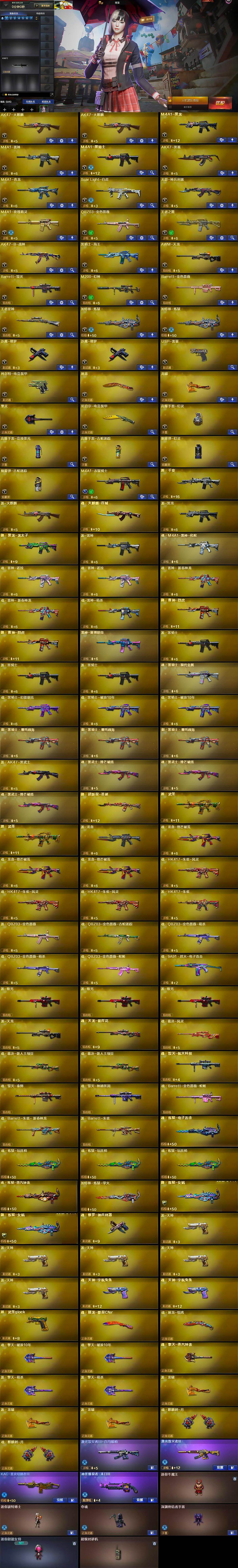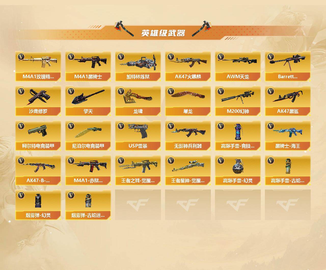 【英雄级武器】:AK47-火麒麟*2,M4A1-黑龙,M4A1-雷神,M4A1-黑骑士,AK47-黑鲨,M4A1-青龙,Scar Light-白虎,无影-神兵利器,M4A1-玫瑰精灵,QBZ03-金色蔷薇,王者之戮-觉醒版,AK47-B-战神,黑骑士-海王,AWM-天龙,Barrett-毁灭,M200-幻神,Barrett-金色蔷薇,王者星神-觉醒版,加特林-炼狱*2,沙鹰-修罗*2,USP-雷暴,柯尔特-电竞装甲,屠龙,龙啸,擎天,尼泊尔-电竞装甲,高爆手雷-幻灵,高爆手雷-竞技荣光,高爆手雷-古蛇迷踪,烟雾弹-幻灵,烟雾弹-古蛇迷踪,M4A1-赤狱骑士