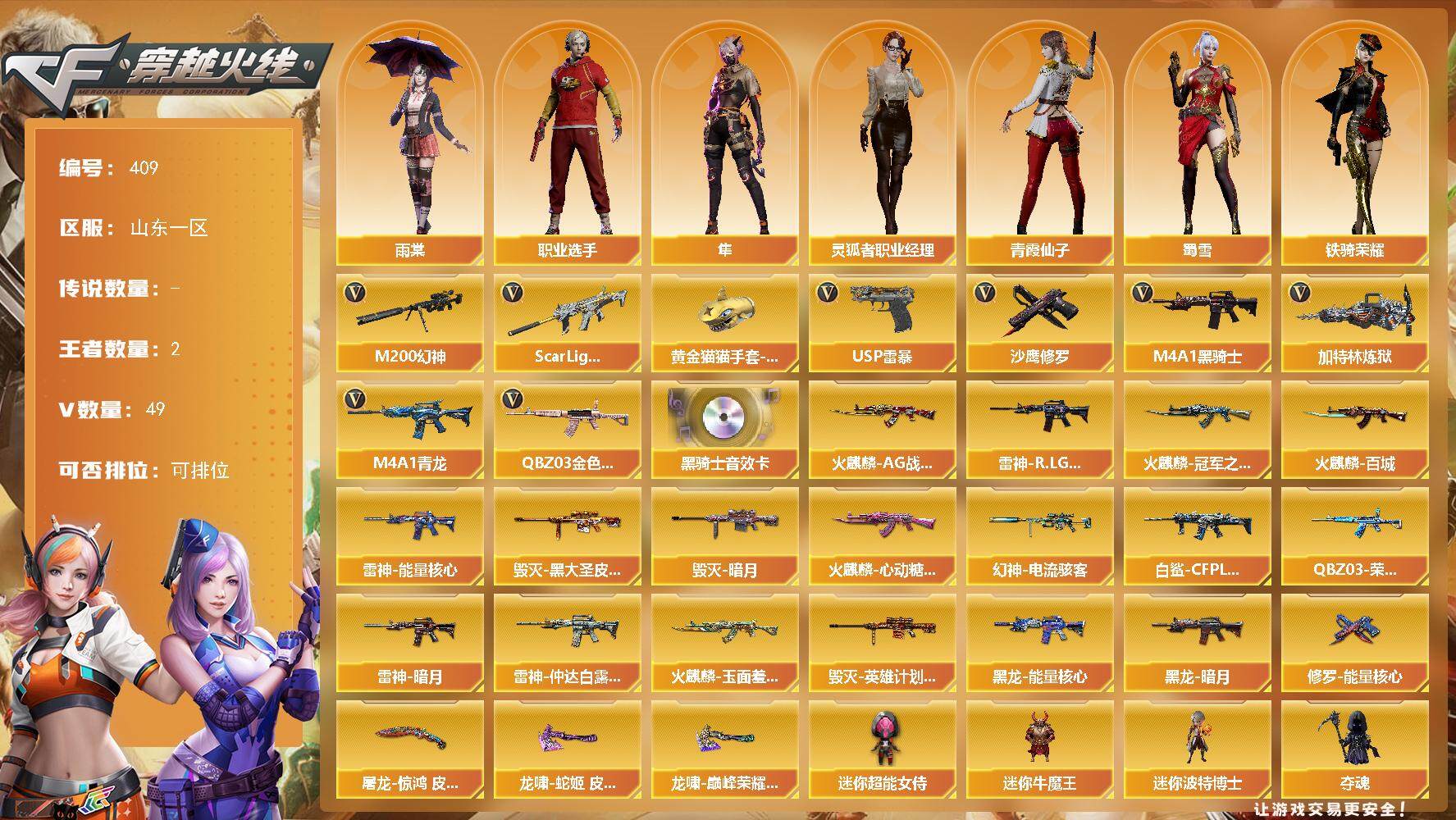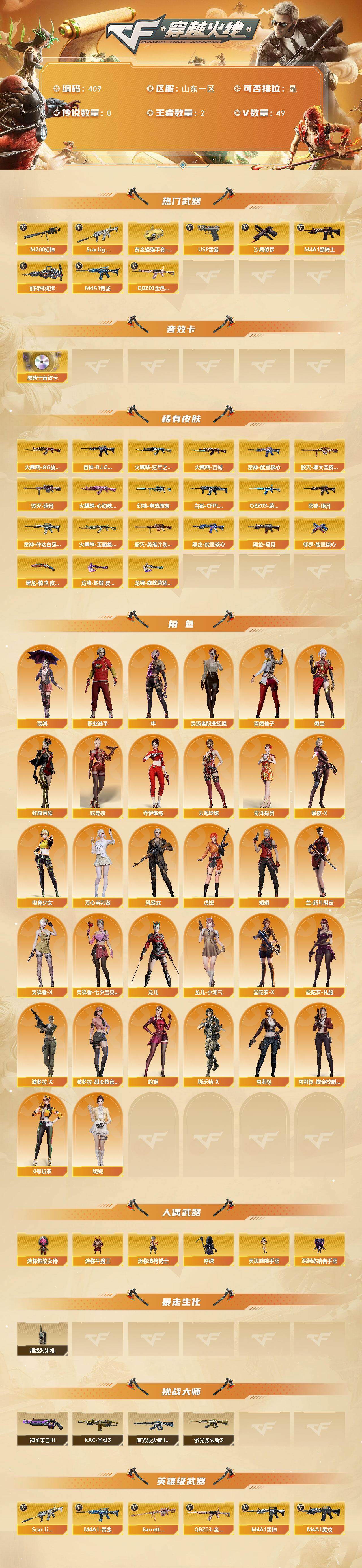 [14606393]山东一区-49V-2王者-0炫金 【热门武器】:QBZ03-金色蔷薇,Scar Light-白虎,M4A1-青龙,M200-幻神,M4A1-黑骑士,加特林-炼狱*2,USP-雷暴,沙鹰-修罗*2,黄金猫猫手套-白鲨 【音效卡】:M4A1-黑骑士音效卡 【皮肤】:幻神-电流骇客 皮肤,白虎-白鲨-CFPLS23冠军,QBZ03-荣耀世冠EP 皮肤,雷神-暗月,雷神-能量核心,雷神-R.LGD-CFPLS18冠军,雷神-仲达白露 皮肤,火麒麟-AG战队皮肤,火麒麟-冠军之心,火麒麟-百城,火麒麟-心动糖果,火麒麟-玉面羞花 皮肤,毁灭-暗月,毁灭-黑大圣皮肤,毁灭-英雄计划 皮肤,黑龙-能量核心,黑龙-暗月,修罗-能量核心,屠龙-惊鸿 皮肤,龙啸-蛇姬 皮肤,龙啸-巅峰荣耀 皮肤 【角色】:雨棠,隼,妮妮,蛇隐宗,奇洋探员,乔伊教练,云海玲珑,暗夜-X,电竞少女,芳心审判者,风暴女,虎妞,娟娟,兰-新年限定,0号玩家,灵狐者-X,灵狐者-七夕宝贝,灵狐者-职业经理,龙儿,龙儿-小淘气,曼陀罗-X,曼陀罗-礼服,潘多拉-X,潘多拉-甜心教官,青霞仙子,蛇姬,斯沃特-X,蜀雪,铁骑荣耀,雪莉杨,雪莉杨-摸金校尉,职业选手 【人偶武器】:迷你牛魔王,迷你波特博士,夺魂,深渊终结者手雷,迷你超能女侍,灵狐娃娃手雷 【暴走生化】:超级对讲机 【挑战大师】:激光毁灭者III-白马银枪,激光毁灭者III,KAC-圣炎切割者III,神圣爆裂者-末日III 【英雄级武器】:AK47-火麒麟*2,M4A1-黑龙,M4A1-雷神,M4A1-黑骑士,AK47-黑鲨,M4A1-青龙,Scar Light-白虎,无影-神兵利器,M4A1-玫瑰精灵,QBZ03-金色蔷薇,王者之戮-觉醒版,AK47-B-战神,黑骑士-海王,AWM-天龙,Barrett-毁灭,M200-幻神,Barrett-金色蔷薇,王者星神-觉醒版,加特林-炼狱*2,沙鹰-修罗*2,USP-雷暴,柯尔特-电竞装甲,屠龙,龙啸,擎天,尼泊尔-电竞装甲,高爆手雷-幻灵,高爆手雷-竞技荣光,高爆手雷-古蛇迷踪,烟雾弹-幻灵,烟雾弹-古蛇迷踪,M4A1-赤狱骑士 【道具】:CFS限定背包,EDG炫彩背包,KZ战队炫彩背包,云山科技背包,亚洲杯纪念炫彩背包,古蛇迷踪炫彩背包,炫彩背包,虎牙炫彩背包,超级背包,雪域霜狐炫彩背包,救世主-黑桃战