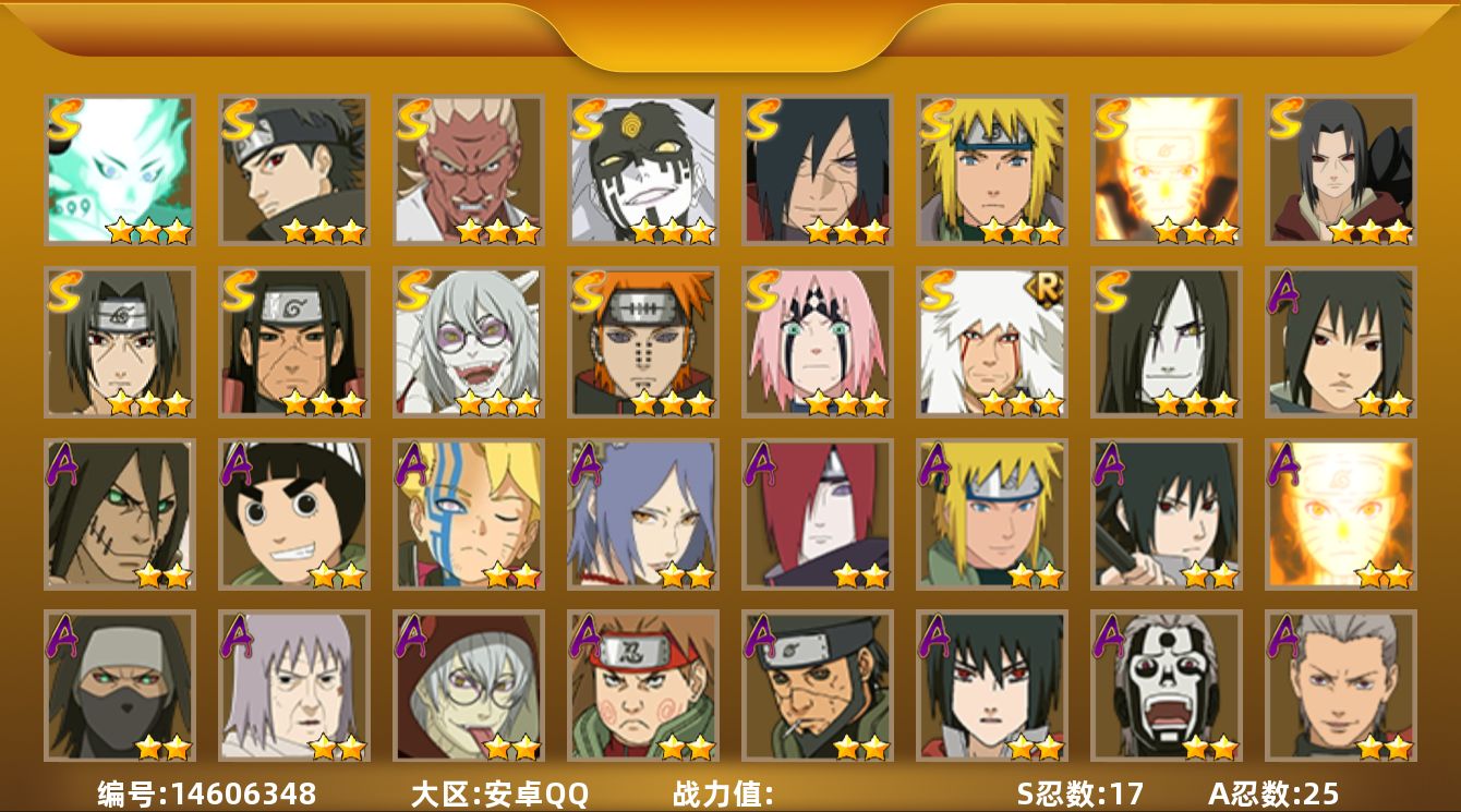 [14606348]17S级忍者数-25A级忍者数 【S级忍者】:千手柱间「秽土转生」(3星),宇智波鼬「秽土转生」(3星),宇智波斑「秽土转生·解」(3星),春野樱「忍界大战」(3星),艾「忍界大战」(3星),宇智波鼬「须佐能乎」(3星),宇智波止水「须佐能乎」(3星),自来也「舞之豪杰」(3星),大蛇丸(3星),波风水门(3星),药师兜「仙人模式」(3星),漩涡鸣人「九喇嘛连结」(3星),佩恩「天道」(3星),大筒木桃式(3星),大筒木舍人「最终章」(3星),漩涡鸣人「暴怒·第六尾」(3星),波风水门「九喇嘛连结」(3星) 【A级忍者】:长门「青年」(2星),波风水门「青年」(2星),飞段(2星),飞段「死司凭血」(2星),干柿鬼鲛(5星),漩涡博人「桃式显现」(2星),漩涡鸣人「九尾查克拉」(2星),迈特凯(5星),桃地再不斩「秽土转生」(2星),我爱罗「疾风传」(3星),蝎(3星),小南「漂泊浪客」(2星),角都「晓创生」(2星),角都「秽土转生」(2星),猿飞阿斯玛(5星),猿飞阿斯玛「秽土转生」(2星),宇智波佐助「须佐能乎」(2星),宇智波佐助「万花筒写轮眼」(2星),药师兜「半蛇斗篷」(2星),李洛克「忍界大战」(2星),黑土「博人传」(2星),秋道丁次「忍界大战」(2星),千代「近松十人卫」(2星),神农「羁绊」(2星),宇智波泉奈(2星)