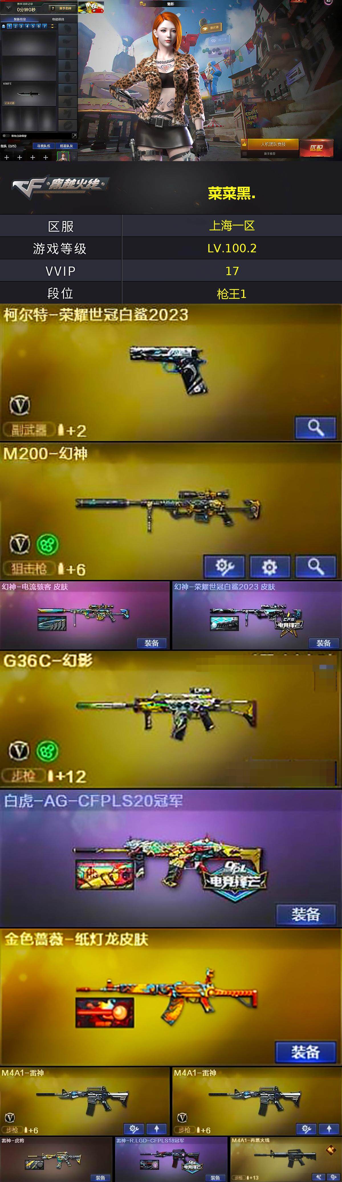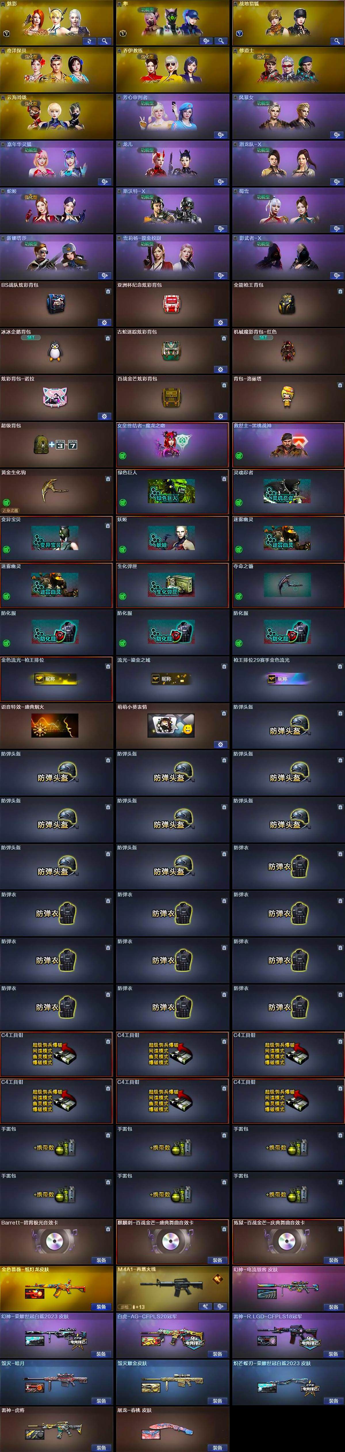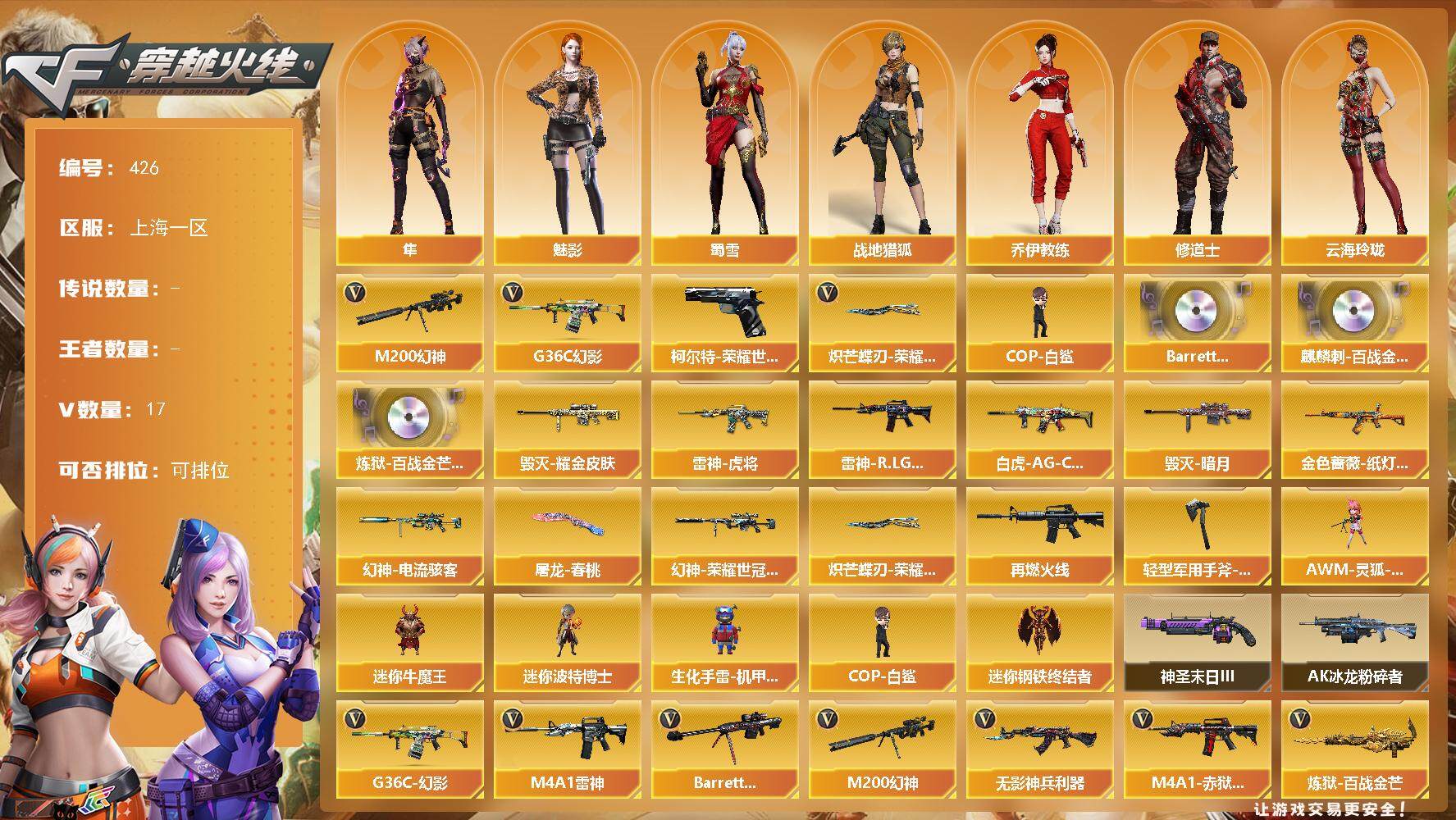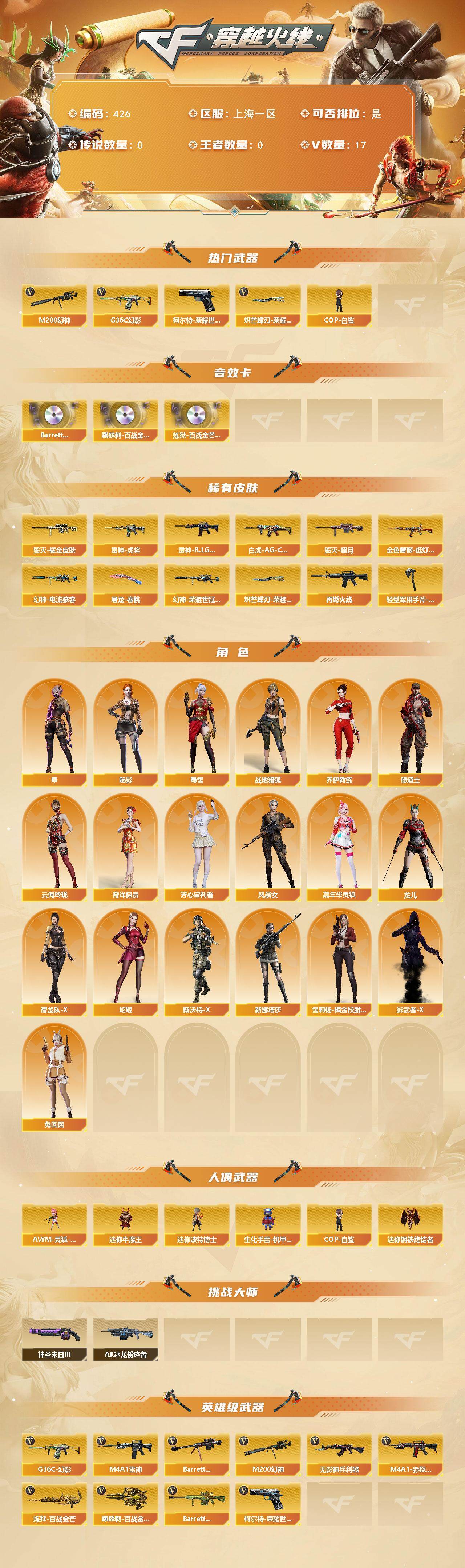 [14610809]上海一区-17V-0王者-0炫金 【热门武器】:G36C-幻影,M200-幻神,柯尔特-荣耀世冠白鲨2023,COP-白鲨,炽芒蝶刃-荣耀世冠白鲨2023 皮肤 【音效卡】:Barrett-碧霄极光音效卡,麒麟刺-百战金芒-盛典舞曲音效卡,炼狱-百战金芒-庆典舞曲音效卡 【皮肤】:幻神-电流骇客 皮肤,幻神-荣耀世冠白鲨2023 皮肤,白虎-AG-CFPLS20冠军,金色蔷薇-纸灯龙皮肤,雷神-虎将,雷神-R.LGD-CFPLS18冠军,M4A1-再燃火线,毁灭-暗月,毁灭耀金皮肤,屠龙-春桃 皮肤,轻型军用手斧-再燃火线,炽芒蝶刃-荣耀世冠白鲨2023 皮肤 【角色】:魅影,隼,战地猎狐,奇洋探员,乔伊教练,修道士,云海玲珑,芳心审判者,风暴女,嘉年华灵狐,龙儿,潜龙队-X,蛇姬,斯沃特-X,蜀雪,兔囡囡,新娜塔莎,雪莉杨-摸金校尉,影武者-X 【人偶武器】:COP-白鲨,迷你钢铁终结者,AWM-灵狐-15周年嘉年华,迷你牛魔王,迷你波特博士,生化手雷-机甲核心*3 【挑战大师】:AK47-冰龙粉碎者,神圣爆裂者-末日III 【英雄级武器】:M4A1-雷神*2,无影-神兵利器,G36C-幻影,Barrett-毁灭,M200-幻神,炼狱-百战金芒,柯尔特-荣耀世冠白鲨2023,麒麟刺-百战金芒,M4A1-赤狱骑士,Barrett-碧霄极光 【道具】:BS战队炫彩背包,亚洲杯纪念炫彩背包,全能枪王背包,冰冰企鹅背包,古蛇迷踪炫彩背包,机械魔影背包-红色,炫彩背包-诺拉,百战金芒炫彩背包,背包-洛丽塔,超级背包,女皇终结者-魔龙之吻,救世主-黑桃战神,黄金生化钩,绿色巨人,灵魂忍者,变异宝贝,妖姬,迷雾幽灵*2,生化弹匣,夺命之镰,防化服*3,金色流光-枪王排位,流光-鎏金之域,枪王排位29赛季金色流光,语音特效-盛典烟火,萌萌小葵表情,防弹头盔*9,防弹衣*10,C4工具钳*6,手雷包*6 【特殊枪械】: