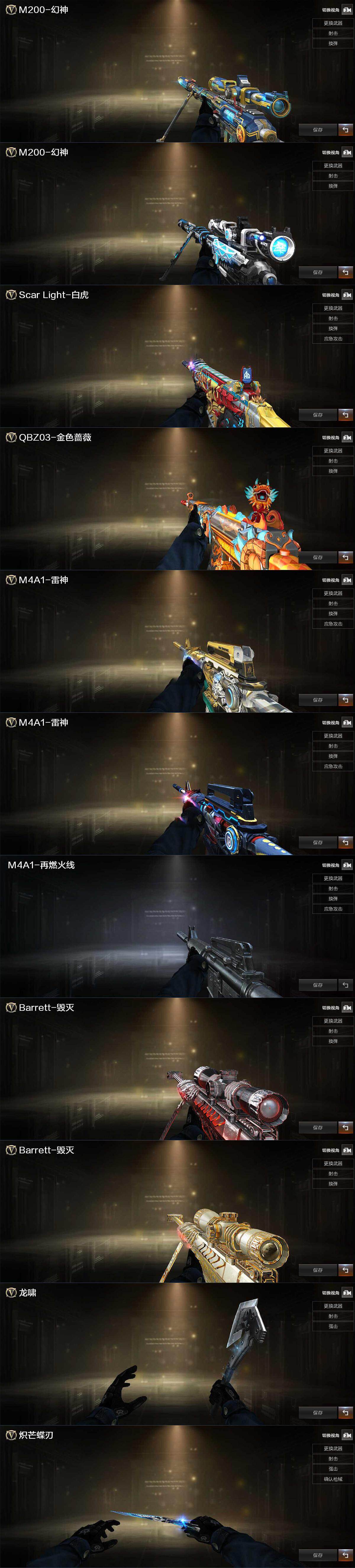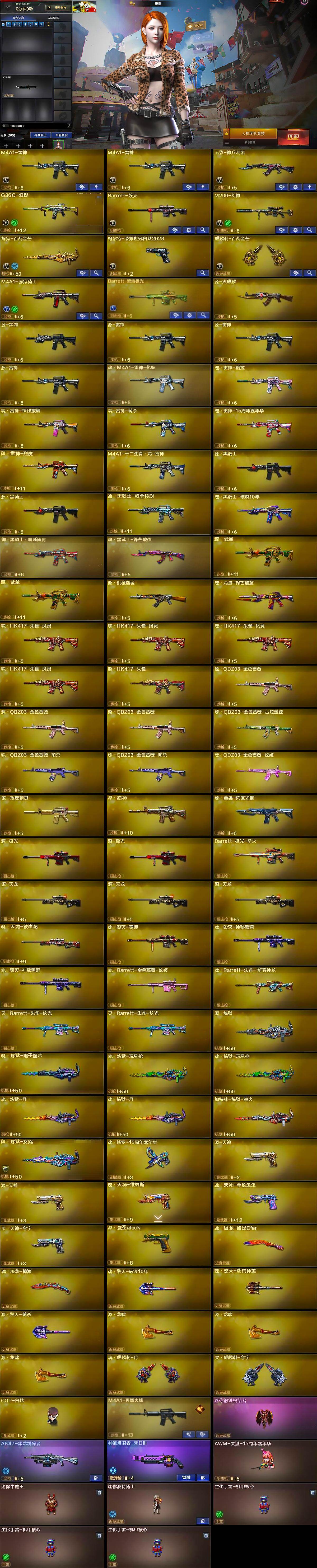 【英雄级武器】:M4A1-雷神*2,无影-神兵利器,G36C-幻影,Barrett-毁灭,M200-幻神,炼狱-百战金芒,柯尔特-荣耀世冠白鲨2023,麒麟刺-百战金芒,M4A1-赤狱骑士,Barrett-碧霄极光