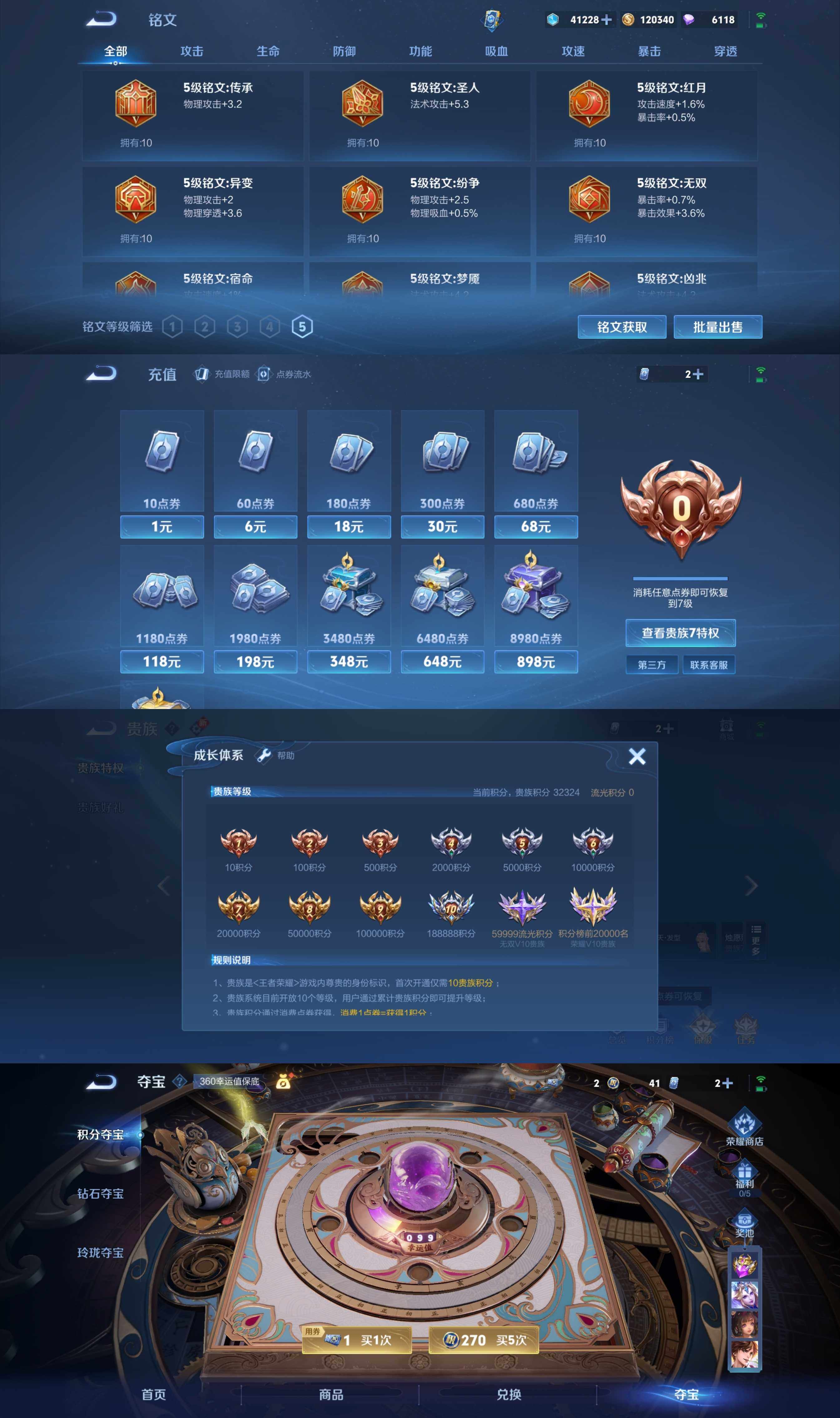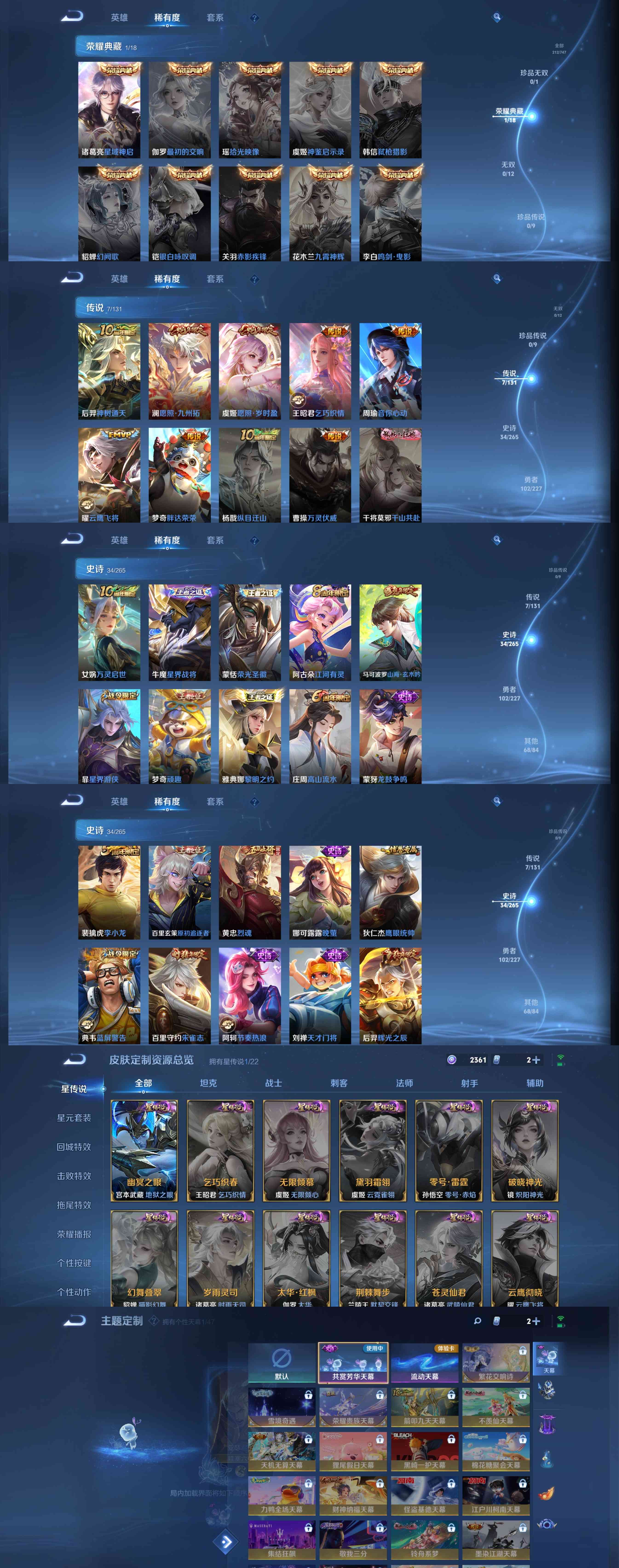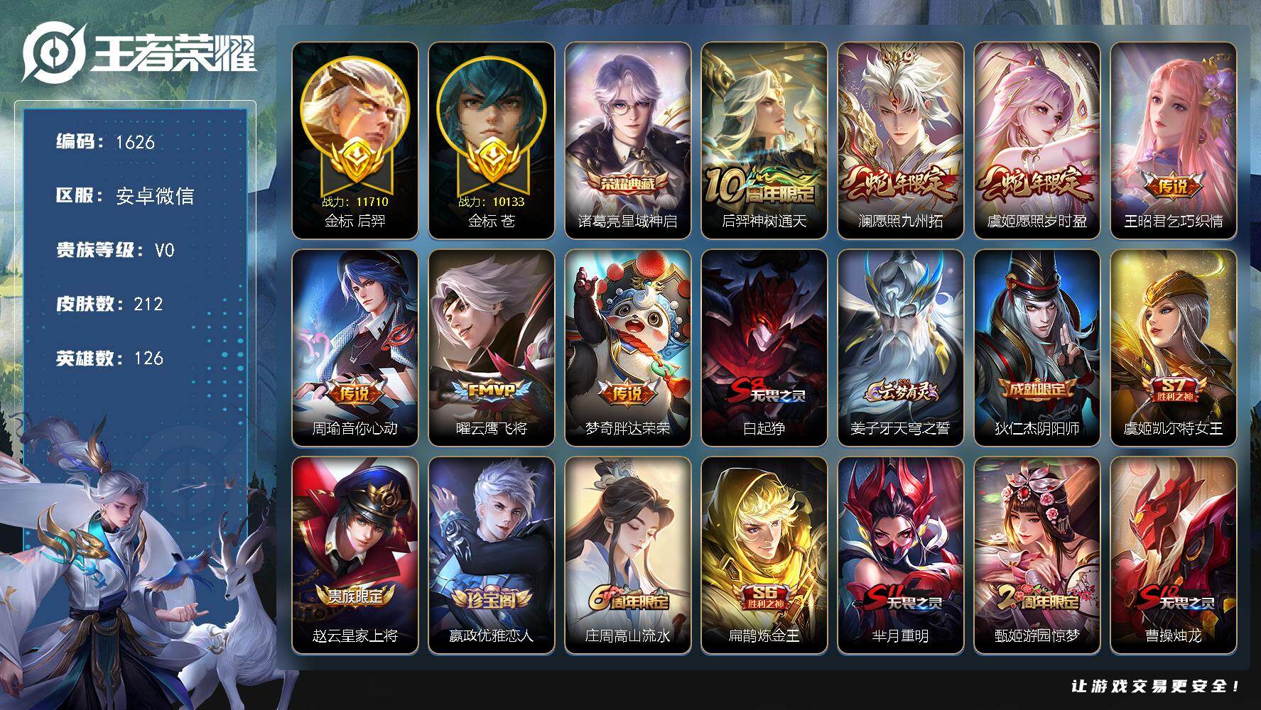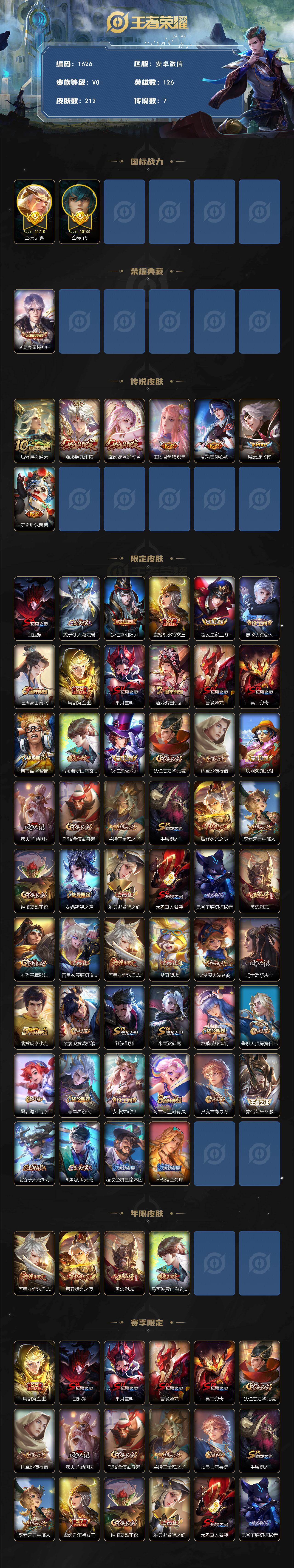 [14611278]安卓WX-发育路51段,金标万战后裔,金标万战苍-最强王者段位-126英雄-212皮肤-1典藏皮肤-7传说-34史诗 【荣耀典藏】:诸葛亮星域神启 【传说皮肤】:后羿神树通天,澜愿照九州拓,虞姬愿照岁时盈,王昭君乞巧织情,周瑜音你心动,曜云鹰飞将,梦奇胖达荣荣 【限定皮肤】:白起狰,姜子牙天穹之誓,狄仁杰阴阳师,虞姬凯尔特女王,赵云皇家上将,嬴政优雅恋人,庄周高山流水,扁鹊炼金王,芈月重明,甄姬游园惊梦,曹操烛龙,典韦穷奇,典韦蓝屏警告,马可波罗山海玄木吟,狄仁杰魔术师,狄仁杰万华元夜,达摩沙漠行僧,项羽海滩派对,老夫子醍醐杖,程咬金演武夺筹,兰陵王金庭之子,牛魔御旌,后羿辉光之辰,李元芳云中旅人,钟馗驱傩正仪,女娲朔望之晖,雅典娜黎明之约,太乙真人饕餮,鬼谷子原初探秘者,黄忠烈魂,苏烈千军破阵,百里玄策原初追逐者,百里守约朱雀志,梦奇顽趣,沈梦溪大漠名商,明世隐疑决卦,裴擒虎李小龙,裴擒虎擒涛扼浪,狂铁御狮,米莱狄御霄,嫦娥暖冬兔眠,鲁班大师探海日志,桑启海盐诗旅,暃星界游侠,艾琳女武神,阿古朵江河有灵,张良古海寻踪,蒙恬荣光圣徽,鬼谷子天穹祈灯,刘邦剑破天穹,程咬金群星魔术团,周瑜熔金海岸 【年限皮肤】:百里守约朱雀志,后羿辉光之辰,黄忠烈魂,马可波罗山海玄木吟 【赛季限定】:扁鹊炼金王,白起狰,芈月重明,曹操烛龙,典韦穷奇,狄仁杰万华元夜,达摩沙漠行僧,老夫子醍醐杖,程咬金演武夺筹,兰陵王金庭之子,张良古海寻踪,牛魔御旌,李元芳云中旅人,虞姬凯尔特女王,钟馗驱傩正仪,雅典娜黎明之约,太乙真人饕餮,鬼谷子原初探秘者,苏烈千军破阵,百里玄策原初追逐者,梦奇顽趣,沈梦溪大漠名商,明世隐疑决卦,裴擒虎擒涛扼浪,狂铁御狮,米莱狄御霄,鲁班大师探海日志,桑启海盐诗旅,鬼谷子天穹祈灯,蒙恬荣光圣徽,刘邦剑破天穹,姜子牙天穹之誓 【战令限定】:典韦蓝屏警告,女娲朔望之晖,嫦娥暖冬兔眠,暃星界游侠 【史诗皮肤】:赵云皇家上将,赵云未来纪元,甄姬冰雪圆舞曲,王昭君偶像歌手,狄仁杰魔术师,宫本武藏鬼剑武藏,孙尚香水果甜心,嬴政优雅恋人,妲己魅力维加斯,墨子龙骑士,墨子金属风暴,吕布圣诞狂欢,兰陵王暗隐猎兽者,甄姬游园惊梦,后羿辉光之辰,刘禅天才门将,阿轲节奏热浪,百里守约朱雀志,典韦蓝屏警告,狄仁杰鹰眼统帅,娜可露露晚萤,黄忠烈魂,百里玄策原初追逐者,裴擒虎李小龙,蒙犽龙鼓争鸣,