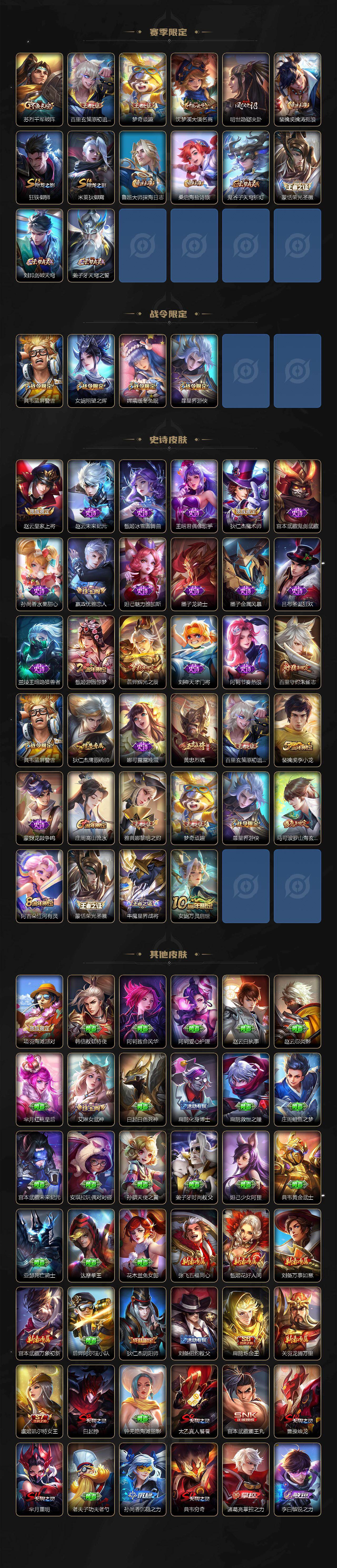 【赛季限定】:扁鹊炼金王,白起狰,芈月重明,曹操烛龙,典韦穷奇,狄仁杰万华元夜,达摩沙漠行僧,老夫子醍醐杖,程咬金演武夺筹,兰陵王金庭之子,张良古海寻踪,牛魔御旌,李元芳云中旅人,虞姬凯尔特女王,钟馗驱傩正仪,雅典娜黎明之约,太乙真人饕餮,鬼谷子原初探秘者,苏烈千军破阵,百里玄策原初追逐者,梦奇顽趣,沈梦溪大漠名商,明世隐疑决卦,裴擒虎擒涛扼浪,狂铁御狮,米莱狄御霄,鲁班大师探海日志,桑启海盐诗旅,鬼谷子天穹祈灯,蒙恬荣光圣徽,刘邦剑破天穹,姜子牙天穹之誓