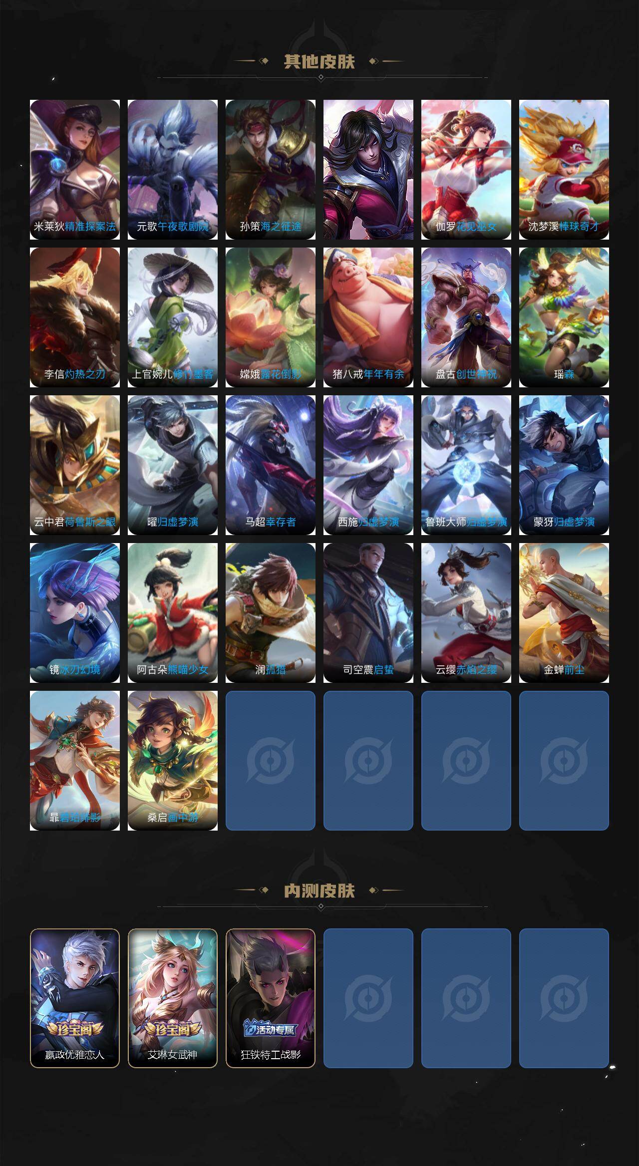 扁鹊炼金王,虞姬凯尔特女王,白起狰,太乙真人饕餮,曹操烛龙,芈月重明,典韦穷奇,狂铁御狮,米莱狄御霄,牛魔御旌,明世隐疑决卦,老夫子醍醐杖,鬼谷子原初探秘者,狄仁杰万华元夜,程咬金演武夺筹,钟馗驱傩正仪,苏烈千军破阵,女娲朔望之晖,典韦蓝屏警告,达摩沙漠行僧,兰陵王金庭之子,沈梦溪大漠名商,李元芳云中旅人,桑启海盐诗旅,裴擒虎擒涛扼浪,鲁班大师探海日志,张良古海寻踪