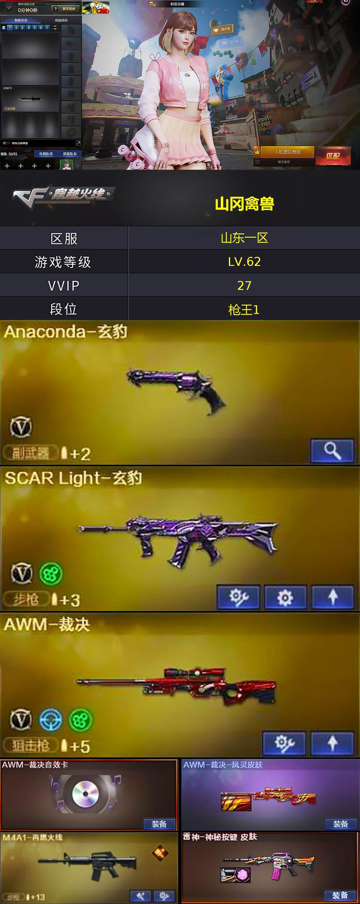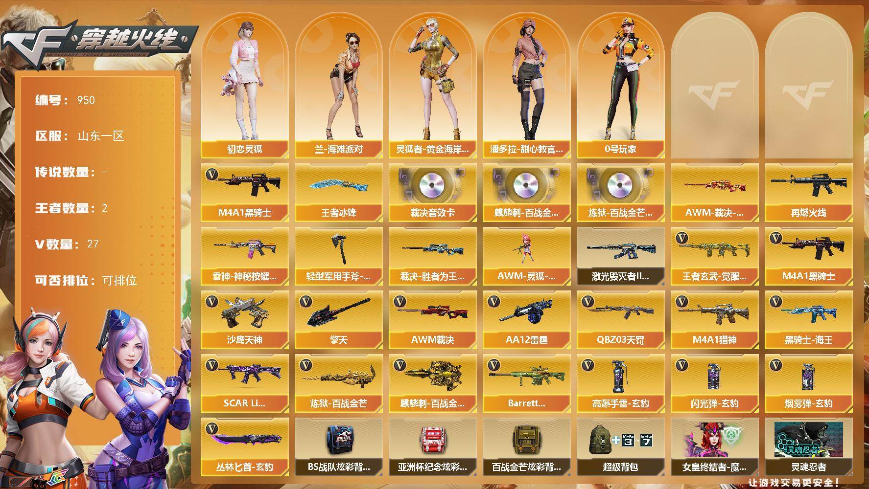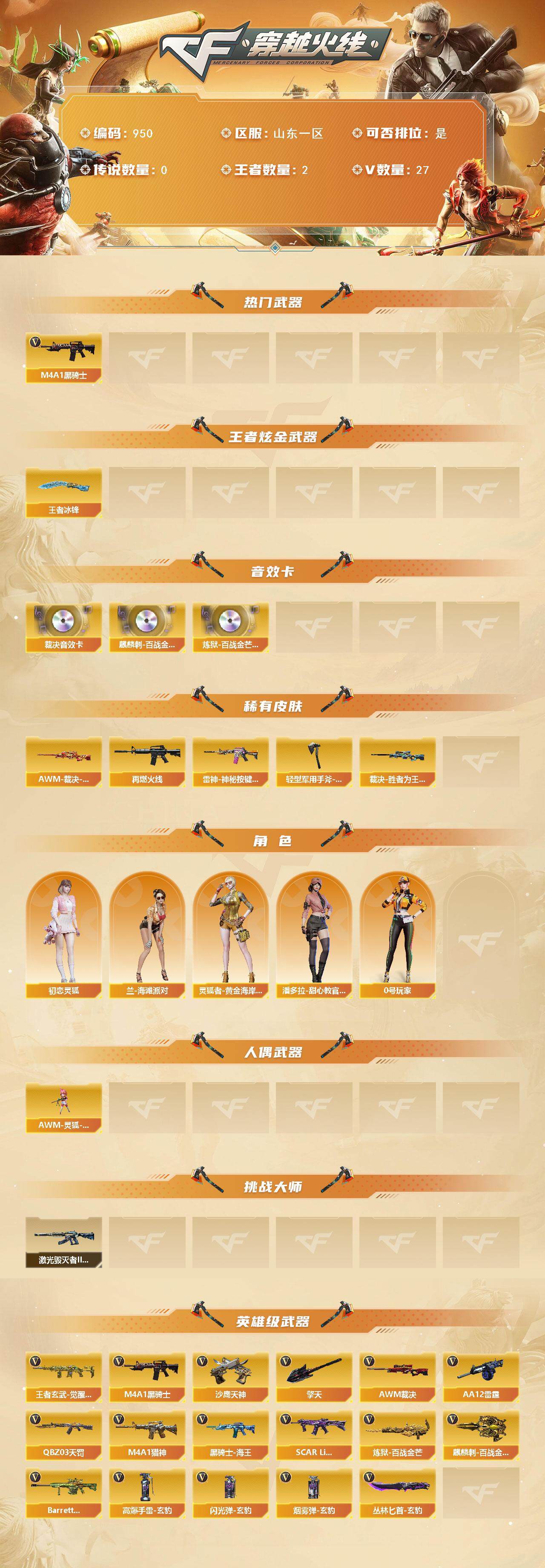 [14611881]山东一区-27V-2王者-0炫金 【热门武器】:M4A1-黑骑士 【王者炫金武器】:王者冰锋 【音效卡】:AWM-裁决音效卡,麒麟刺-百战金芒-盛典舞曲音效卡,炼狱-百战金芒-庆典舞曲音效卡 【皮肤】:AWM-裁决-凤灵皮肤,裁决-胜者为王 皮肤,M4A1-再燃火线,雷神-神秘按键 皮肤,轻型军用手斧-再燃火线 【角色】:初恋灵狐,兰-海滩派对,0号玩家,灵狐者-黄金海岸,潘多拉-甜心教官 【人偶武器】:AWM-灵狐-15周年嘉年华 【挑战大师】:激光毁灭者III-白马银枪 【英雄级武器】:M4A1-黑骑士,QBZ03-天罚,SCAR Light-玄豹,M4A1-猎神,黑骑士-海王,王者玄武-觉醒版,AWM-裁决,炼狱-百战金芒,AA-12-雷霆,沙鹰-天神*3,Anaconda-玄豹,擎天,麒麟刺-百战金芒,丛林匕首-玄豹,高爆手雷-玄豹*2,闪光弹-玄豹*3,烟雾弹-玄豹*2,Barrett-碧霄极光 【道具】:BS战队炫彩背包,亚洲杯纪念炫彩背包,百战金芒炫彩背包,超级背包,女皇终结者-魔龙之吻,灵魂忍者,妖姬,迷雾幽灵,夺命之镰,防化服*3,流光-鎏金之域,语音特效-盛典烟火,萌萌小葵表情,防弹头盔,防弹衣,C4工具钳,手雷包 【特殊枪械】:1黑骑士