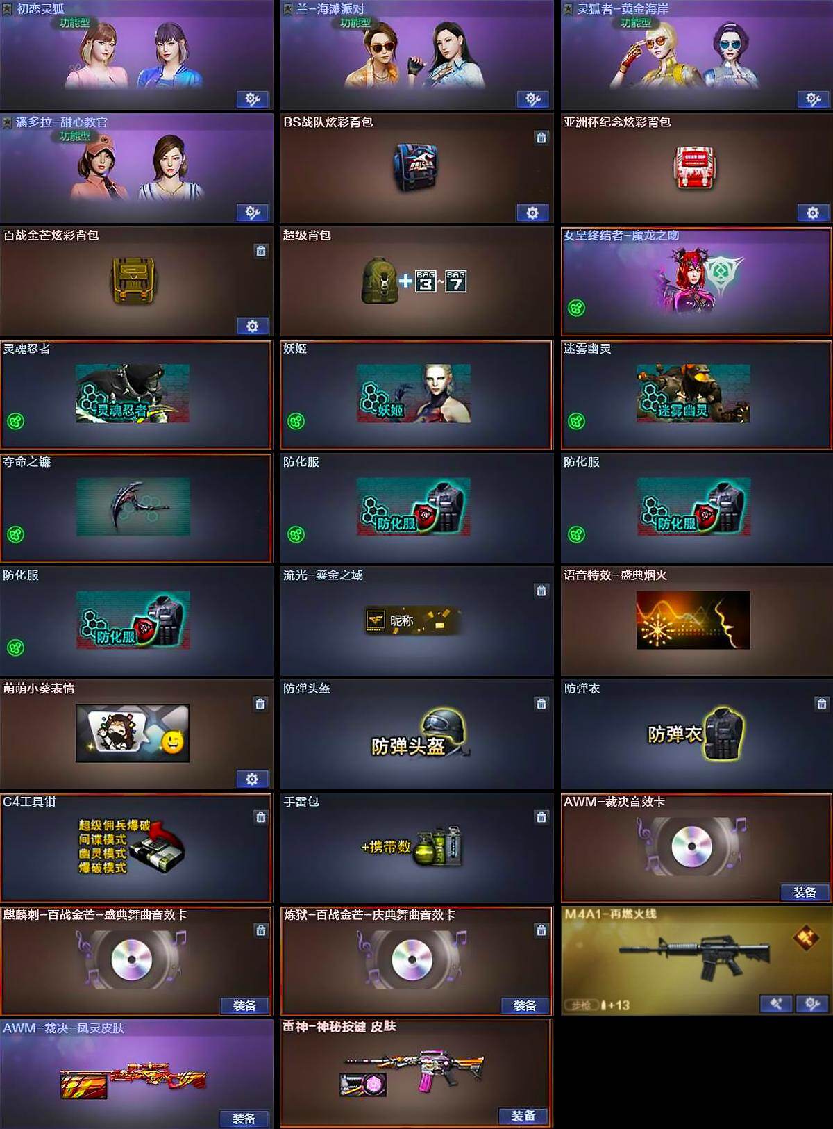 【道具】:BS战队炫彩背包,亚洲杯纪念炫彩背包,百战金芒炫彩背包,超级背包,女皇终结者-魔龙之吻,灵魂忍者,妖姬,迷雾幽灵,夺命之镰,防化服*3,流光-鎏金之域,语音特效-盛典烟火,萌萌小葵表情,防弹头盔,防弹衣,C4工具钳,手雷包