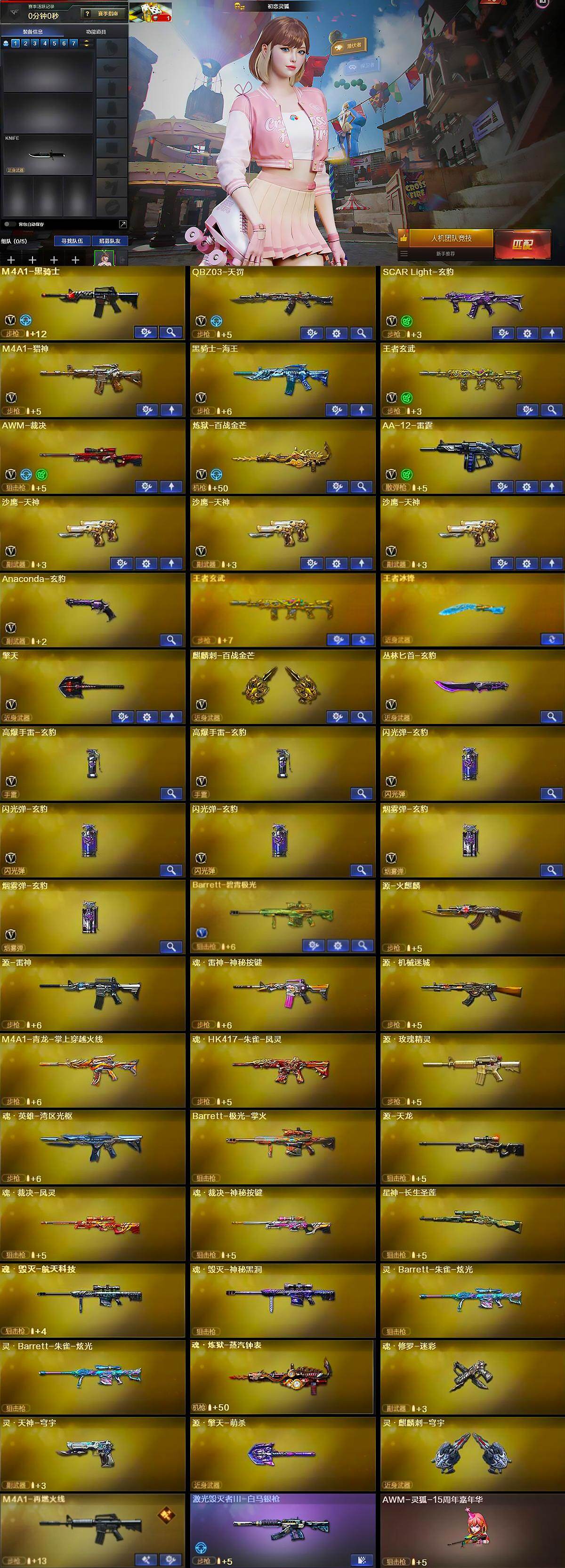 【英雄级武器】:M4A1-黑骑士,QBZ03-天罚,SCAR Light-玄豹,M4A1-猎神,黑骑士-海王,王者玄武-觉醒版,AWM-裁决,炼狱-百战金芒,AA-12-雷霆,沙鹰-天神*3,Anaconda-玄豹,擎天,麒麟刺-百战金芒,丛林匕首-玄豹,高爆手雷-玄豹*2,闪光弹-玄豹*3,烟雾弹-玄豹*2,Barrett-碧霄极光