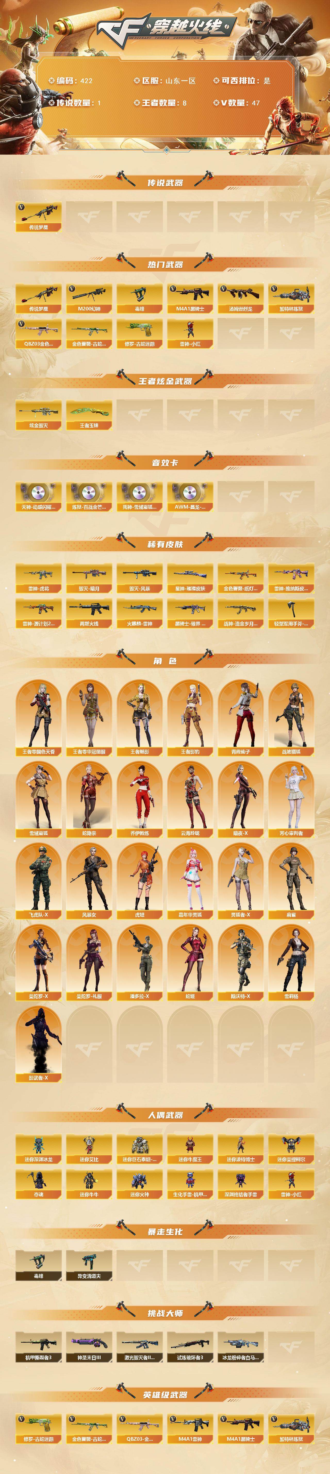[14612077]山东一区-47V-8王者-1炫金 【传说武器】:传说梦魇 【热门武器】:传说梦魇,QBZ03-金色蔷薇,M200-幻神,金色蔷薇-古蛇迷踪,修罗-古蛇迷踪,毒蜂,M4A1-黑骑士,汤姆逊-烈龙*3,加特林-炼狱,雷神-小红 【王者炫金武器】:王者玉锋,炫金毁灭 【音效卡】:天神-动感闪耀 音效卡,炼狱-百战金芒-庆典舞曲音效卡,死神-雪域霜狐-怀旧音效卡,AWM-昌龙-怀旧音效卡 【皮肤】:金色蔷薇-纸灯龙皮肤,星神-璀璨皮肤,雷神-虎将,雷神-维纳斯皮肤,雷神-源计划2.0专属 皮肤,M4A1-再燃火线,火麒麟-雷神,毁灭-暗月,毁灭-风暴,黑骑士-破界 皮肤,战神-流金岁月皮肤,轻型军用手斧-再燃火线 【角色】:战地猎狐,王者零-华冠丽服,王者-零-国色天香,王者-魅影,王者影豹,雪域霜狐,蛇隐宗,乔伊教练,云海玲珑,暗夜-X,芳心审判者,飞虎队-X,风暴女*2,虎妞,嘉年华灵狐,灵狐者-X,麻雀,曼陀罗-X,曼陀罗-礼服,潘多拉-X,青霞仙子,蛇姬,斯沃特-X,雪莉杨,影武者-X 【人偶武器】:雷神-小红,迷你深渊冰龙,迷你牛魔王,迷你波特博士*2,迷你曼提柯尔*2,夺魂,迷你牛牛,迷你火种,生化手雷-机甲核心,深渊终结者手雷,迷你艾比,迷你巨石泰坦-魔花研究所 【暴走生化】:毒蜂,异变清道夫 【挑战大师】:冰龙粉碎者-白马银枪,激光毁灭者III-白马银枪*2,机甲撕裂者III,试炼破坏者III,神圣爆裂者-末日III 【英雄级武器】:AK47-火麒麟,M4A1-雷神*3,M4A1-黑骑士,无影-神兵利器,黑武士-锦绣游龙,金色蔷薇-古蛇迷踪,死神-雪域霜狐,QBZ03-金色蔷薇,烈火-动感闪耀,AK-47-猩红传说,黑骑士-海王,王者白虎-觉醒版,AWM-天龙,Barrett-毁灭,AWM-裁决,M200-幻神,加特林-炼狱,炼狱-百战金芒,汤姆逊-烈龙*3,烈龙-云海游龙,沙鹰-天神,天神-动感闪耀,修罗-古蛇迷踪,擎天,麒麟刺,屠龙-动感闪耀,擎天-云海游龙,麒麟刺-百战金芒,王者之啸-觉醒版,高爆手雷-幻灵,高爆手雷-神工天巧,手雷-动感闪耀,高爆手雷-云龙,手雷-云海游龙,高爆手雷-古蛇迷踪,闪光弹-雷霆,闪光弹-神工天巧,闪光弹-云龙,烟雾弹-幻灵,烟雾弹-云龙,烟雾弹-古蛇迷踪,M4A1-赤狱骑士,M4A1-苍鸣雷神,AWM-昌龙,Barret