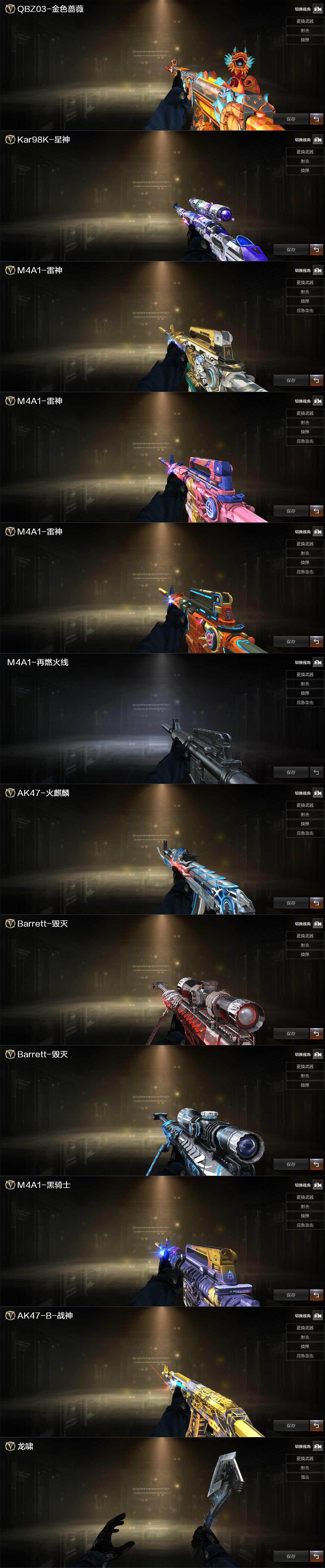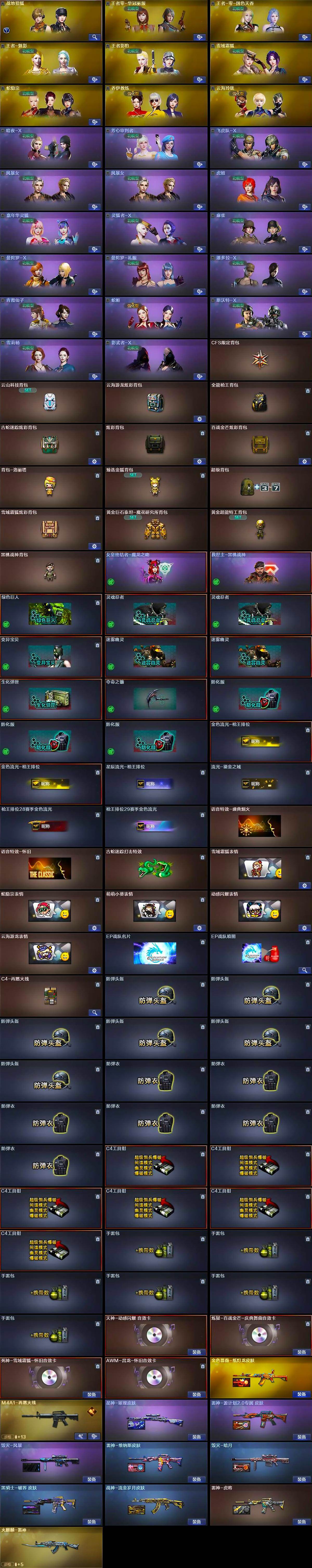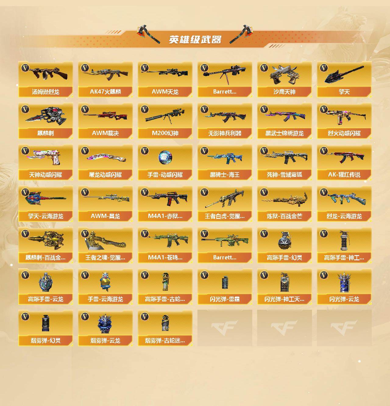 【英雄级武器】:AK47-火麒麟,M4A1-雷神*3,M4A1-黑骑士,无影-神兵利器,黑武士-锦绣游龙,金色蔷薇-古蛇迷踪,死神-雪域霜狐,QBZ03-金色蔷薇,烈火-动感闪耀,AK-47-猩红传说,黑骑士-海王,王者白虎-觉醒版,AWM-天龙,Barrett-毁灭,AWM-裁决,M200-幻神,加特林-炼狱,炼狱-百战金芒,汤姆逊-烈龙*3,烈龙-云海游龙,沙鹰-天神,天神-动感闪耀,修罗-古蛇迷踪,擎天,麒麟刺,屠龙-动感闪耀,擎天-云海游龙,麒麟刺-百战金芒,王者之啸-觉醒版,高爆手雷-幻灵,高爆手雷-神工天巧,手雷-动感闪耀,高爆手雷-云龙,手雷-云海游龙,高爆手雷-古蛇迷踪,闪光弹-雷霆,闪光弹-神工天巧,闪光弹-云龙,烟雾弹-幻灵,烟雾弹-云龙,烟雾弹-古蛇迷踪,M4A1-赤狱骑士,M4A1-苍鸣雷神,AWM-昌龙,Barret