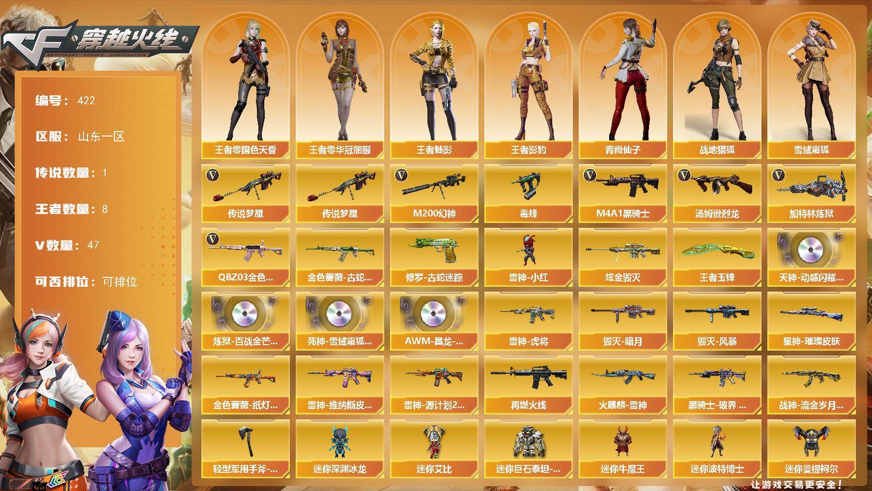 - [15247880]广西一区-41V-6王者-3炫金 【传说角色】:传说星骇 【热门武器】:QBZ03-金色蔷薇,M200-幻神,死亡之眼,C.A.T,M4A1-黑骑士,加特林-炼狱,羊驼玩偶*2 【王者炫金武器】:超新星-悦享,王者凌虎,炫金骑士,炫金毁灭,炫金天龙 【音效卡】:M4A1-黑骑士音效卡,Barrett-毁灭音效卡,AWM-裁决音效卡,Barrett-碧霄极光音效卡,炼狱-百战金芒-庆典舞曲音效卡 【皮肤】:AWM-裁决-凤灵皮肤,裁决-运输船 皮肤,裁决-胜者为王 皮肤,雷神-暗月,雷神-耀金皮肤,雷神-宇航兔皮肤,雷神-源计划2.0专属 皮肤,M4A1-再燃火线,雷神-神秘按键 皮肤,火麒麟-平天大圣,火麒麟-百城,毁灭-暗月,毁灭-荣耀之怒,毁灭-航天科技皮肤,毁灭-虹光风暴 皮肤,毁灭-英雄计划 皮肤,M4A1-千变-孔明皮肤,黑骑士-暗月,无影耀金皮肤,战神-紫绶金章皮肤*2,战神-流金岁月皮肤,屠龙-春桃 皮肤,屠龙-巅峰荣耀 皮肤,龙啸-巅峰荣耀 皮肤,轻型军用手斧-再燃火线 【角色】:樱,荒漠琉璃,战地猎狐,奇洋探员,乔伊教练,修道士,云海玲珑,暗夜-X,初恋灵狐,娟娟,兰-海滩派对,兰妹妹,灵狐者-X,灵狐者-黄金海岸,灵狐者-七夕宝贝,龙儿-小淘气,麻雀,曼陀罗-X,潘多拉-甜心教官,斯沃特-X,蜀雪,铁骑荣耀,兔囡囡,维纳斯,新娜塔莎,雪莉杨,雪莉杨-摸金校尉,影武者-X 【人偶武器】:迷你救赎猎手,AWM-灵狐-15周年嘉年华,C.A.T,迷你裂空之翼*2,迷你波特博士,迷你牛牛*2,迷你火种,生化手雷-机甲核心*2,迷你深渊冰龙-王绿豆 【暴走生化】:死亡之眼,超级对讲机 【挑战大师】:冰龙粉碎者-白马银枪,激光毁灭者III-白马银枪,VEPR-12-金魔*2,激光毁灭者III,机甲撕裂者III,试炼破坏者III,阐释者III*2 【英雄级武器】:AK47-火麒麟,M4A1-黑龙,M4A1-雷神,M4A1-黑骑士,AK47-黑武士,QBZ03-独角-III,QBZ03-金色蔷薇,王者之魄-觉醒版,AK-47-猩红传说*2,黑骑士-海王,Barrett-毁灭,AWM-裁决,M200-幻神,Barrett-金色蔷薇*2,加特林-炼狱,炼狱-百战金芒,烈龙-悦心-觉醒版,AA-12-雷霆,屠龙*2,龙啸,麒麟刺-百战金芒,王者之锋-觉醒版,丛林匕首